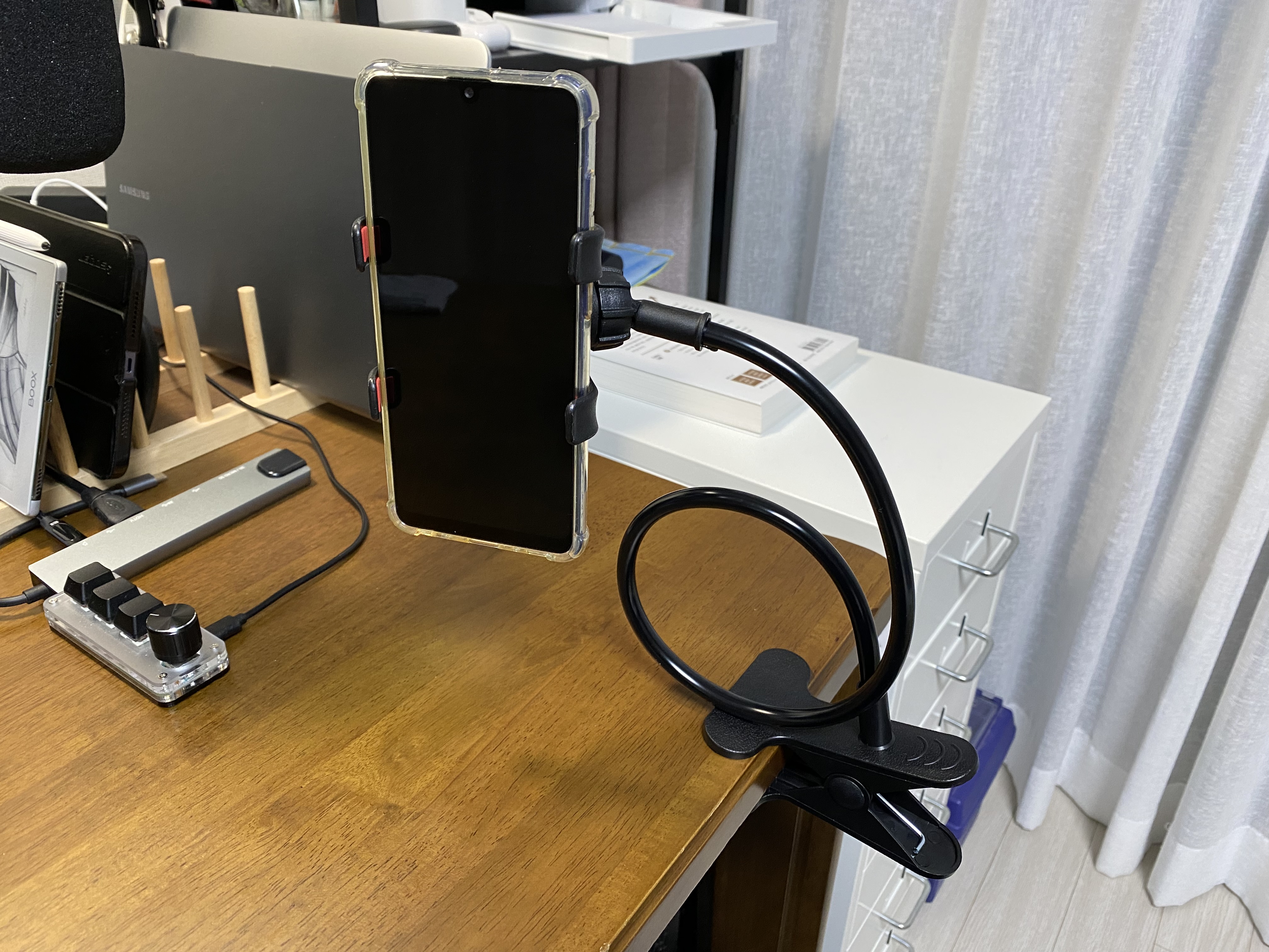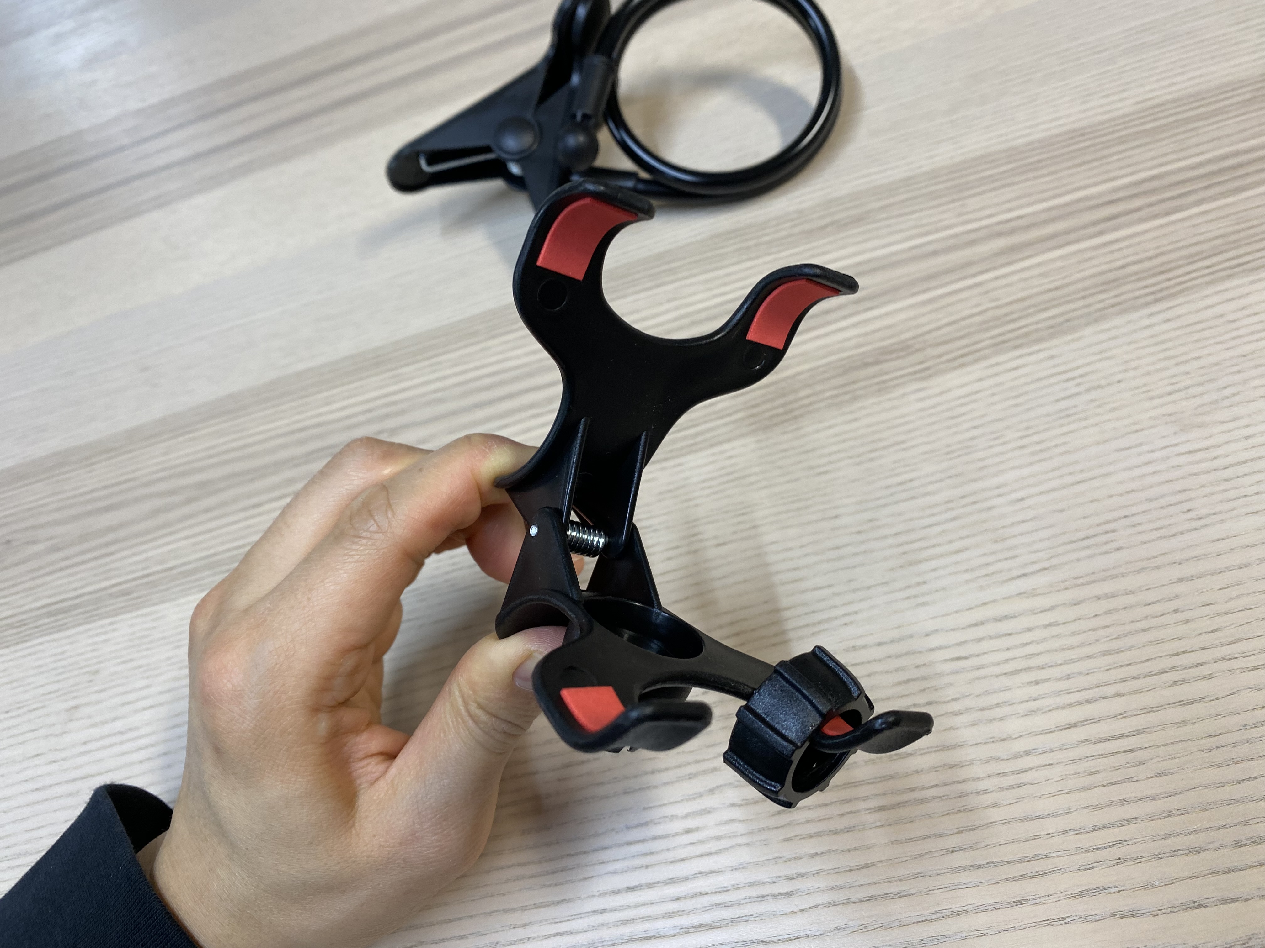 집게로 고정해서 사용하기 너무 어려울 것 같아 그냥 위 사진처럼 써야 할 것 같습니다. 그래도 와이어로 된 관절 부분은 한번 휘면 잘 고정되어 있어서 그나마 다행입니다. 근데 사실 이렇게 쓸 거치대가 이미 많아서 아마도 창고로 직행할 것 같은 느낌이 듭니다.