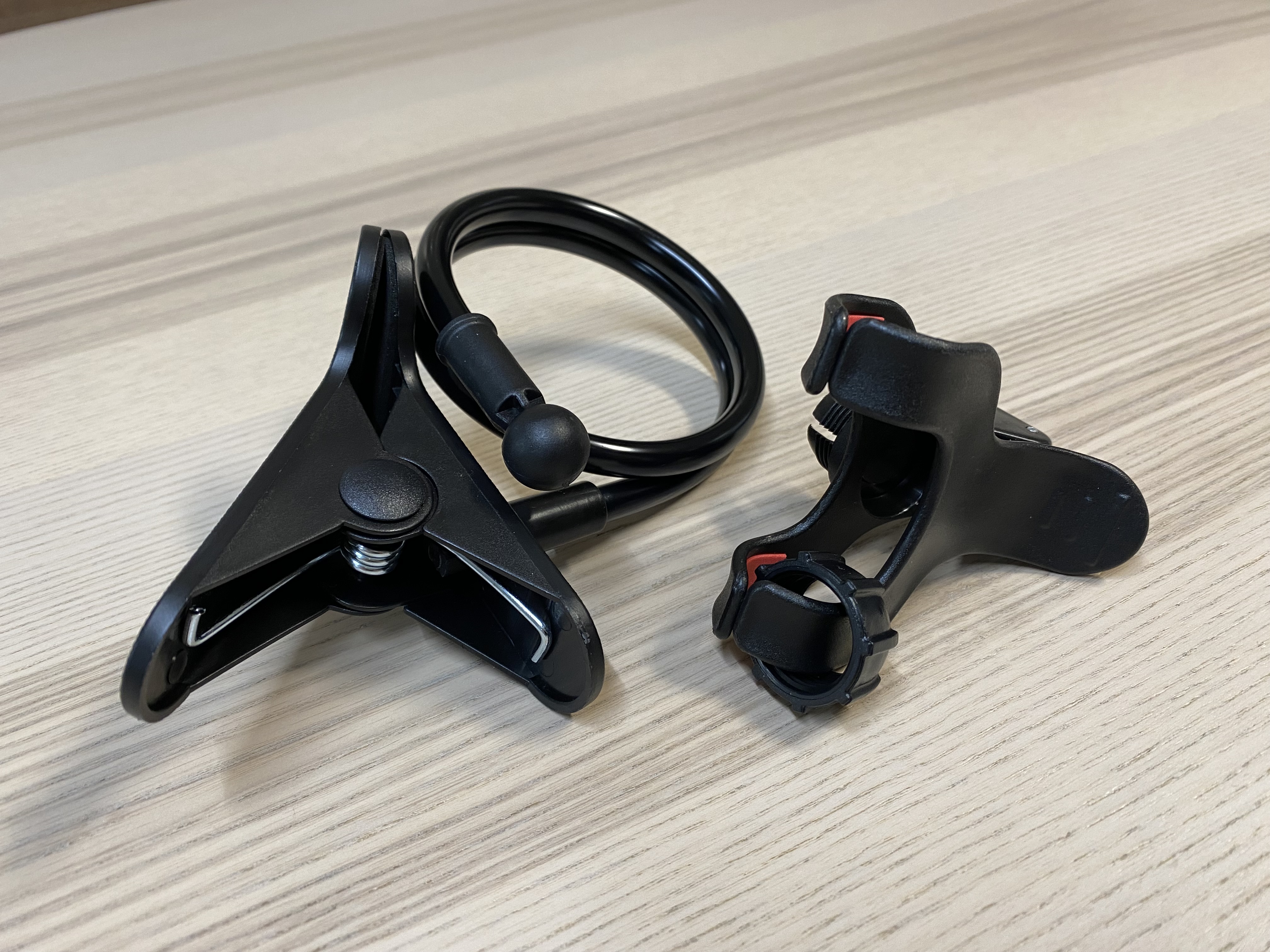 알리 스마트폰 자바라 거치대를 개봉한 모습입니다. 두 부품을 연결해서 사용하면 됩니다. 알리에서 '범용 레이지 브래킷 휴대폰 거치대 구즈넥 스탠드 스텐트, 유연한 침대 책상 테이블 클립 브래킷, 스마트폰 거치대'라고 설명하는 제품입니다.