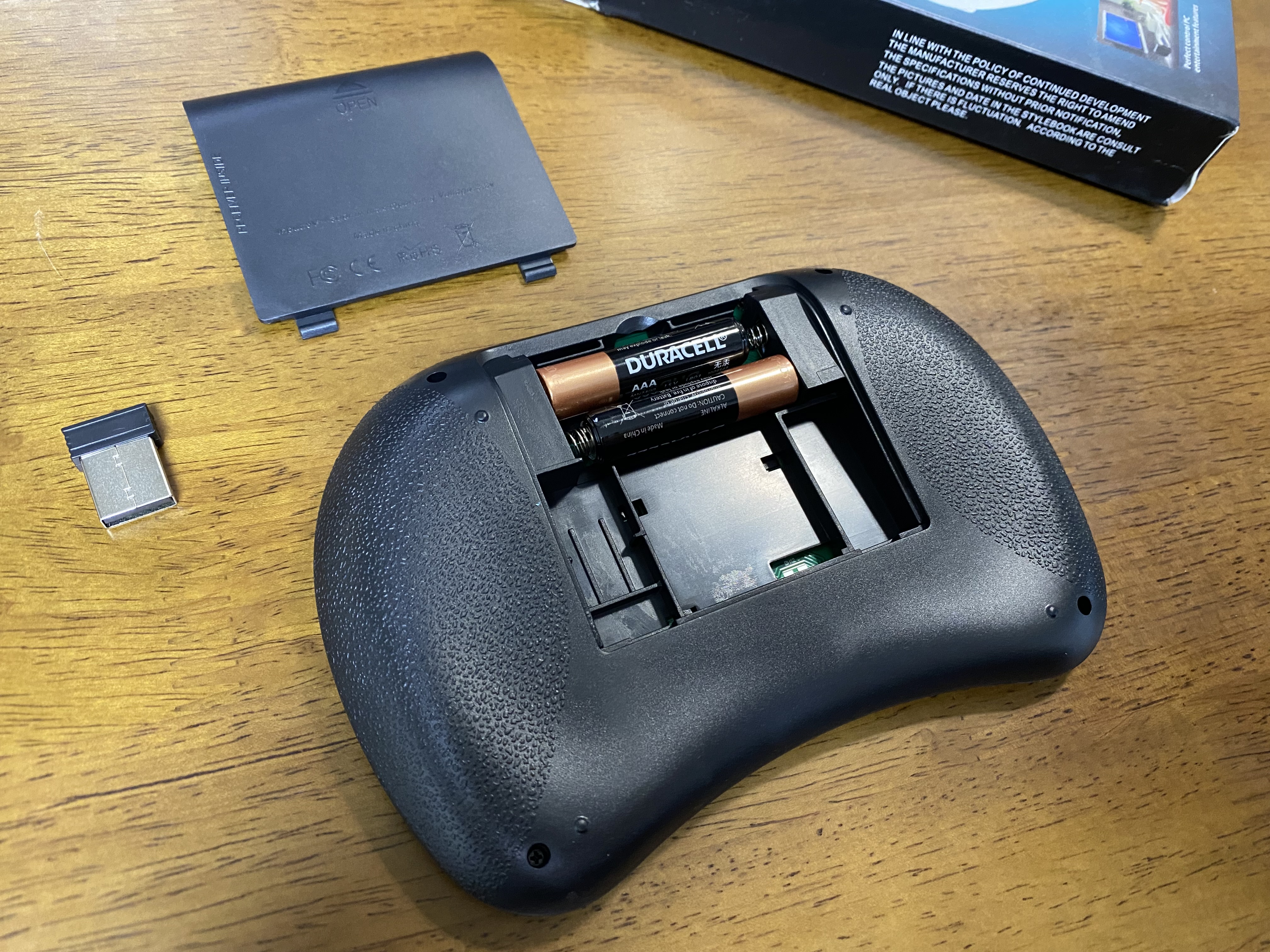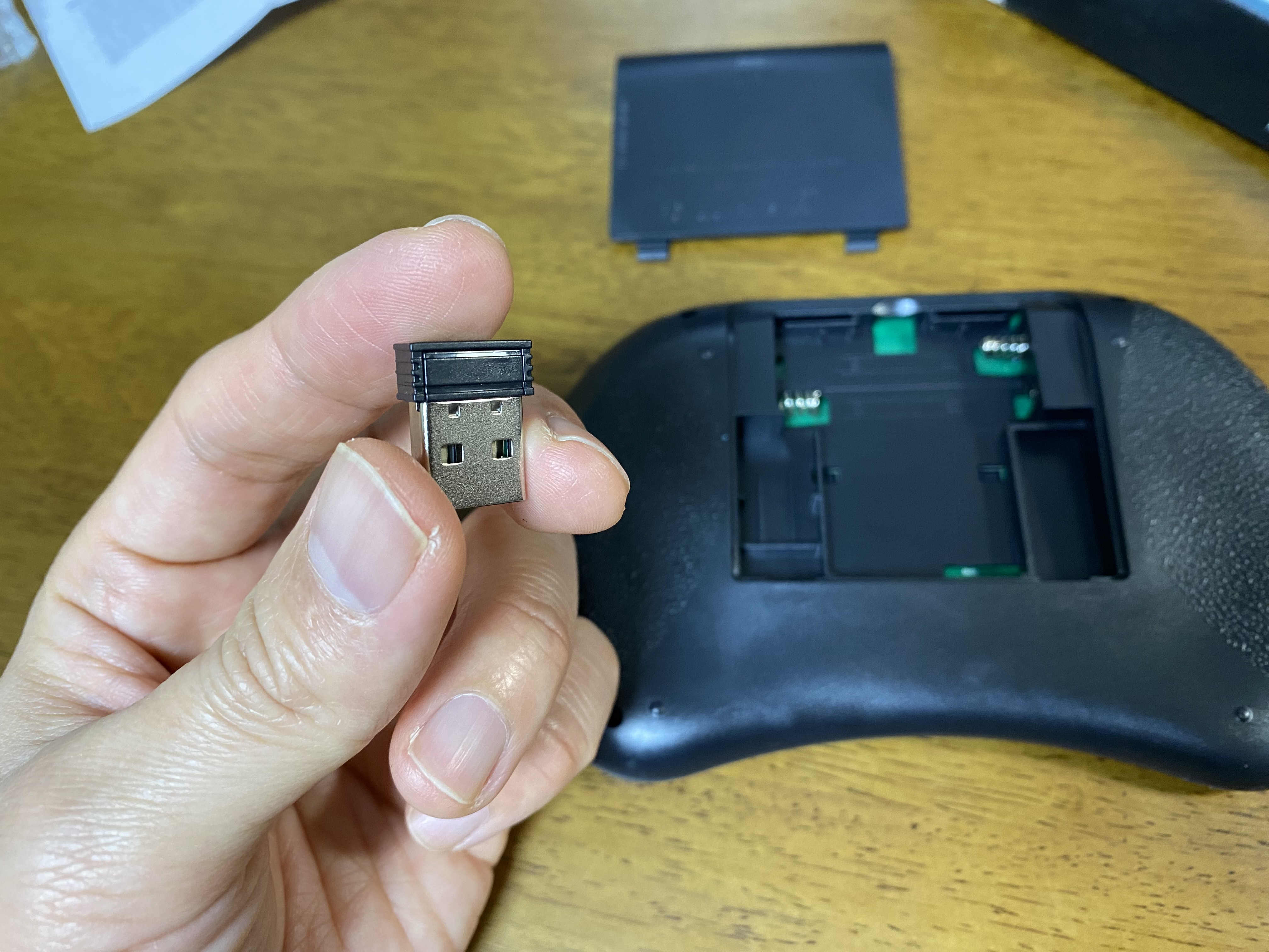 바닥에 배터리 넣은 부분을 열어보면 무선 연결 동글이 들어있습니다. 이걸 PC나 스마트 TV에 연결해서 무선 키보드를 사용하면 됩니다.