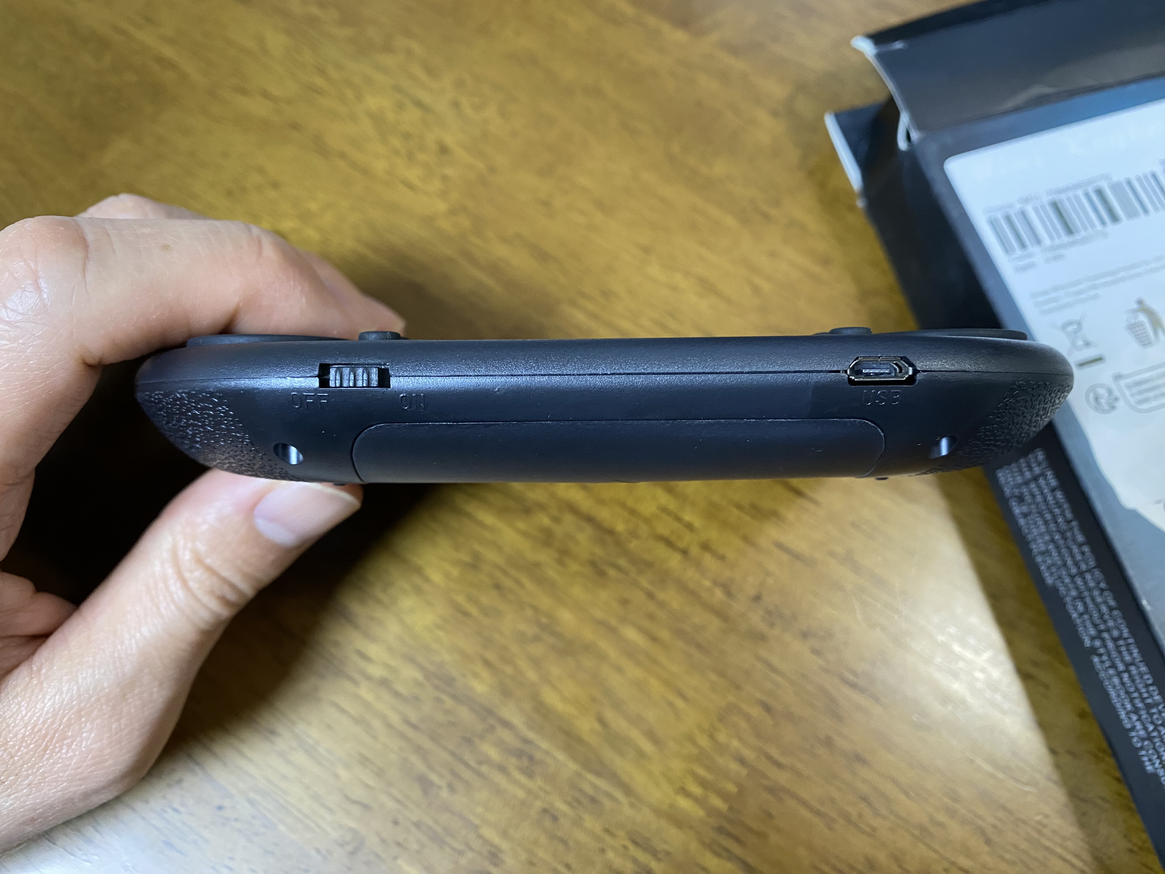 위쪽을 보면 전원을 켜는 버튼이 보입니다. 이 버튼도 너무너무 저렴해 보입니다. 금방 고장 날 것 같은 느낌이 듭니다. 케이블을 연결하는 부분도 있는데 USB C타입이 아닌 마이크로 5핀이네요. 개인적으로 마이크로 5핀 케이블 연결 방식을 정말 싫어하는데 다행히 이 제품은 보통 건전지를 이용하기 때문에 큰 문제는 없을 것 같습니다.