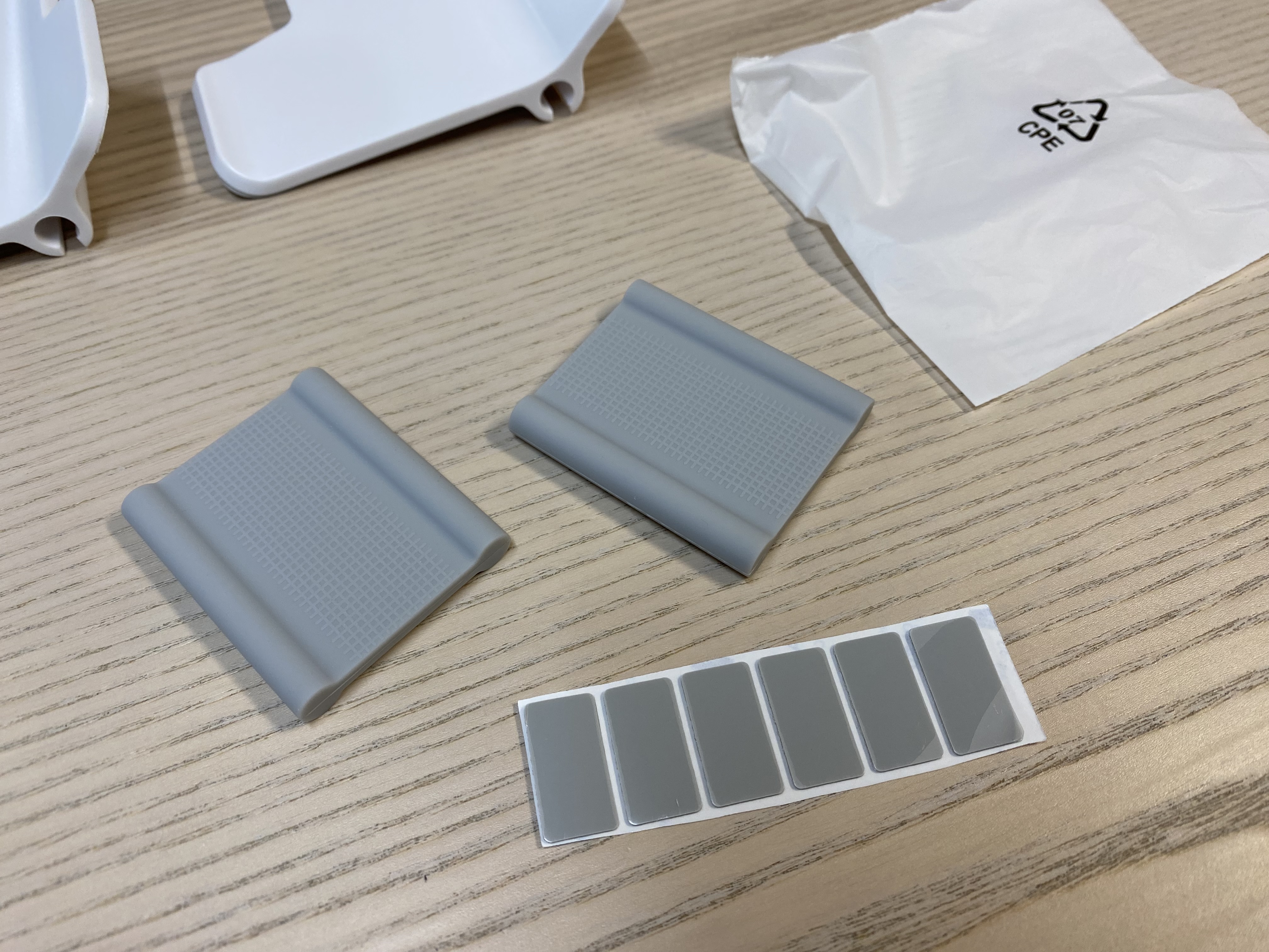 2개의 거치대 판을 중간에서 이어주는 고무 부품과 바닥에 붙이는 스티커가 들어있습니다.