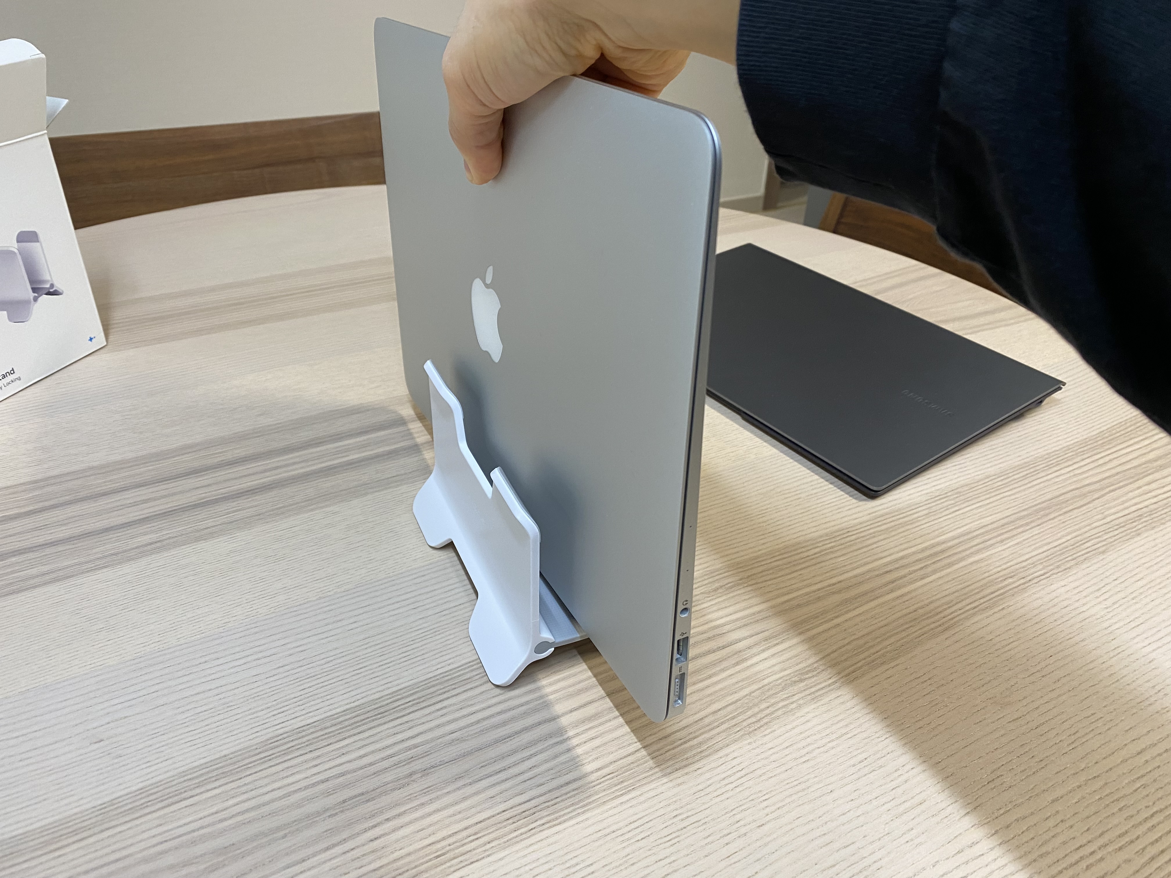 13인치 구형 맥북에어를 Hagibis 하기비스 수직 노트북 스탠드에 거치한 모습