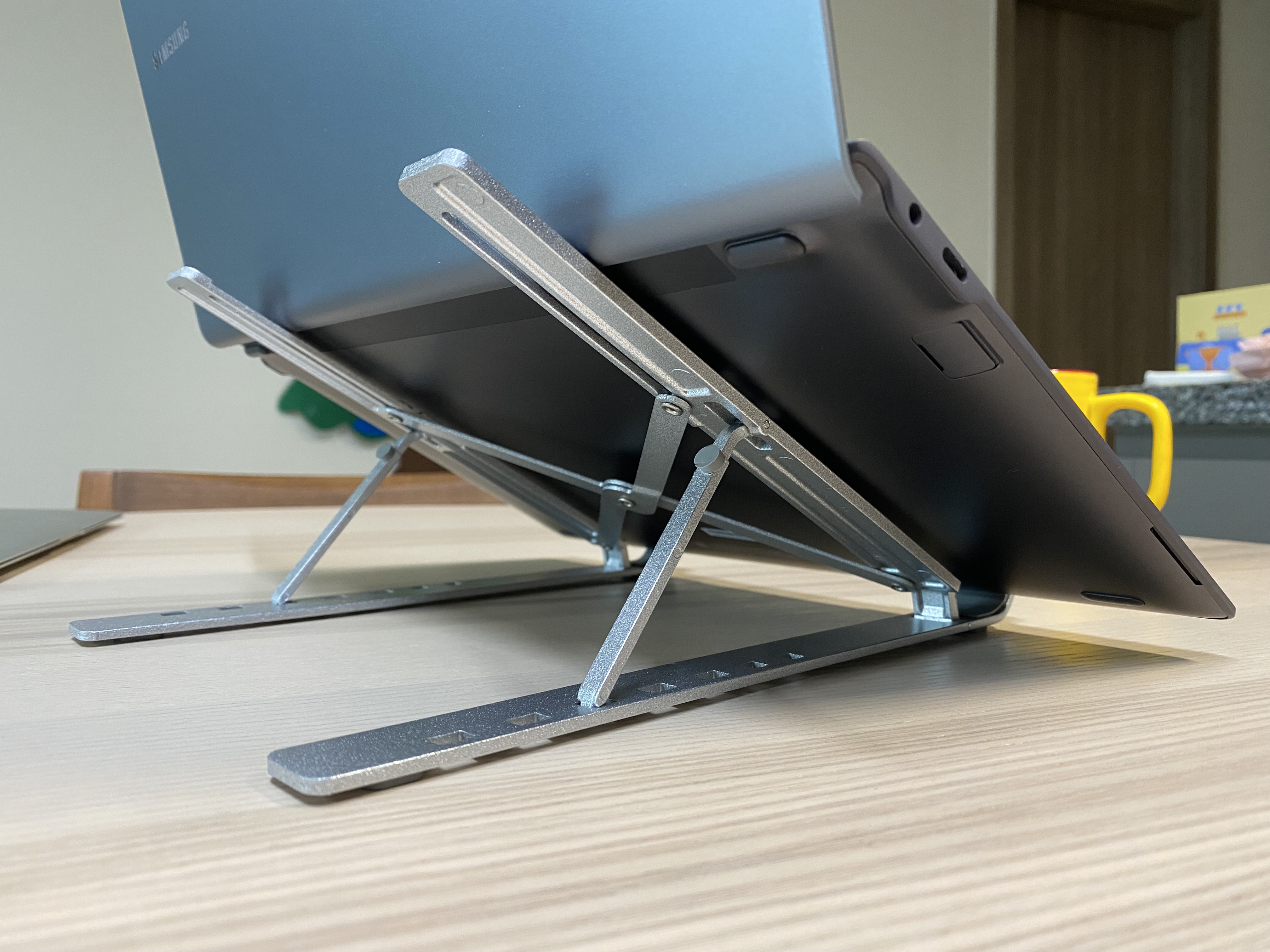 알리 휴대용 알루미늄 노트북 스탠드의 모습입니다. 휴대용이라 접었다 폈다 할 수 있습니다. 아무리 휴대용이라고는 하지만 금속으로 된 제품이라 약간의 무게는 있습니다. 다만 금속치고는 가볍다 생각합니다.