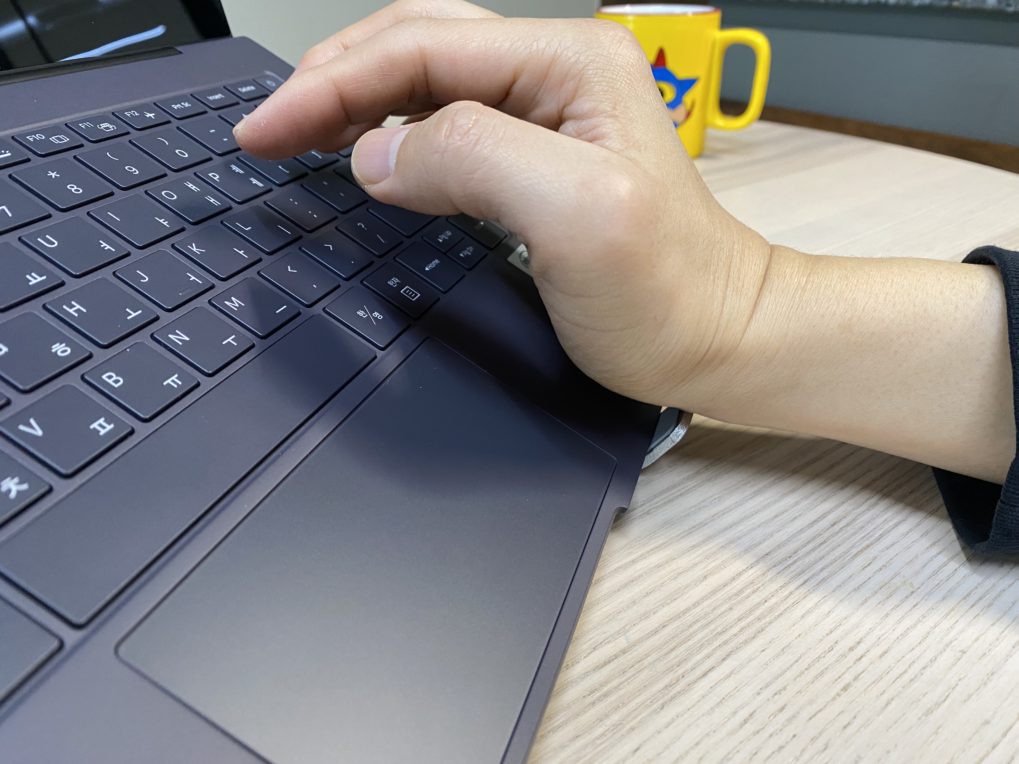 타이핑을 할 때 거치대 아래쪽이 손목에 닿는데 크게 불편하지는 않습니다. 이런 스타일의 휴대용 거치대가 다 이렇게 생겨서 그냥 그러려니 합니다.