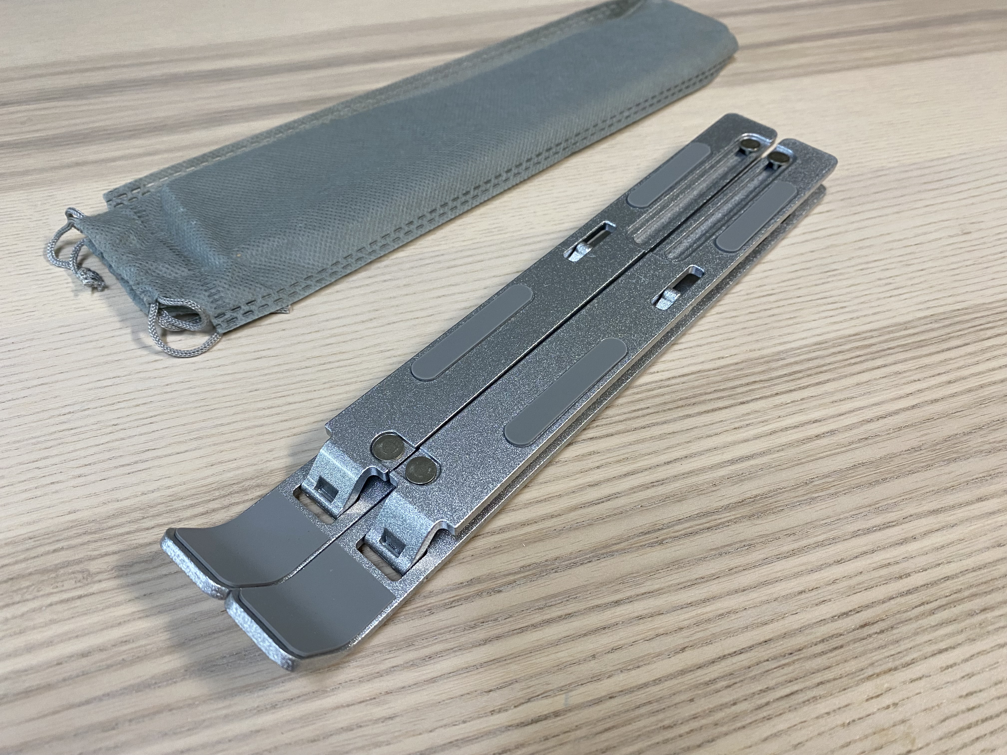 이 노트북 거치대는 알리미늄 합금으로 되어있고 천 가방에 들어있습니다.