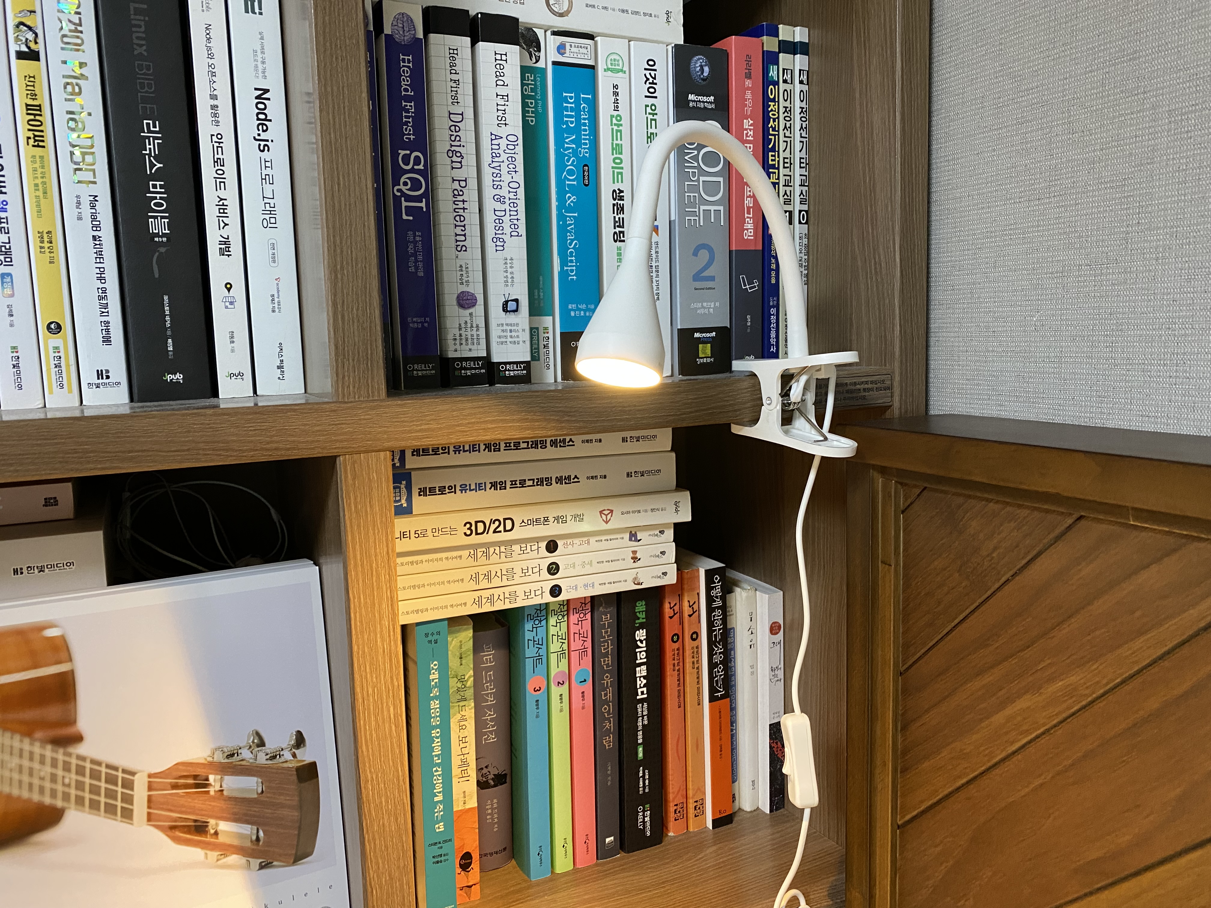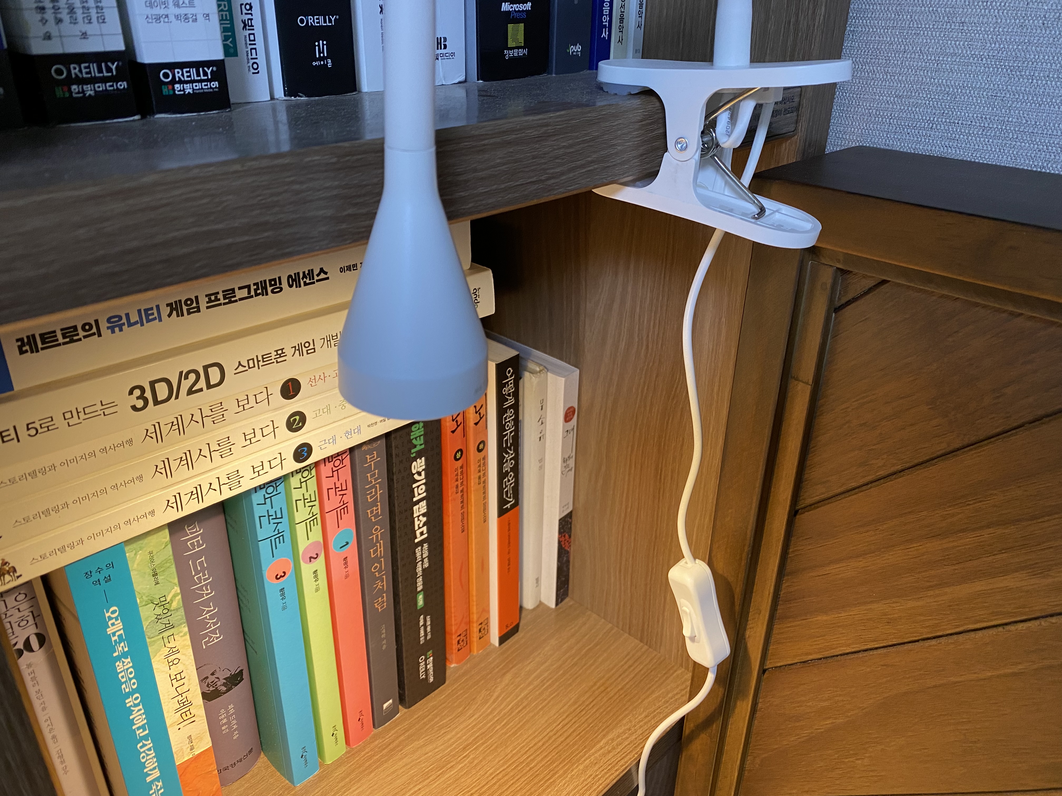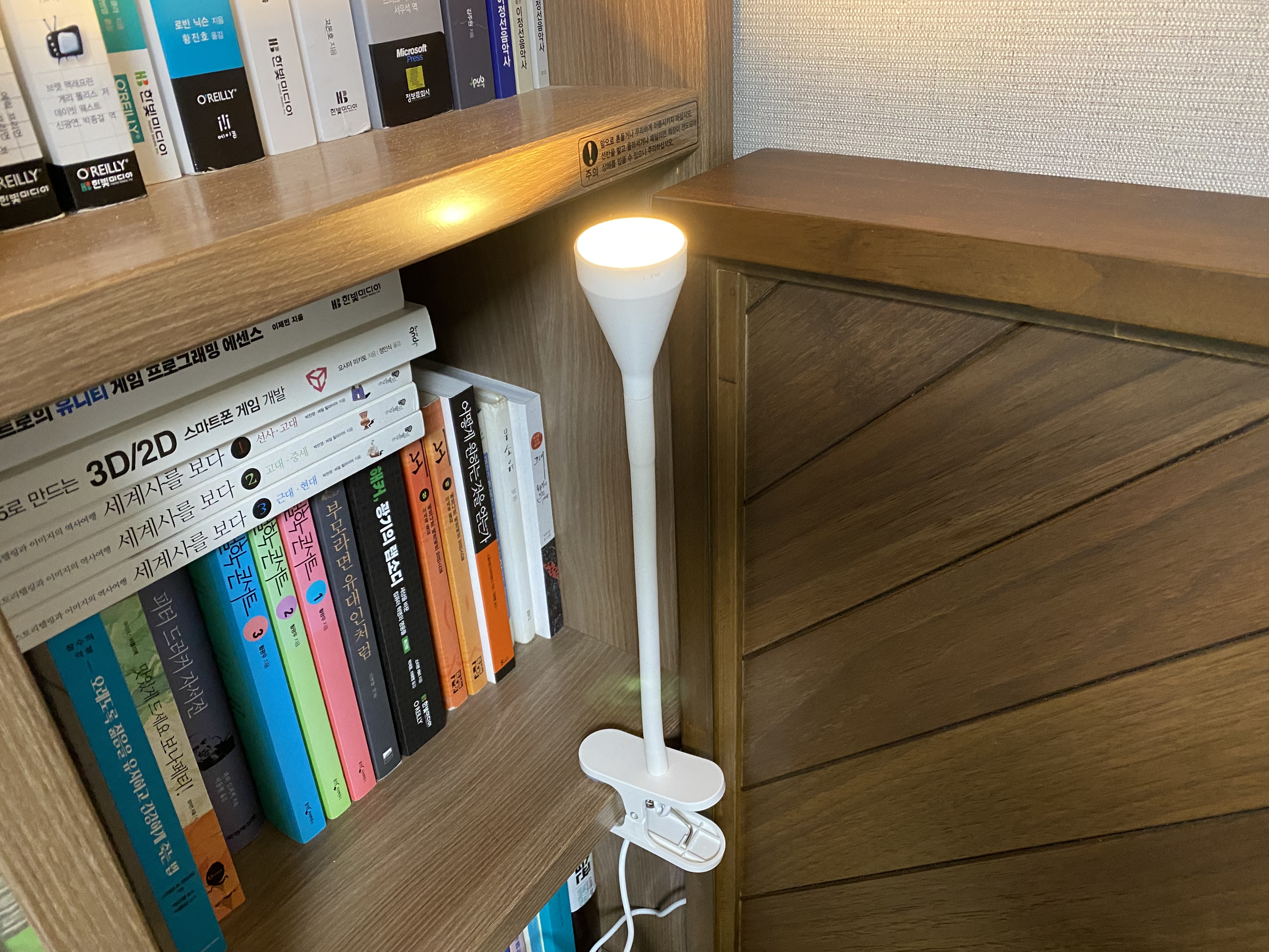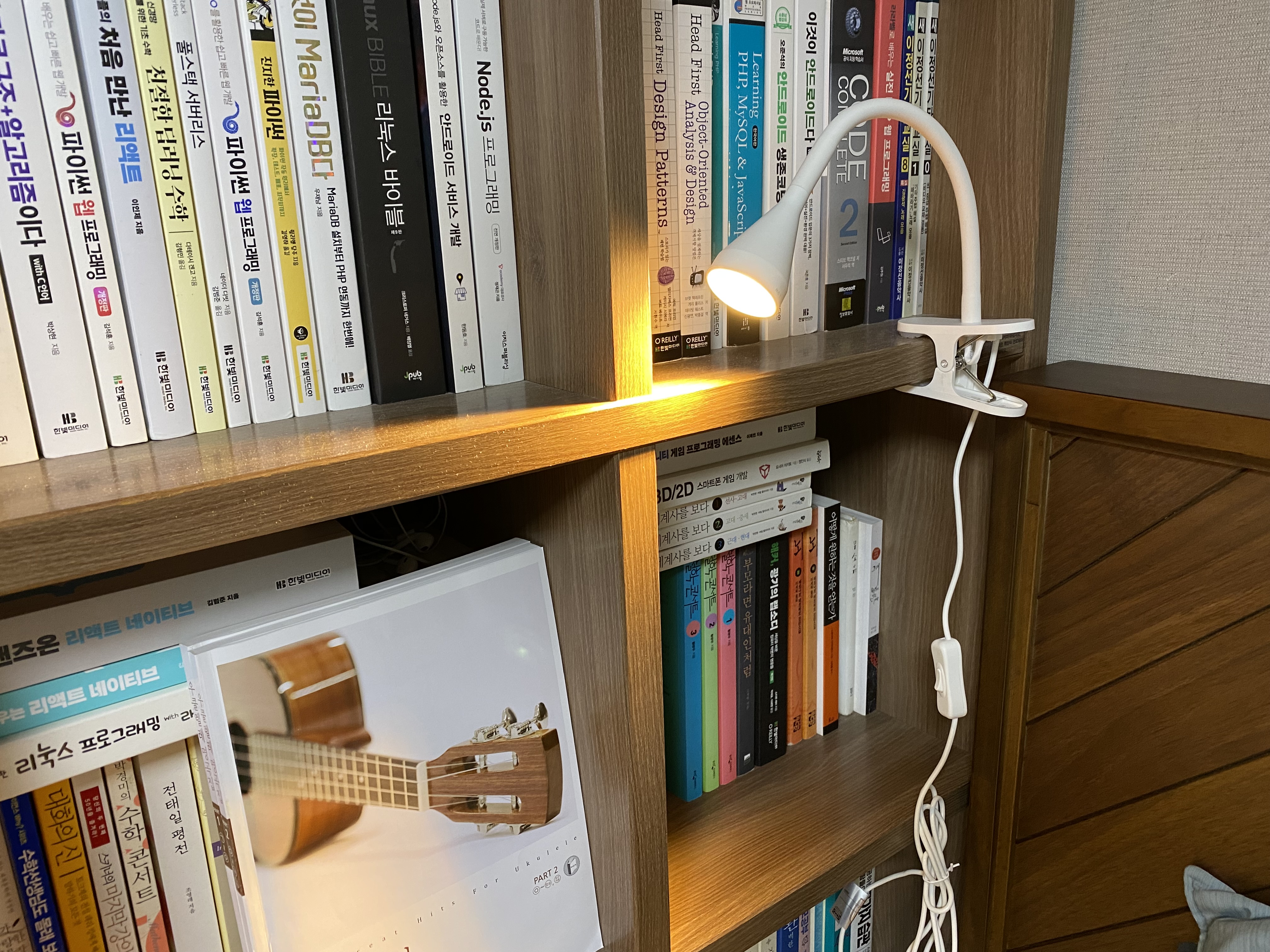 이케아 네블링에 LED 집게형 조명에 전원을 연결한 모습입니다. 빛이 생각보다 밝습니다. 침대에 누워 독서를 해볼까 싶어 구매를 했는데 바로 비추면 눈뽕이 심할 것 같아 벽이나 책장을 쏴서 간접 조명으로 사용해야 할 것 같습니다.