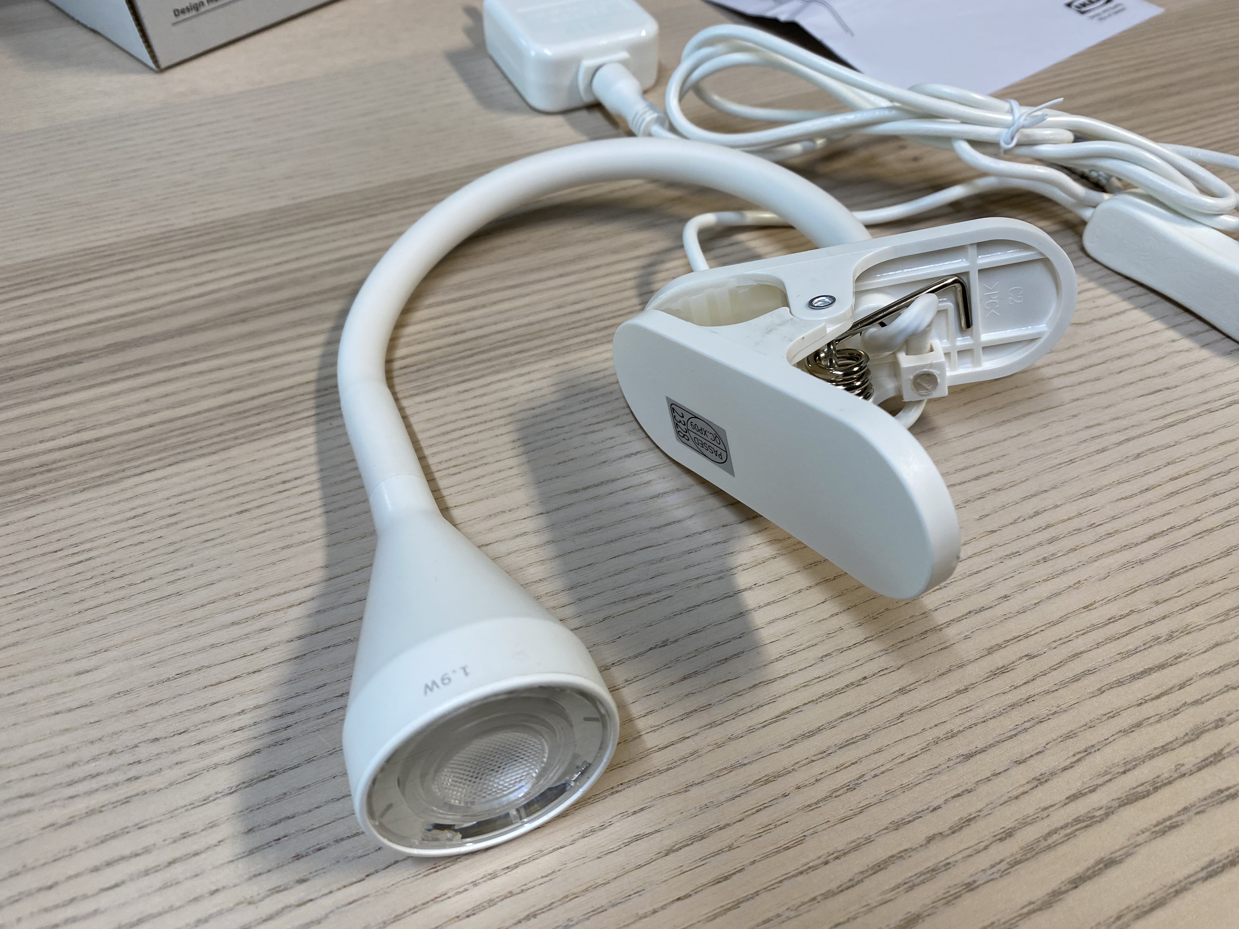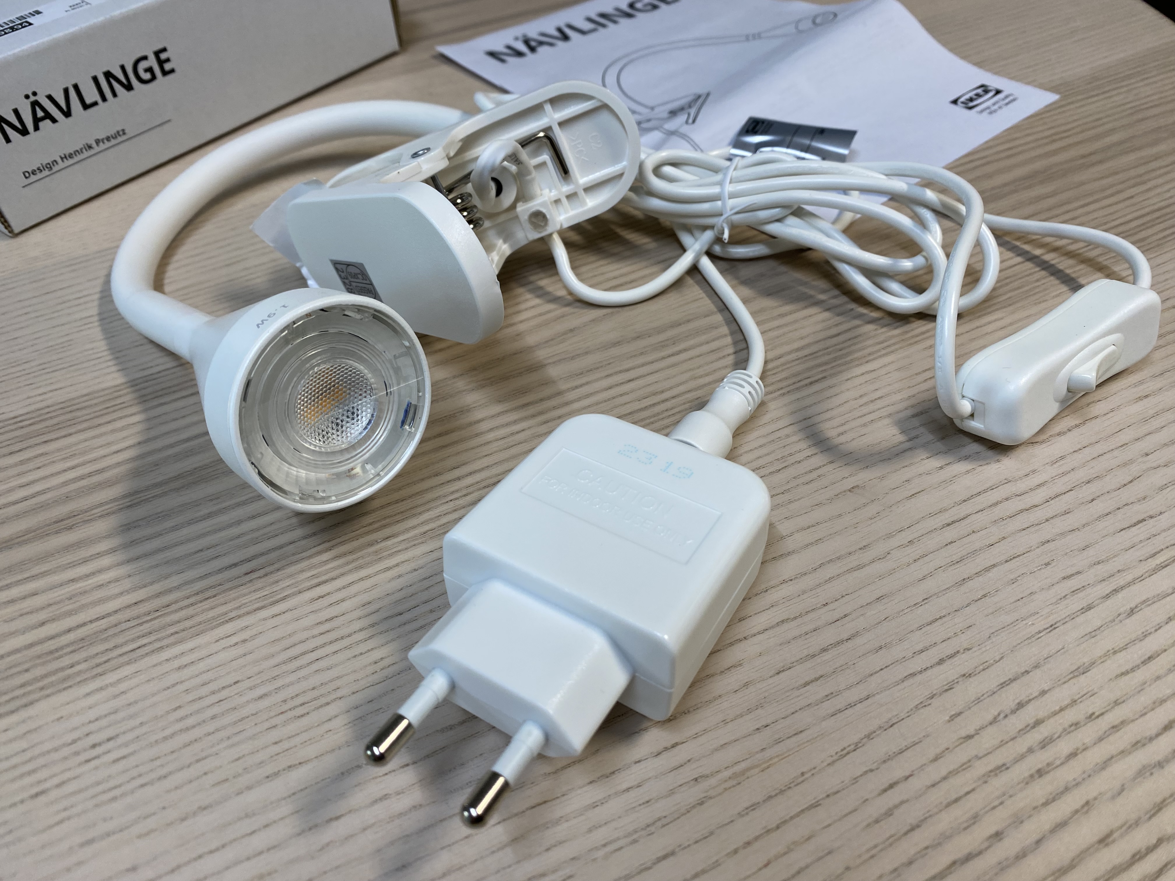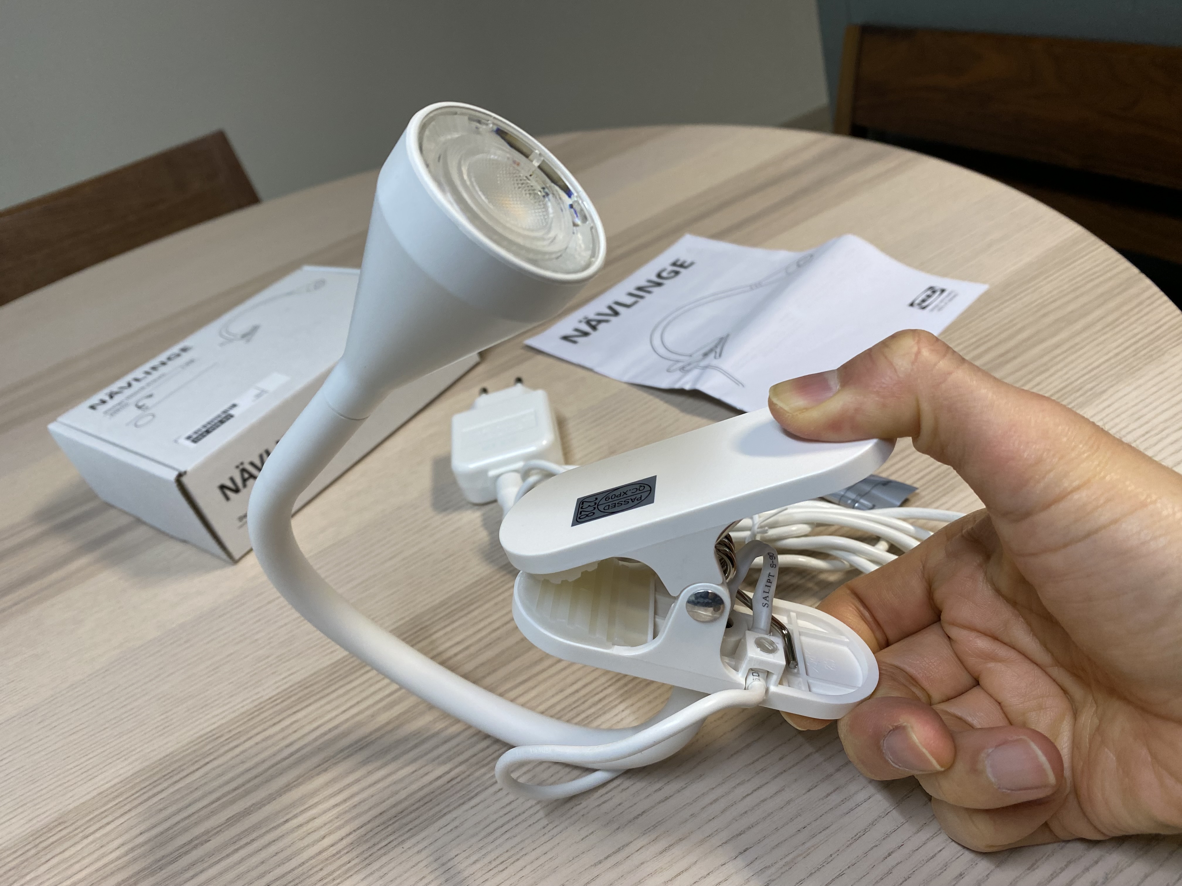 이케아 네블링에 LED 집게형 조명을 개봉했습니다. 간단한 제품이라 제품과 설명서만 들어있습니다. 건전지(배터리)가 필요없고 바로 전원을 연결해서 사용하면 됩니다. 색상은 화이트, 블랙이 있습니다. 보통 이렇게 생긴 조명을 이케아에서는 'NAVLINGE 네블링에'라고 구분을 하는데 집게 방식말고 다른 스타일의 조명이 있으니 궁금하다면 이케아 홈페이지에서 검색을 해보면 됩니다.