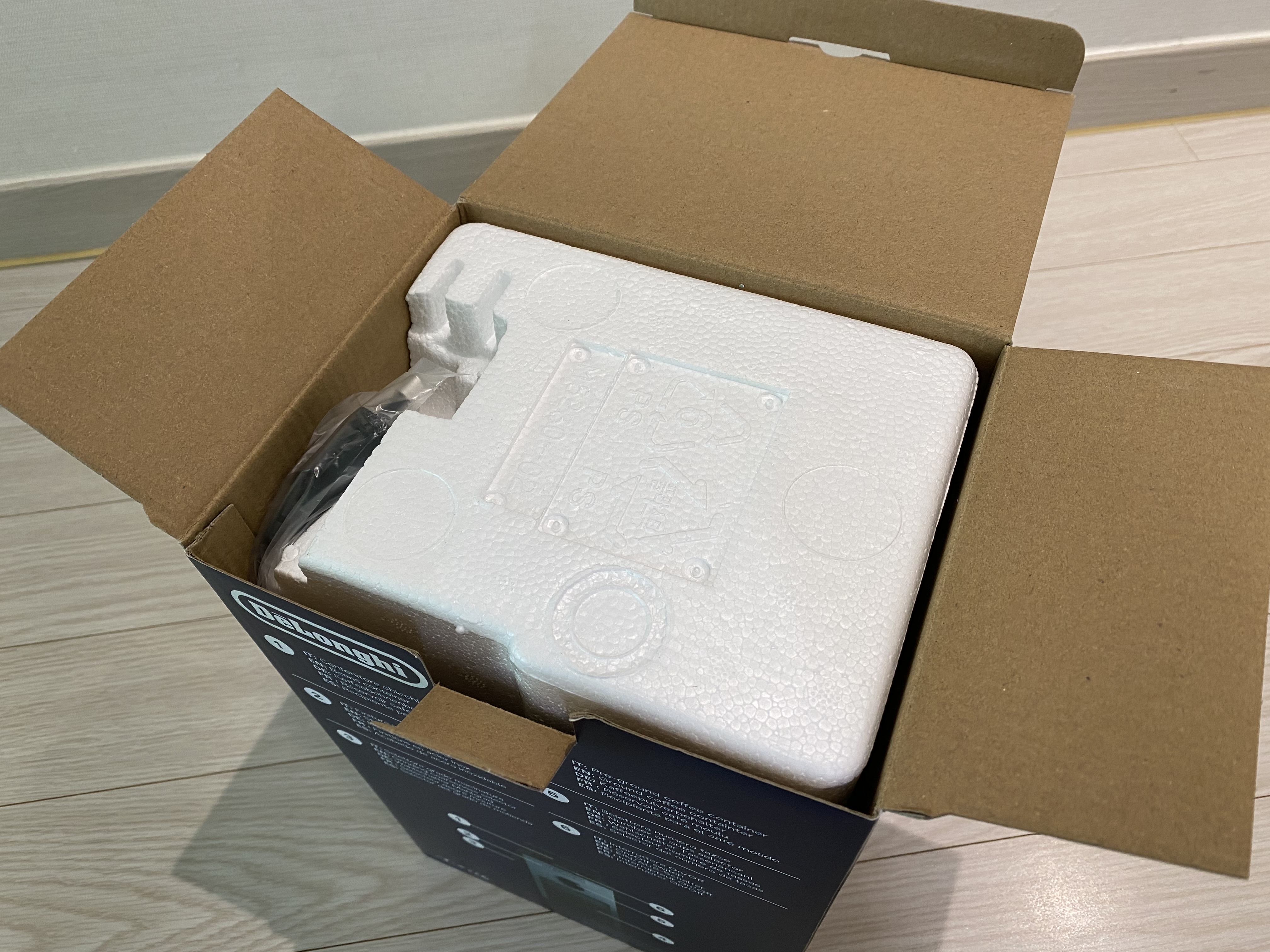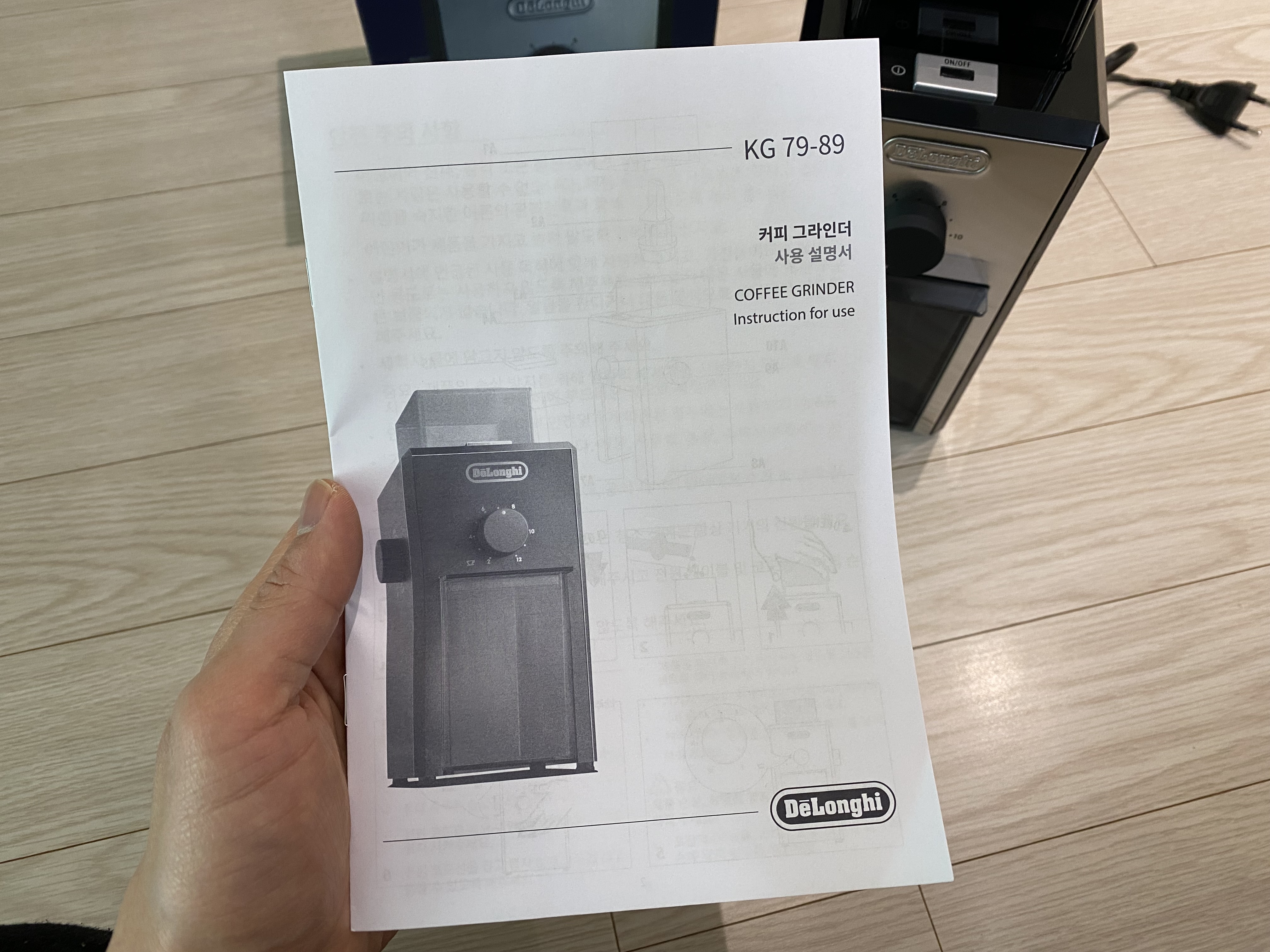 드롱기 커피 그라인더 KG89 제품을 개봉한 모습입니다. 그라인더와 설명서가 끝.