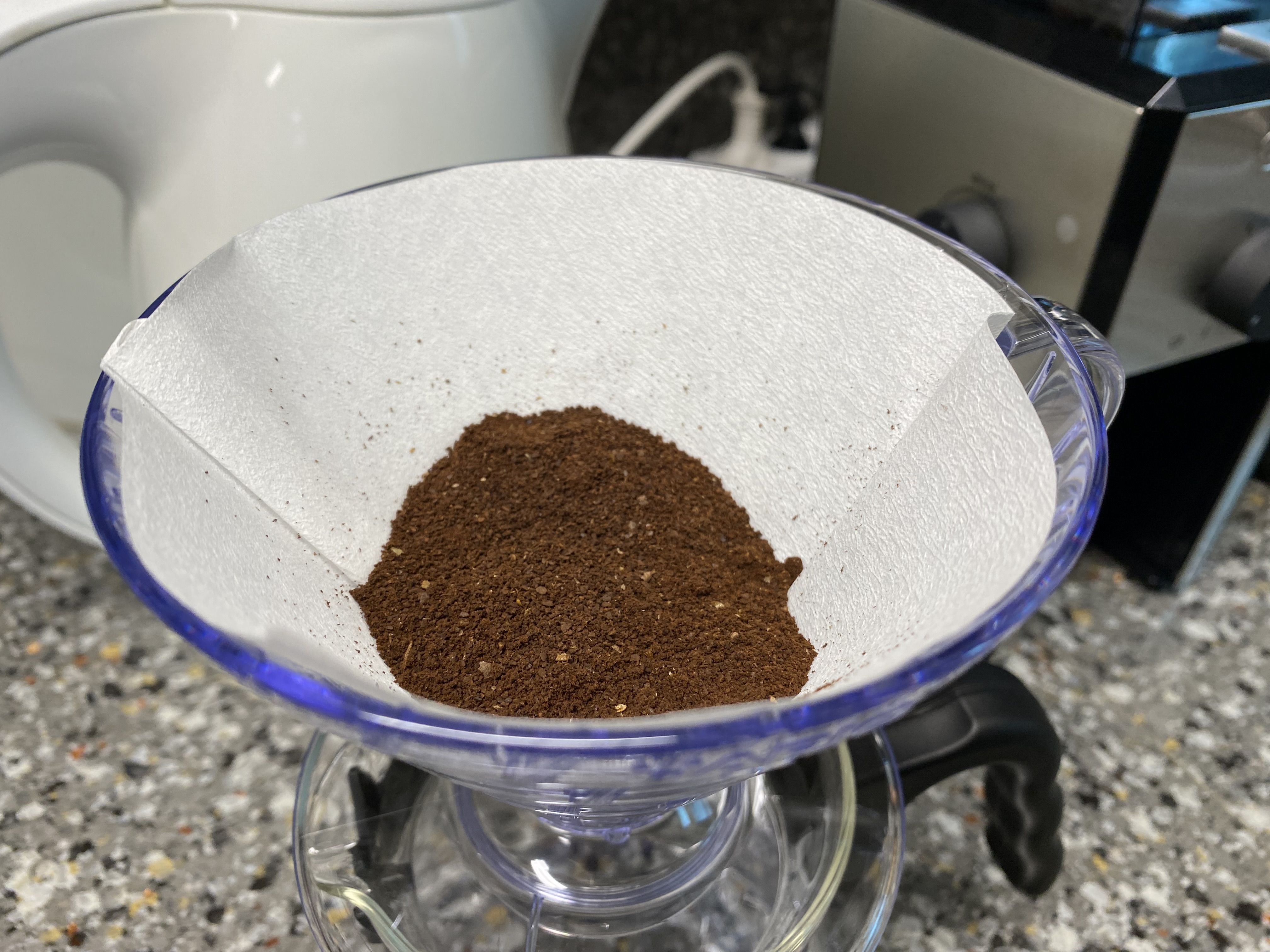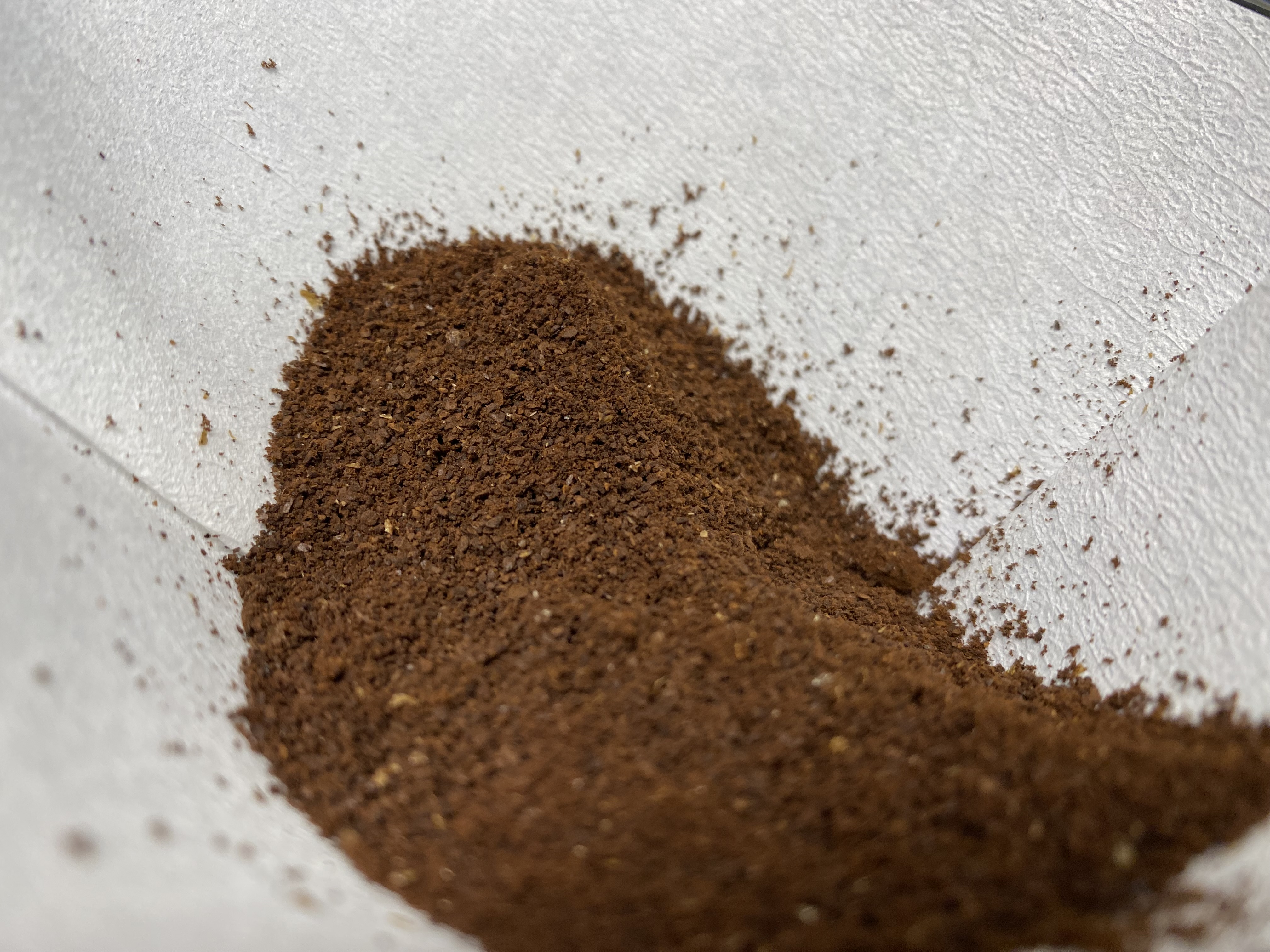 드롱기 그라인더로 간 커피 가루를 드립 여과지에 담은 모습입니다.