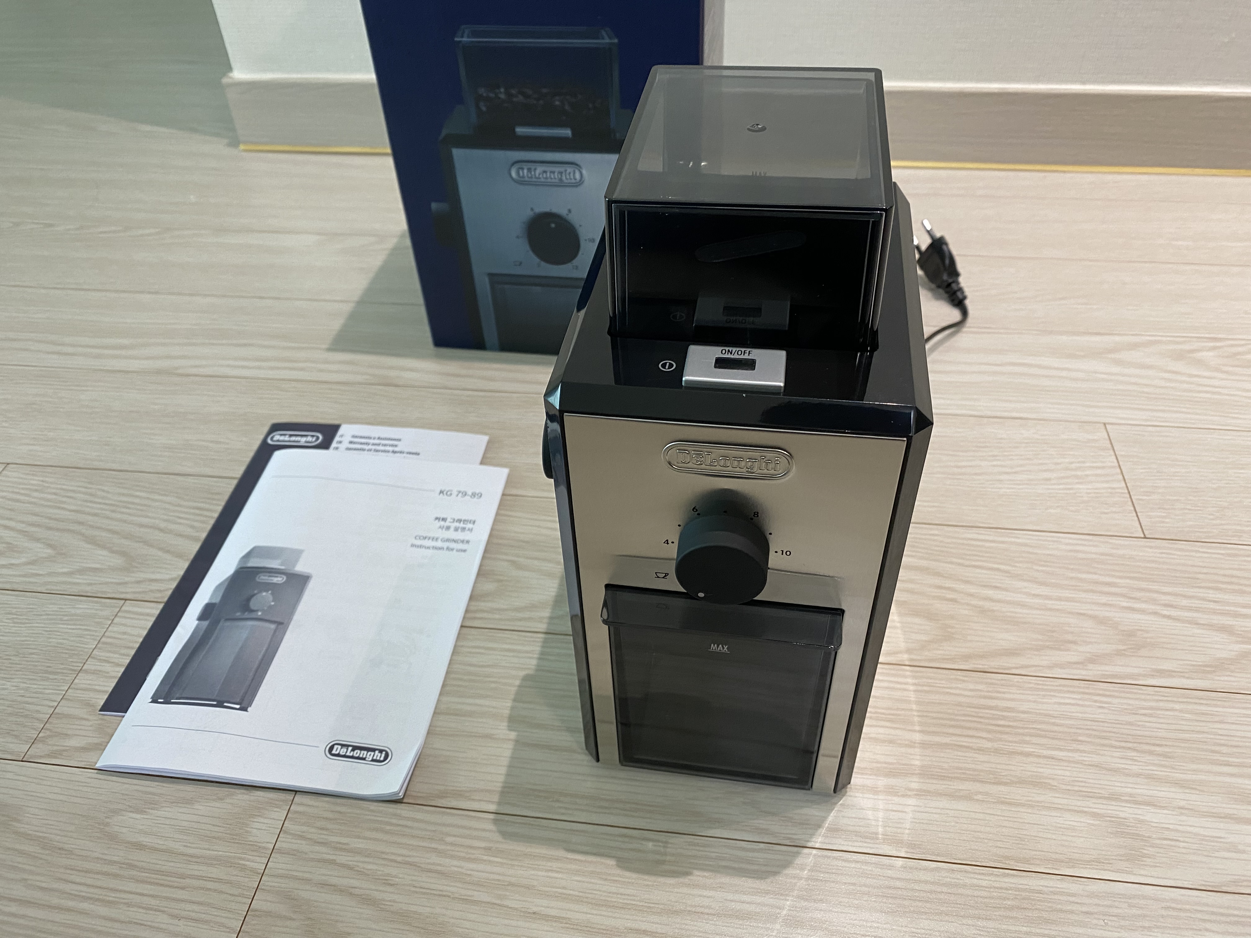드롱기 커피 그라인더 KG89 제품을 개봉한 모습입니다. 그라인더와 설명서가 끝.