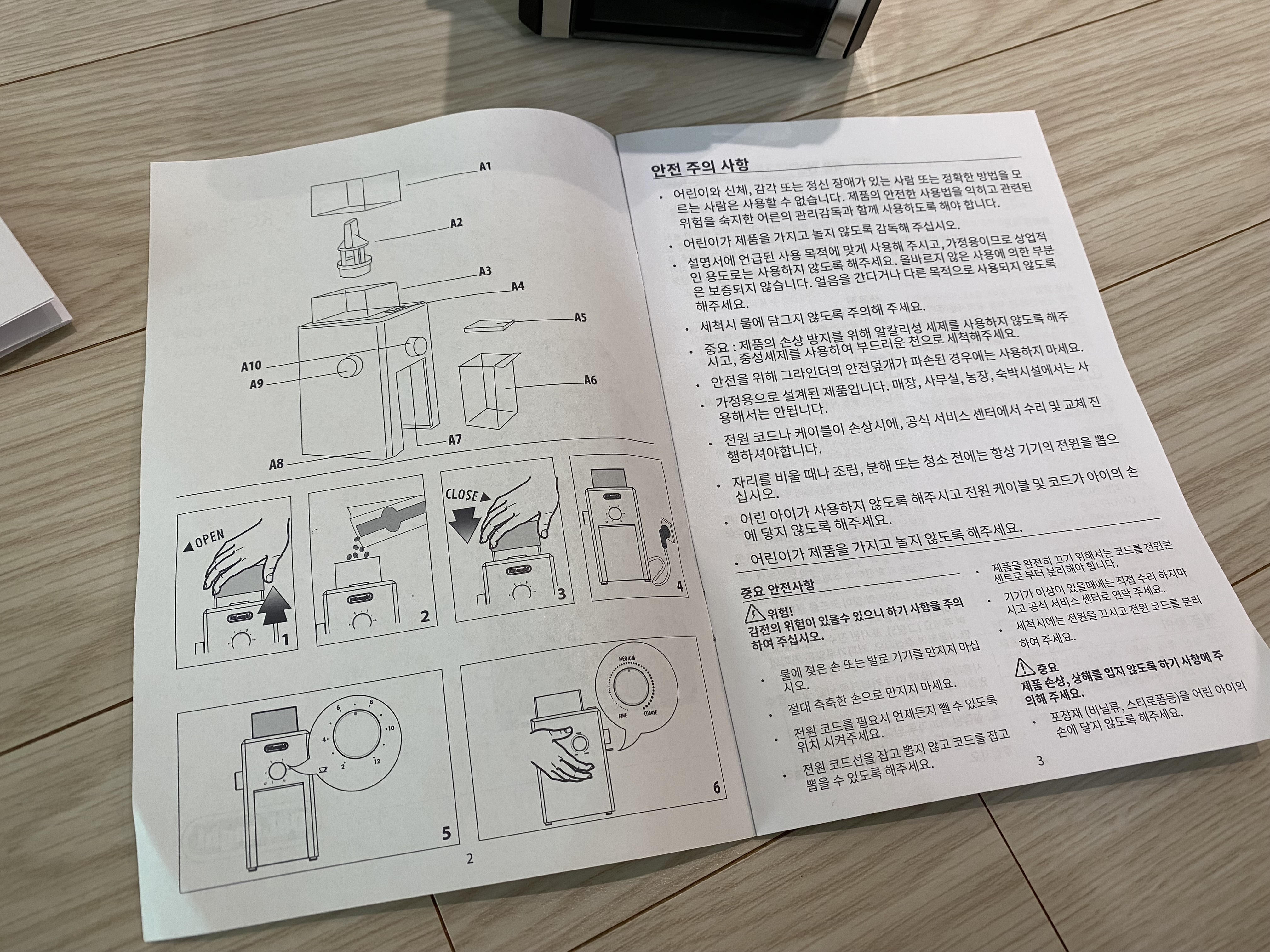 커피 그라인더라는 것이 잘못 사용하면 고장 날 수도 있는 제품이라 설명서를 한번정도 보는 것을 추천합니다. 커피 원두 말고 다른 걸 갈면 문제가 생길 수 있다고 하네요. 그리고 그라인더를 한번 사용하면 과열방치 차원에서 최소 1분 이후에 사용해서 제품에 무리가 가지 않는다고 합니다.