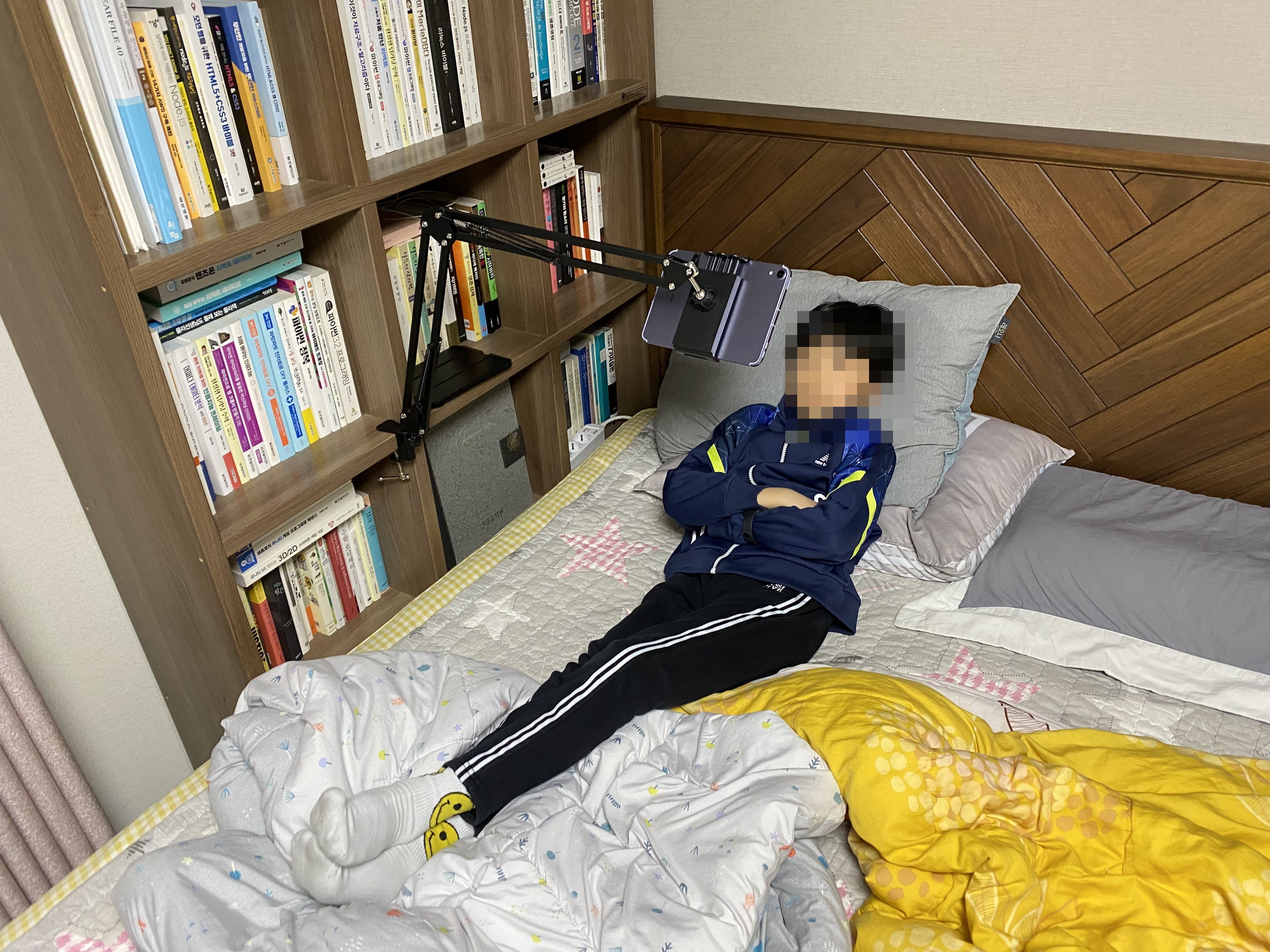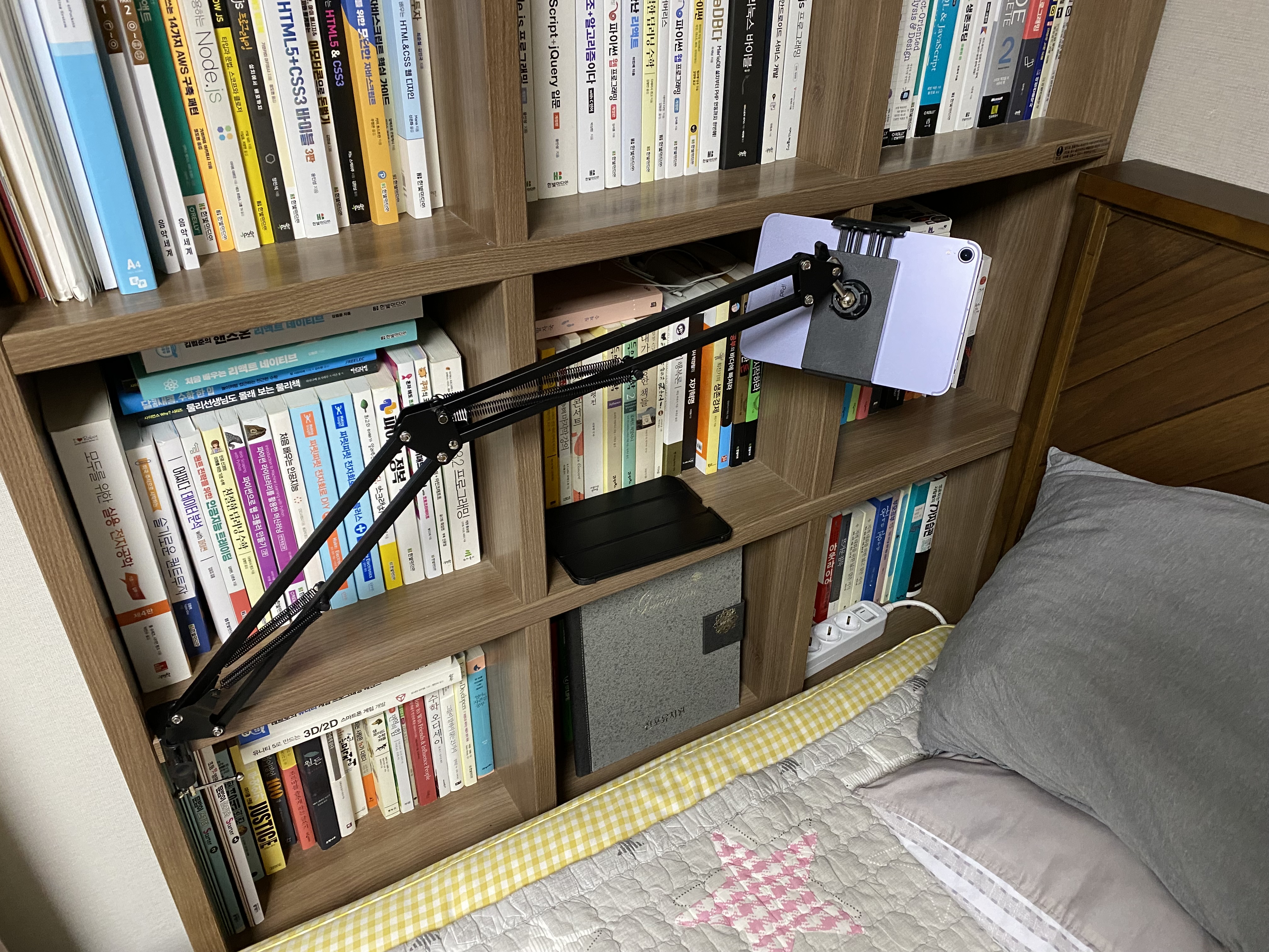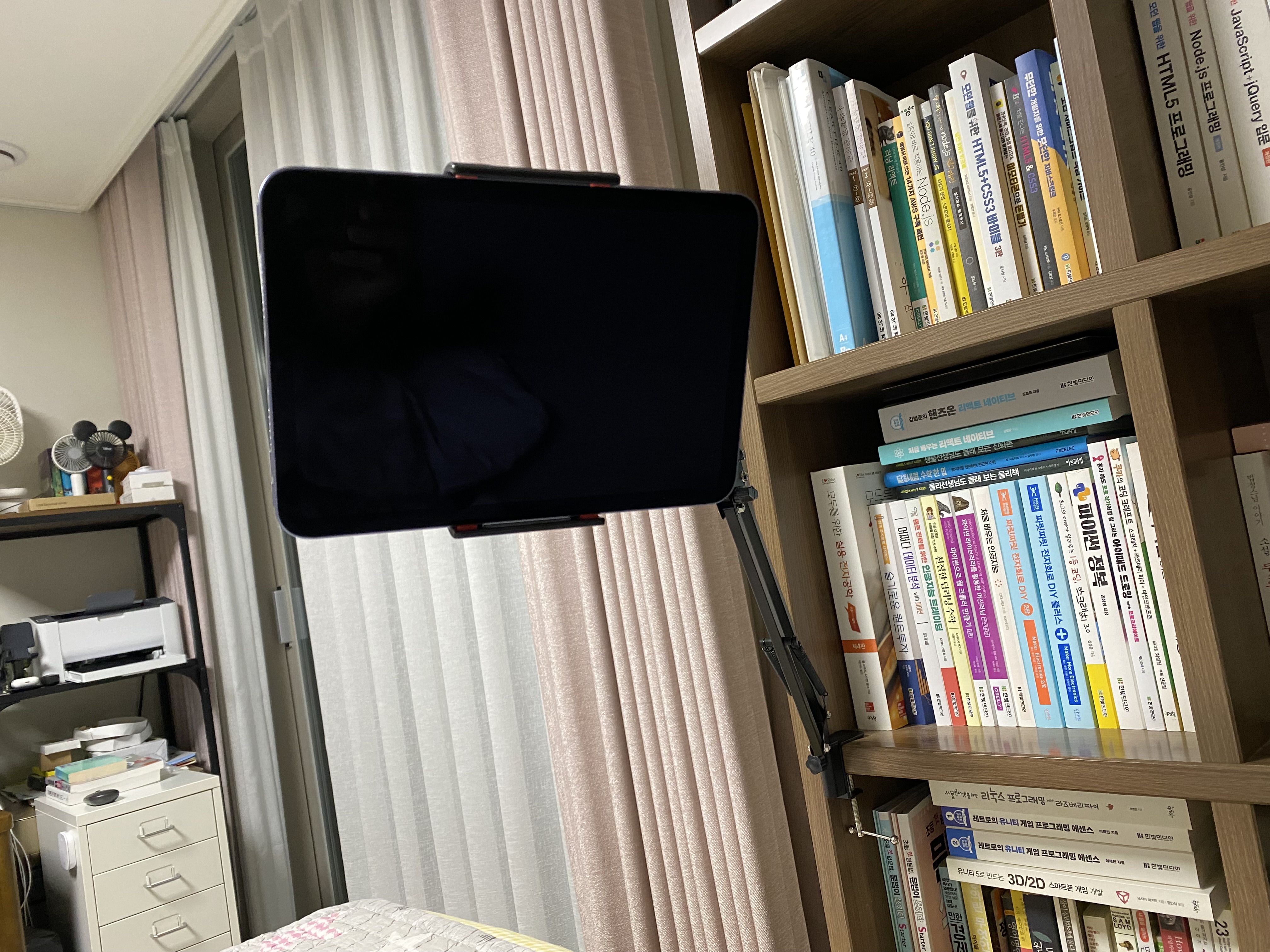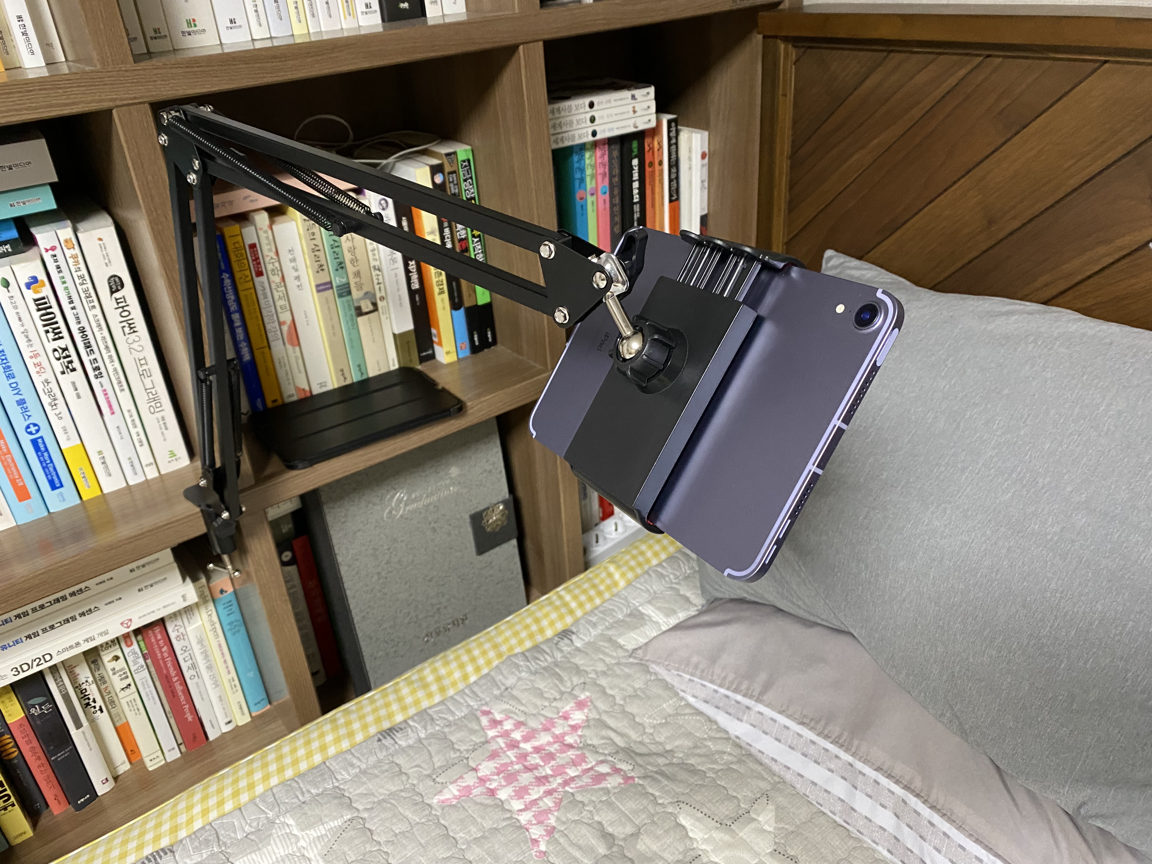 침대에 태블릿 거치대를 설치하고 몇 번 사용을 해봤는데 폐인이 되는 것 같아 지금은 치워버렸습니다. 처음에는 편해서 좋다고 생각했는데 쓰다 보니 수면 시간도 줄고 건강에 안 좋은 것 같아 침실에서 쓰는건 별로 추천하고 싶지는 않네요. 책상 옆에 두고 쓰거나 꼭 필요한 분이 아니라면 안 사는 걸 추천합니다. 침실, 침대는 잠만 자는 걸로.