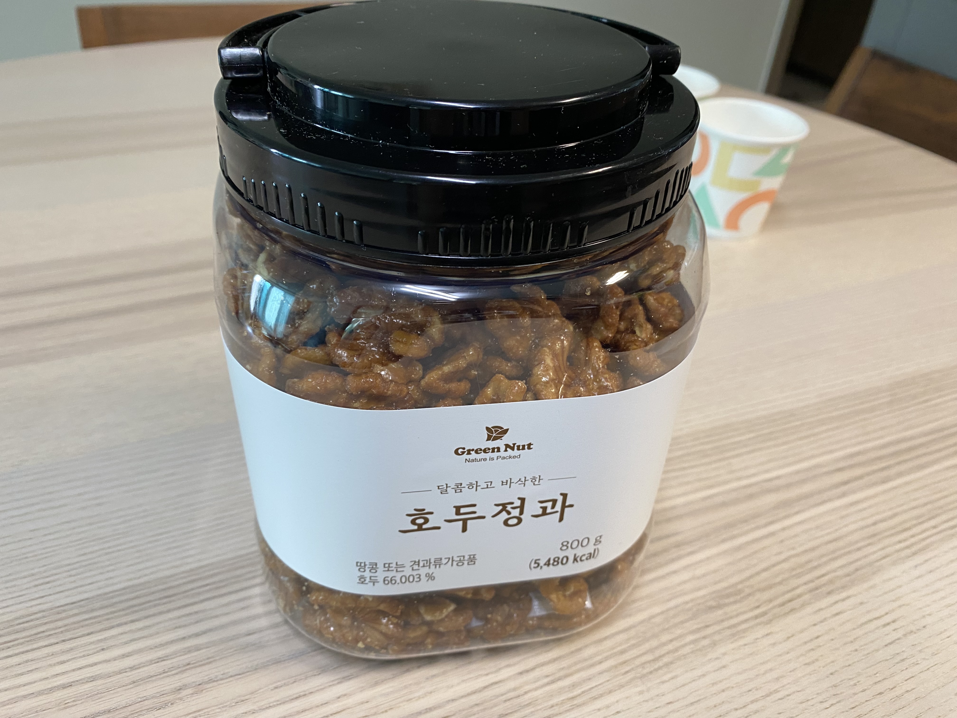 Green Nut 호두정과. 맛이 아주 그냥 맛있는 맛입니다. 겉바속촉이 아니라 겉촉속바의 식감이 아무 괜찮습니다. 바삭한 식감이 더 강합니다. 예전에 중국집에 먹었던 그 느낌 그대로네요. 아주 달고 맛있는 맛. 좀 많이 달아서 알아서 적당히 먹게 됩니다. 처음에 우걱우걱 먹다가 나중에는 그냥 손을 놓게 됩니다.