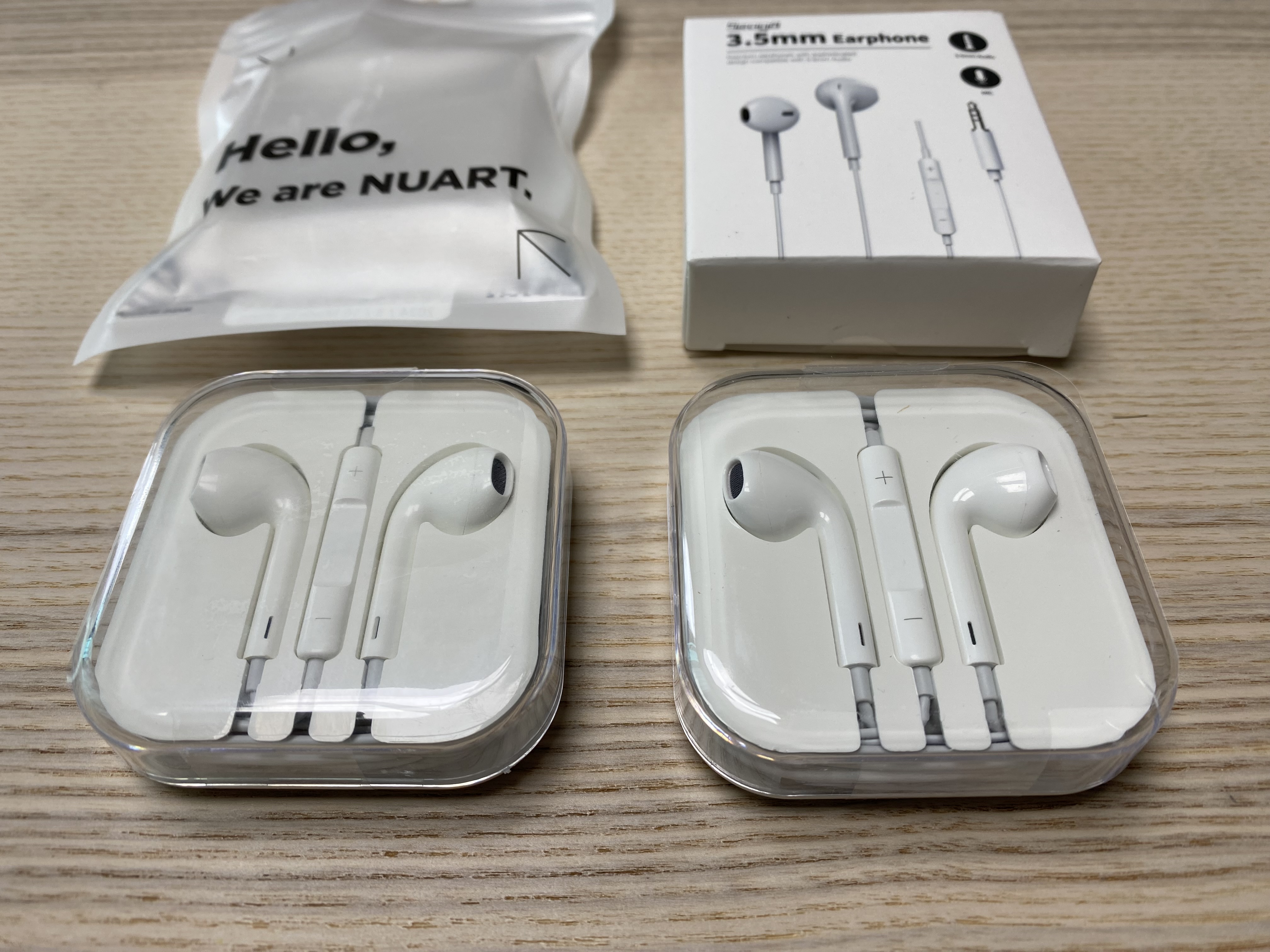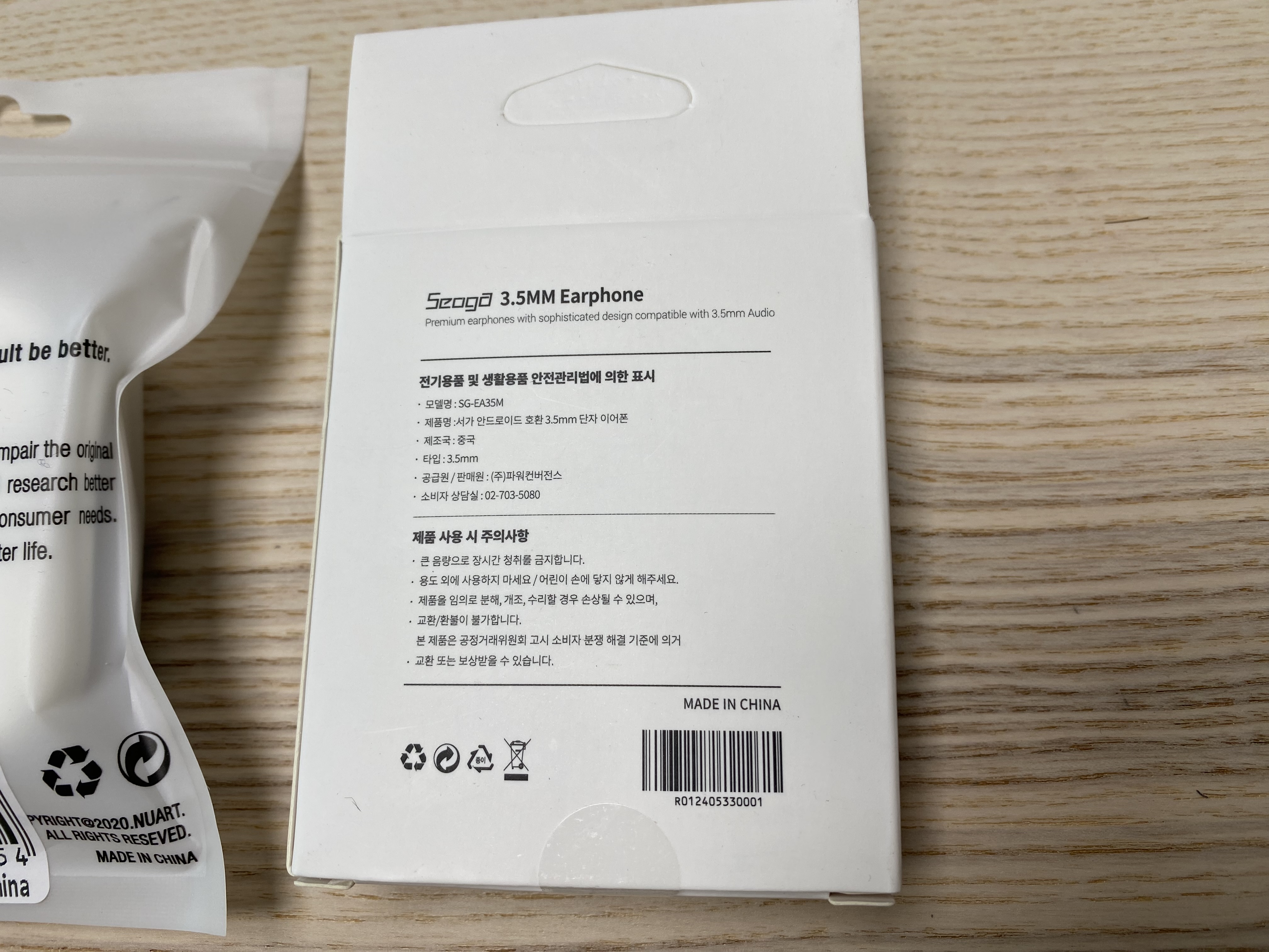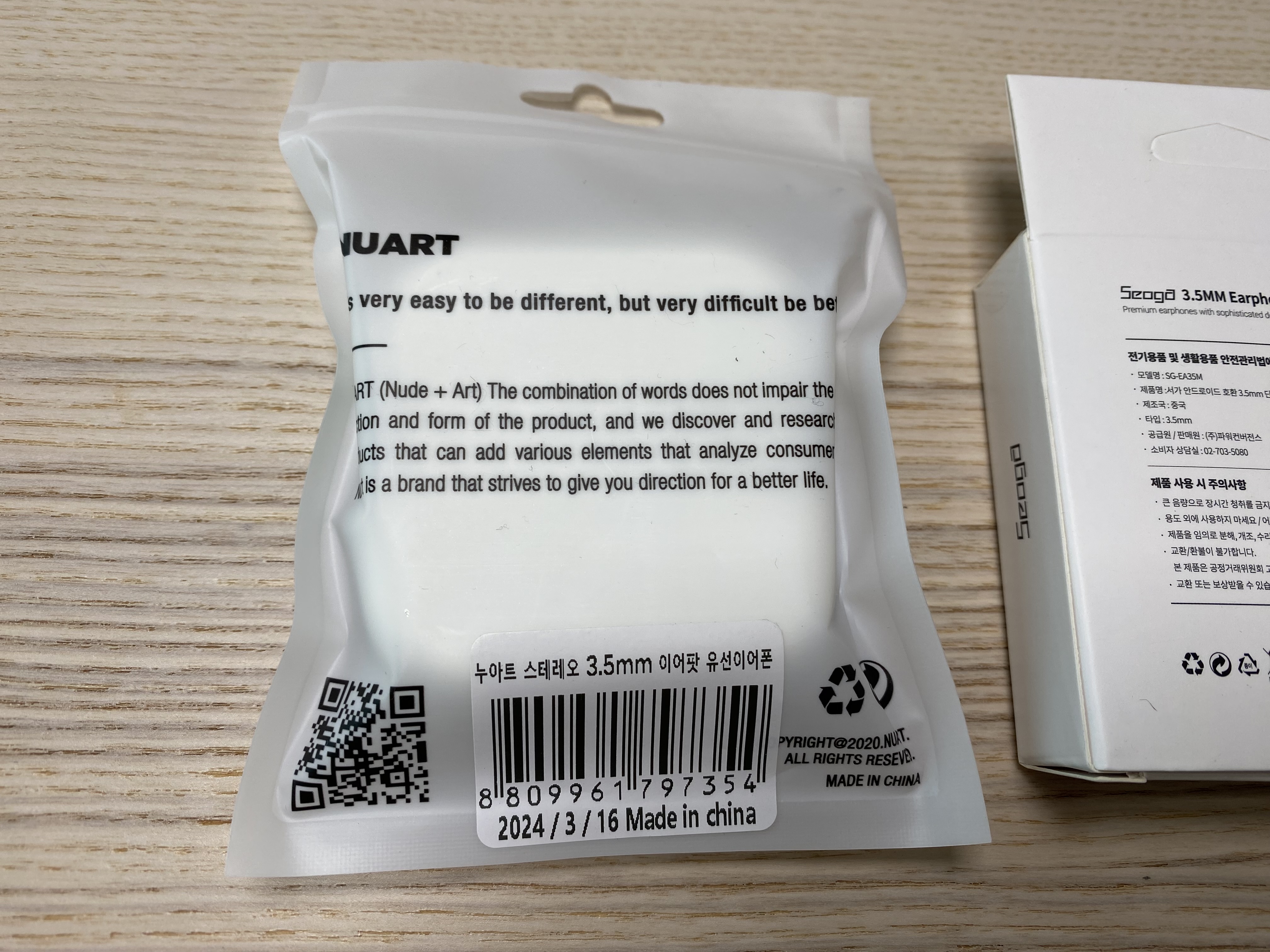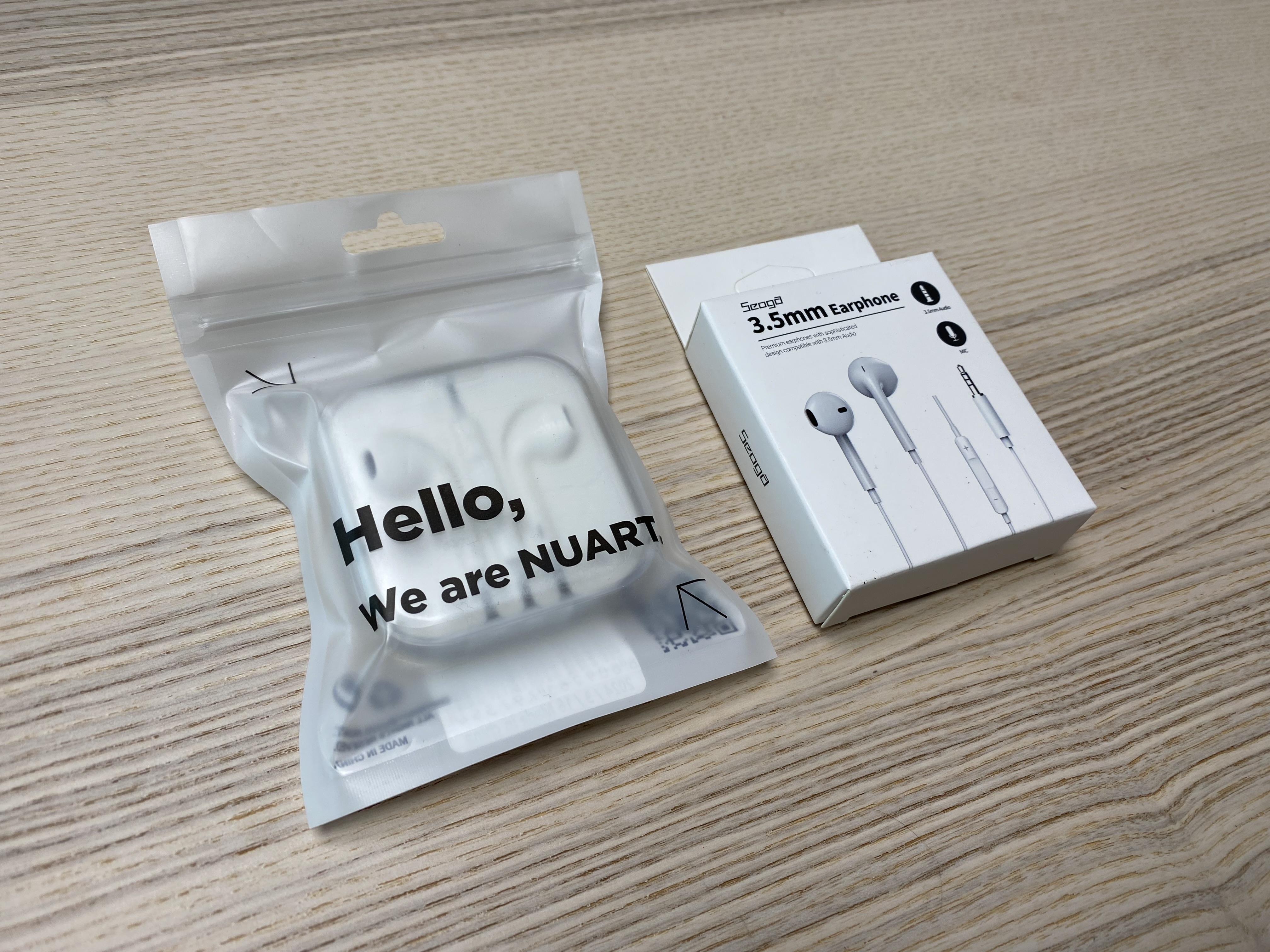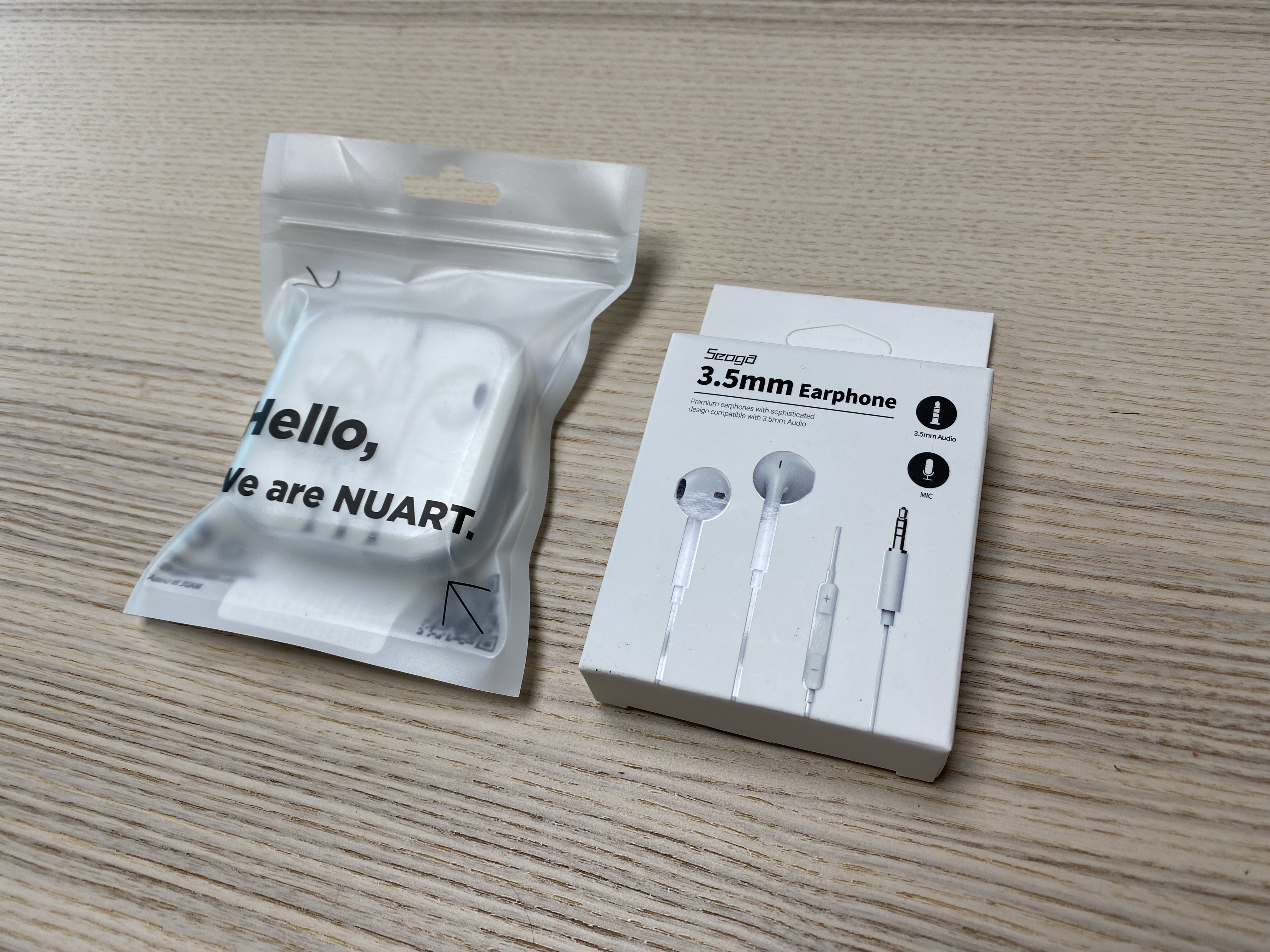 유선 이어폰이 필요해서 쿠팡에서 2개 내렸습니다. 쿠팡 사이트에서 볼 때 거의 비슷한 제품 같은데 회사명이 달라서 뭐가 좋은지 몰라 2개 다 샀습니다. 왼쪽은 '누아트 스테레오 이어팟 유선 이어폰'이고 오른쪽은 '서가 스테레오 AUX 호환 이어폰'입니다. 가격은 둘 다 5800원 정도이고 누아트(NUART) 제품은 할인할 때 사서 좀 더 저렴하게 구매했습니다.