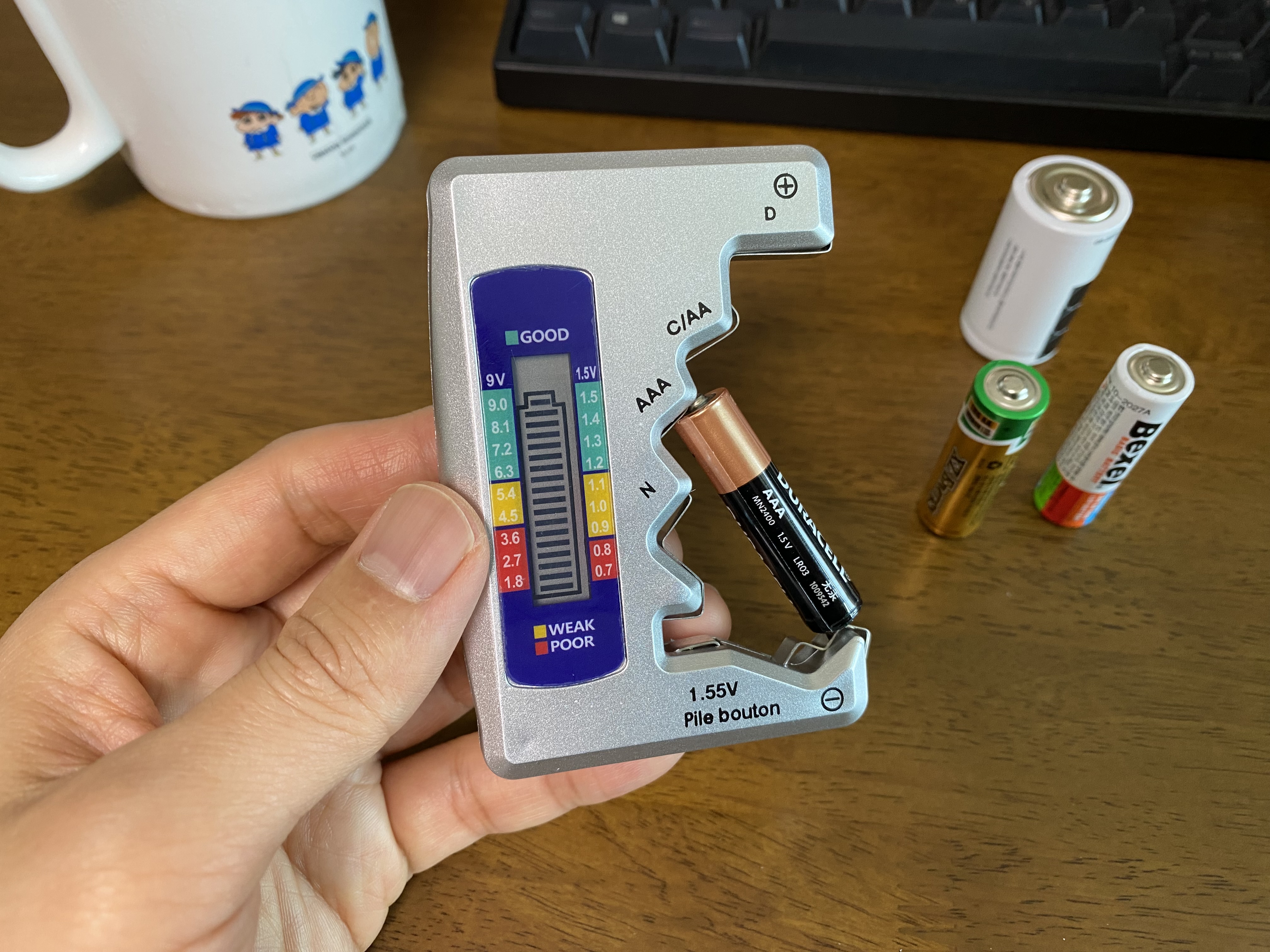 알리에서 구매한 디지털 배터리 테스터. 알리익스프레스 사이트에는 '디지털 배터리 테스터 C D N AA AAA 9V 1.5V 단추 셀 용량 검사 감지기, LCD 디스플레이 용량 진단 도구'라고 이름이 적혀있네요.