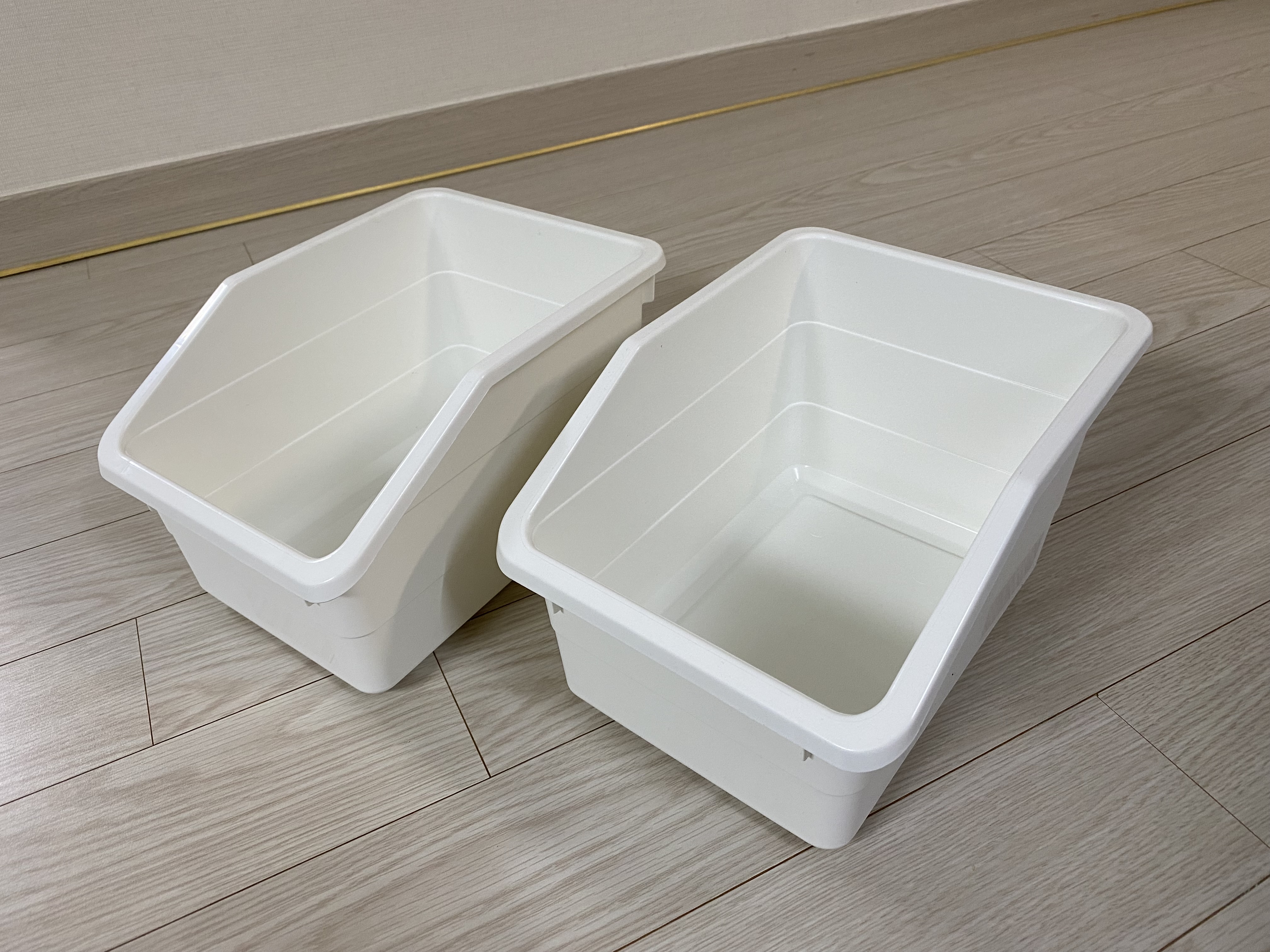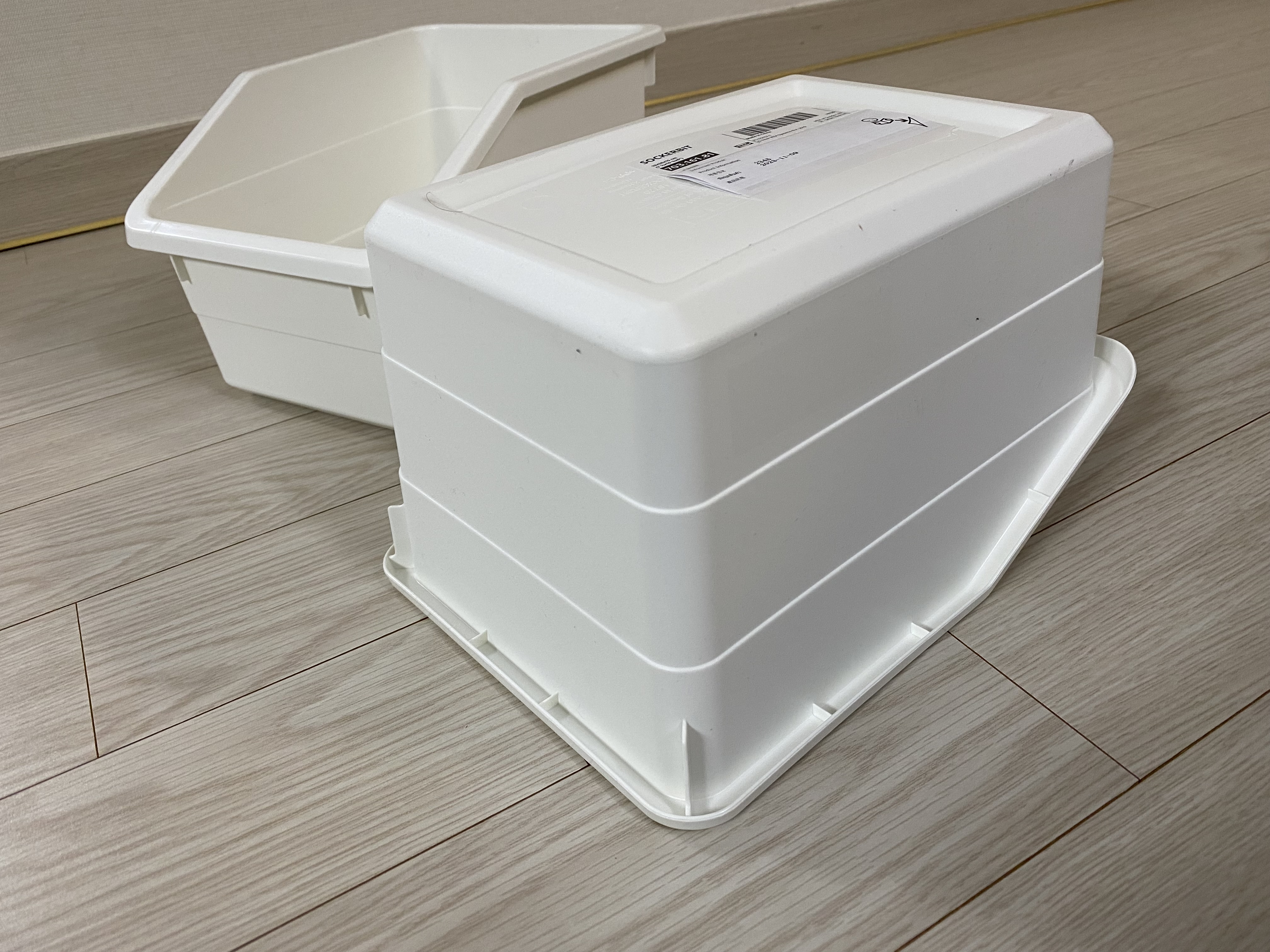 다른 이케아 제품인 웁스노프사드 수납상자(1000원)와 비교 사진입니다. 소케르비트 수납함 가격이 2배 가까이 비싸서 그런지 퀄리티, 튼튼함 면에서 웁스노프사드 수납상자보다 낫습니다. 근데 웁스노프사드는 위로 쌓을 수 있는 구조라 나름 장점도 있습니다. 창고에는 웁스노프사드가 더 어울릴 것 같습니다.