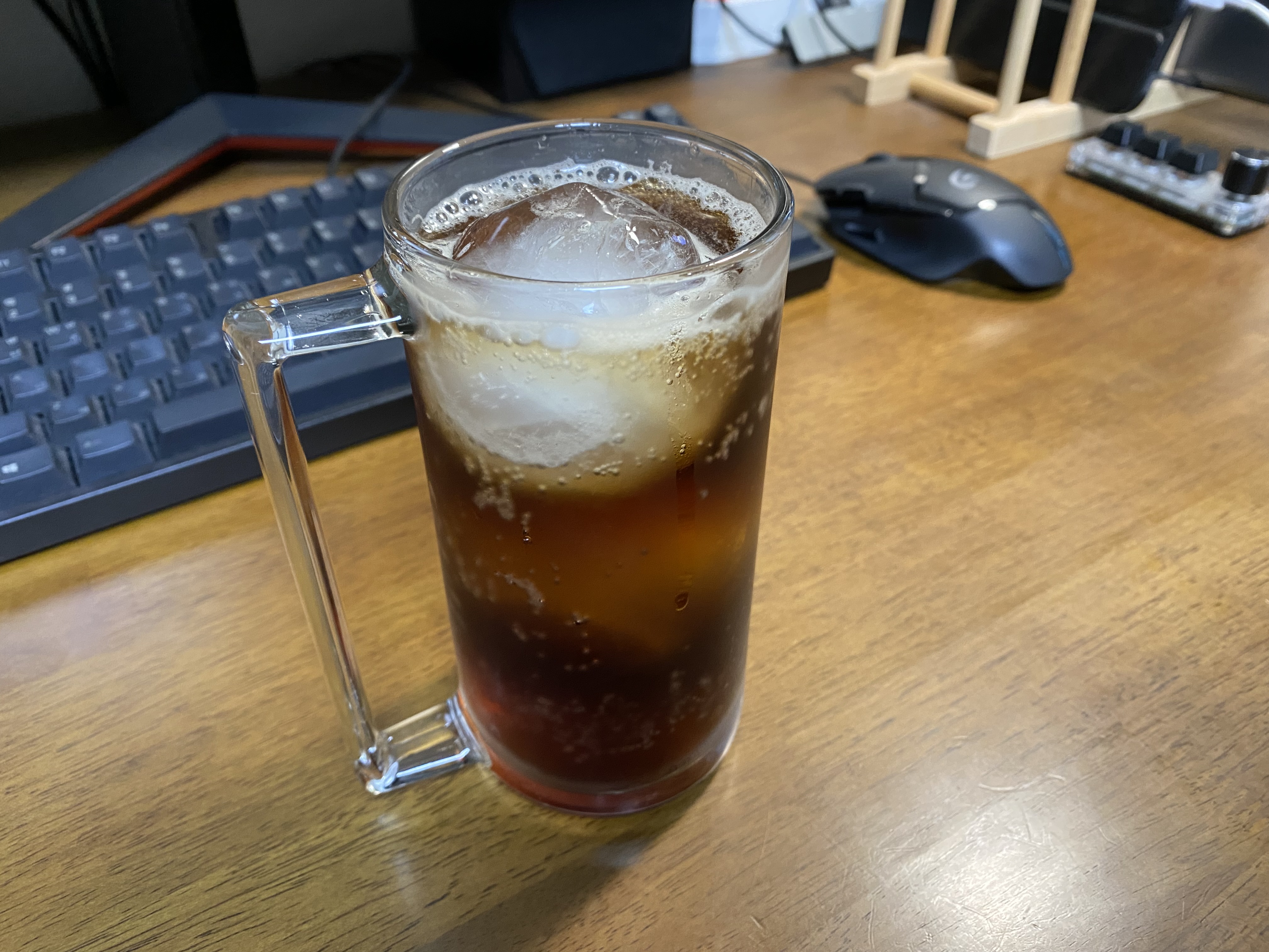 위 사진은 긴 유리잔에 아이스볼 2개를 넣어 하이볼을 만든 모습입니다. 하이볼도 이 큰 얼음보다 작은 얼음 여러 개가 더 좋은 것 같습니다. 섞기도 어렵고 빨리 시원해지지도 않고.