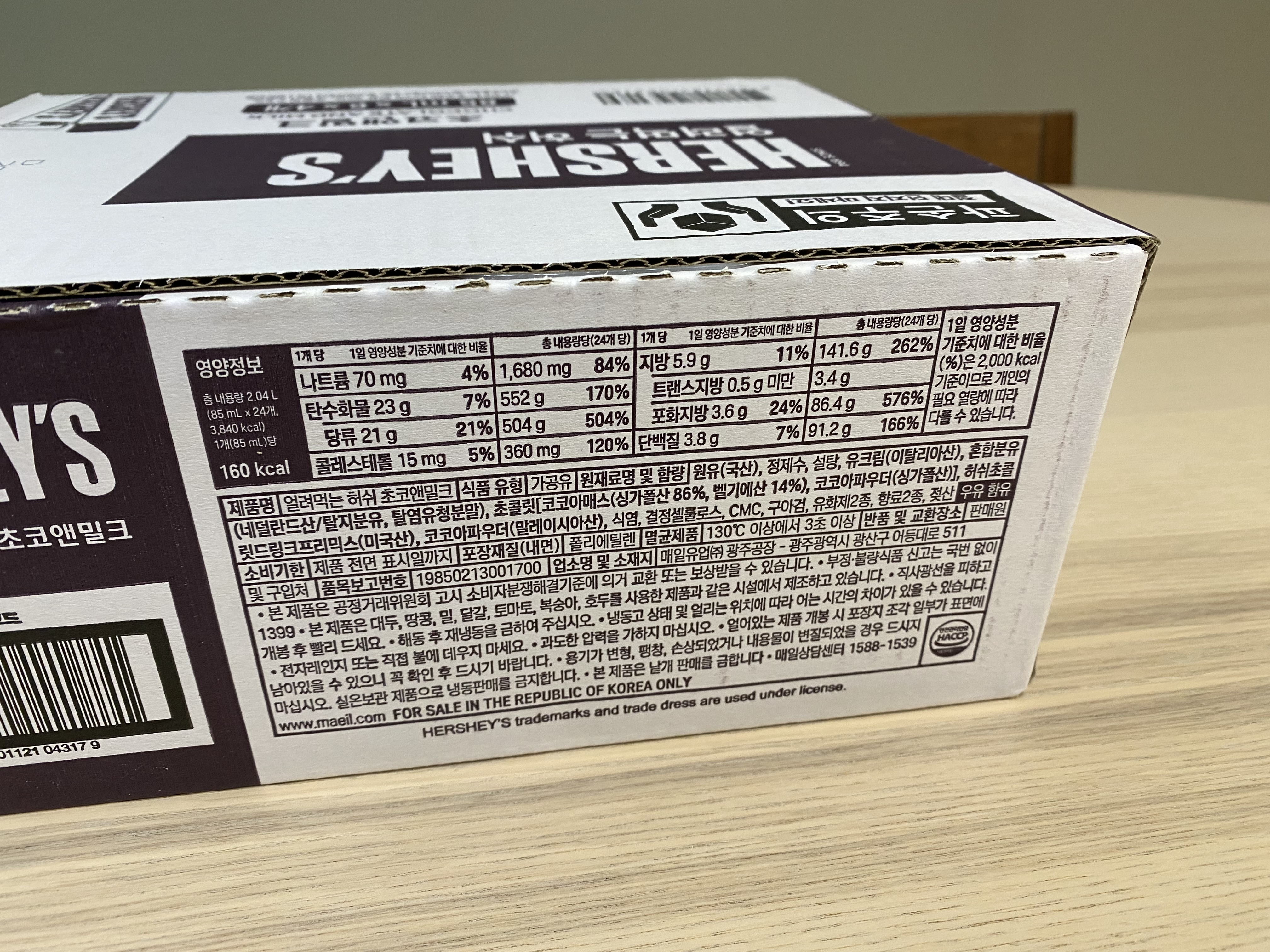 얼려 먹는 허쉬 초코 앤 밀크가 그렇게 맛있다면 어쩌면 몸에 안 좋을지도... 제품 영양정보를 보니 생각보다 나쁘진 않네요. 85ml 1개당 칼로리는 160kcal로 밥 한 공기(250kcal)보다는 칼로리가 적습니다. 당류도 21g으로 콜라 뚱캔이 40g이니 생각보다 참을만한 수준이네요. 아마도 양이 작아서 그런 것 같습니다. 자세한 영양정보는 사진을 참고하세요.