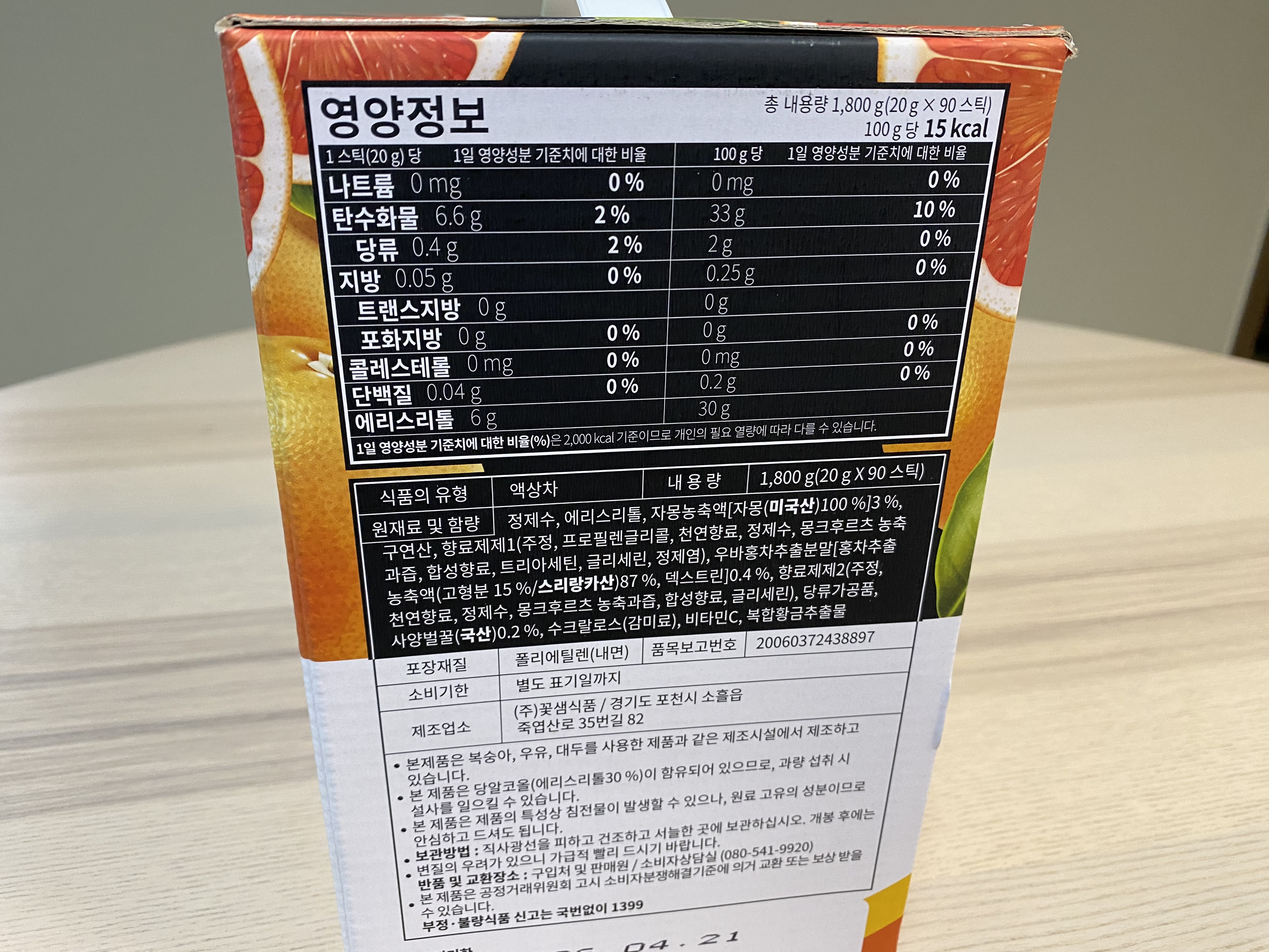 VONBEE 자몽허니 블랙티의 영양정보는 위 사진과 같습니다. 1 스틱당 당류가 0.4g이네요. 콜라 뚱캔이 40g이니까 거의 100분의 1 수준으로 설탕이 적은 걸 알 수 있습니다. 합성감미료(수크랄로스)로 단맛을 낸 것 같네요. 합성감미료도 몸에 안 좋다는 말이 많은데 어느 전문가의 말로는 아무리 합성감미료가 안 좋아도 이 정도 단맛을 내는 설탕의 양보다는 건강에 낫다고 하네요. 전문가가 아니니 그냥 저칼로리, 저당이라는 말을 믿고 마셔야지요.