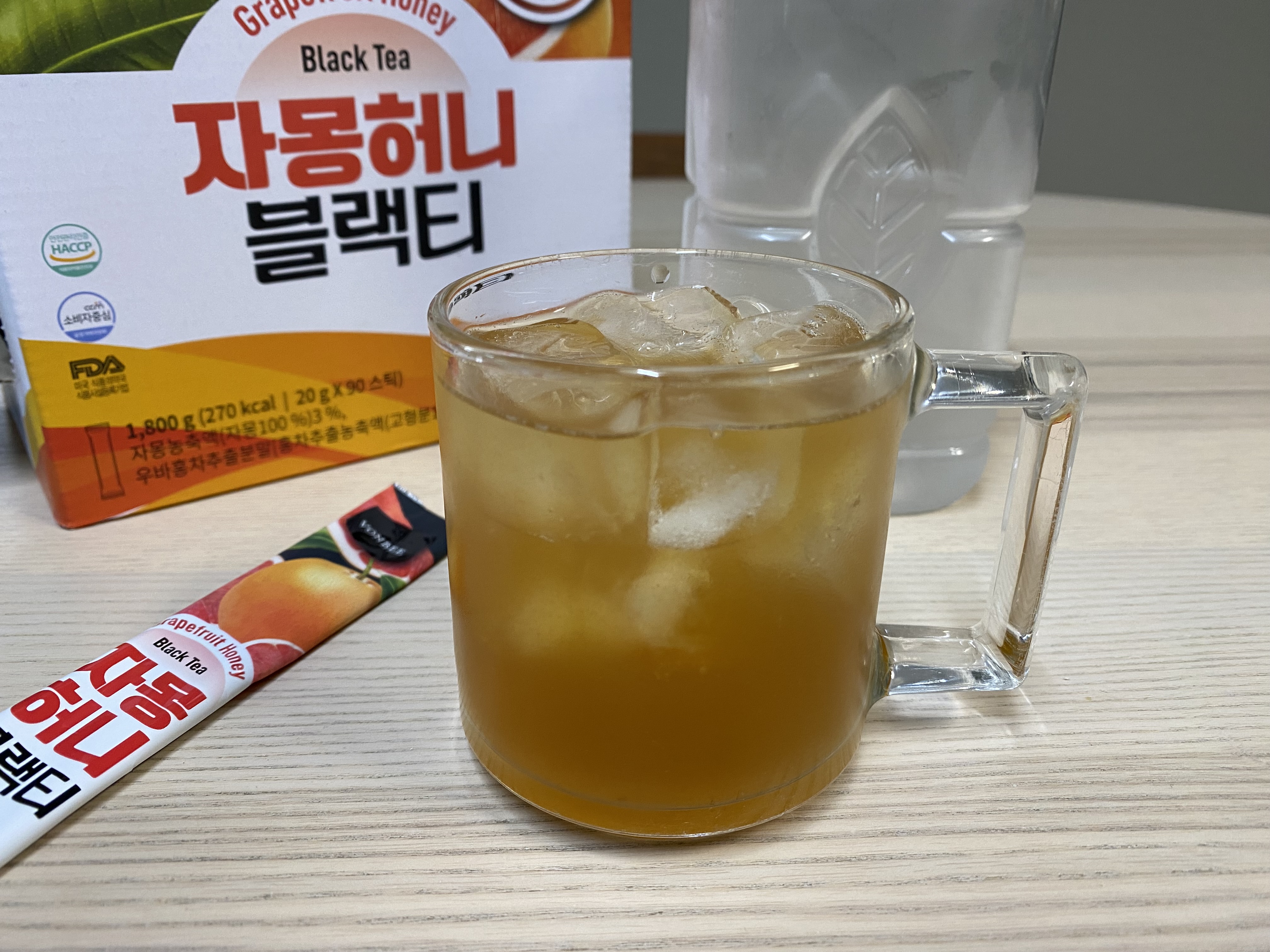 얼음을 넣고 스틱 하나 붓고 기호껏 물을 추가하면 자몽허니 블랙티 완성입니다. 작은 컵이라 스틱 하나를 넣었는데 큰 잔에는 2개 정도는 넣어야 할 것 같습니다. 그래야 달달하게 즐길 수 있습니다.