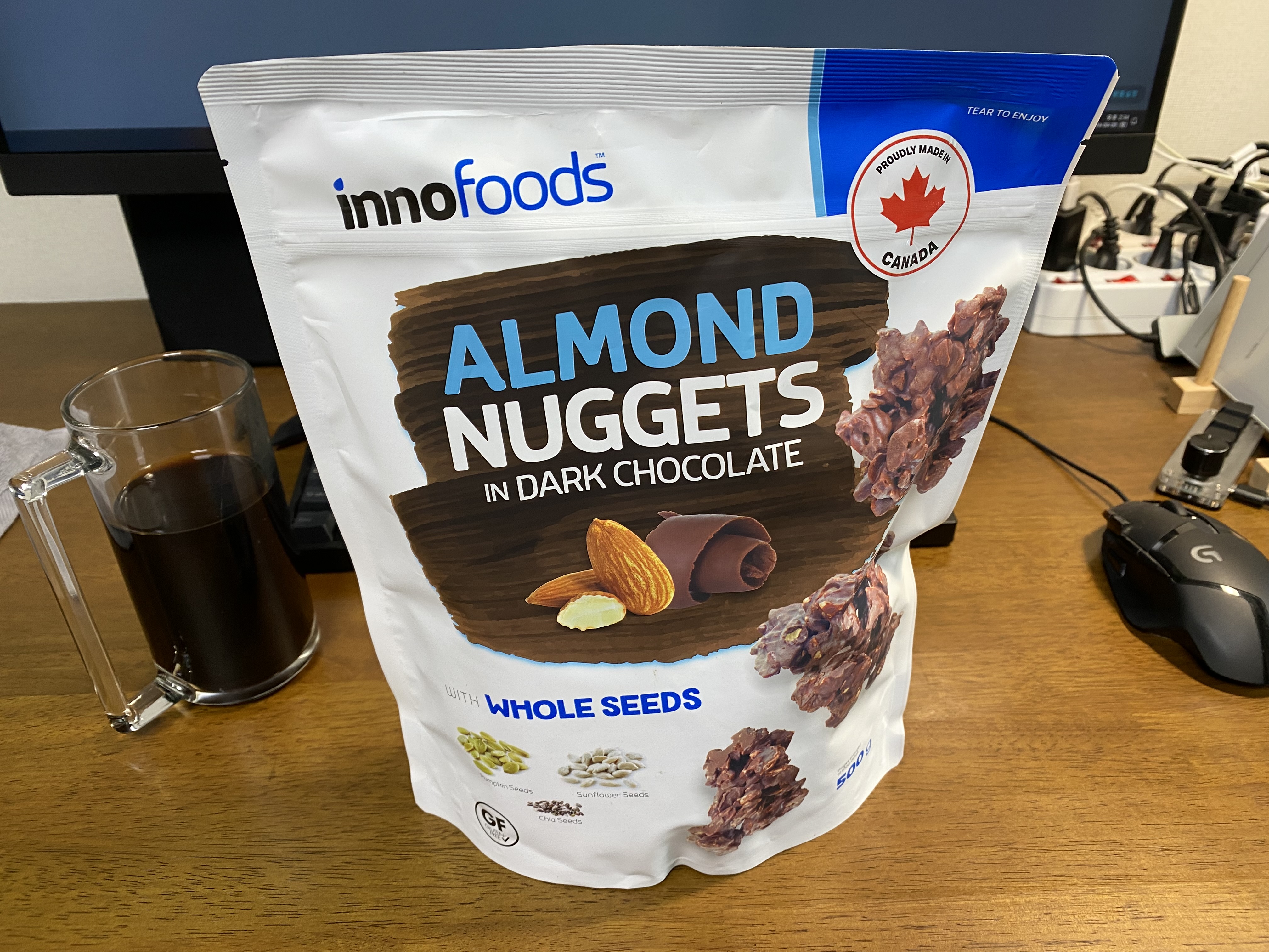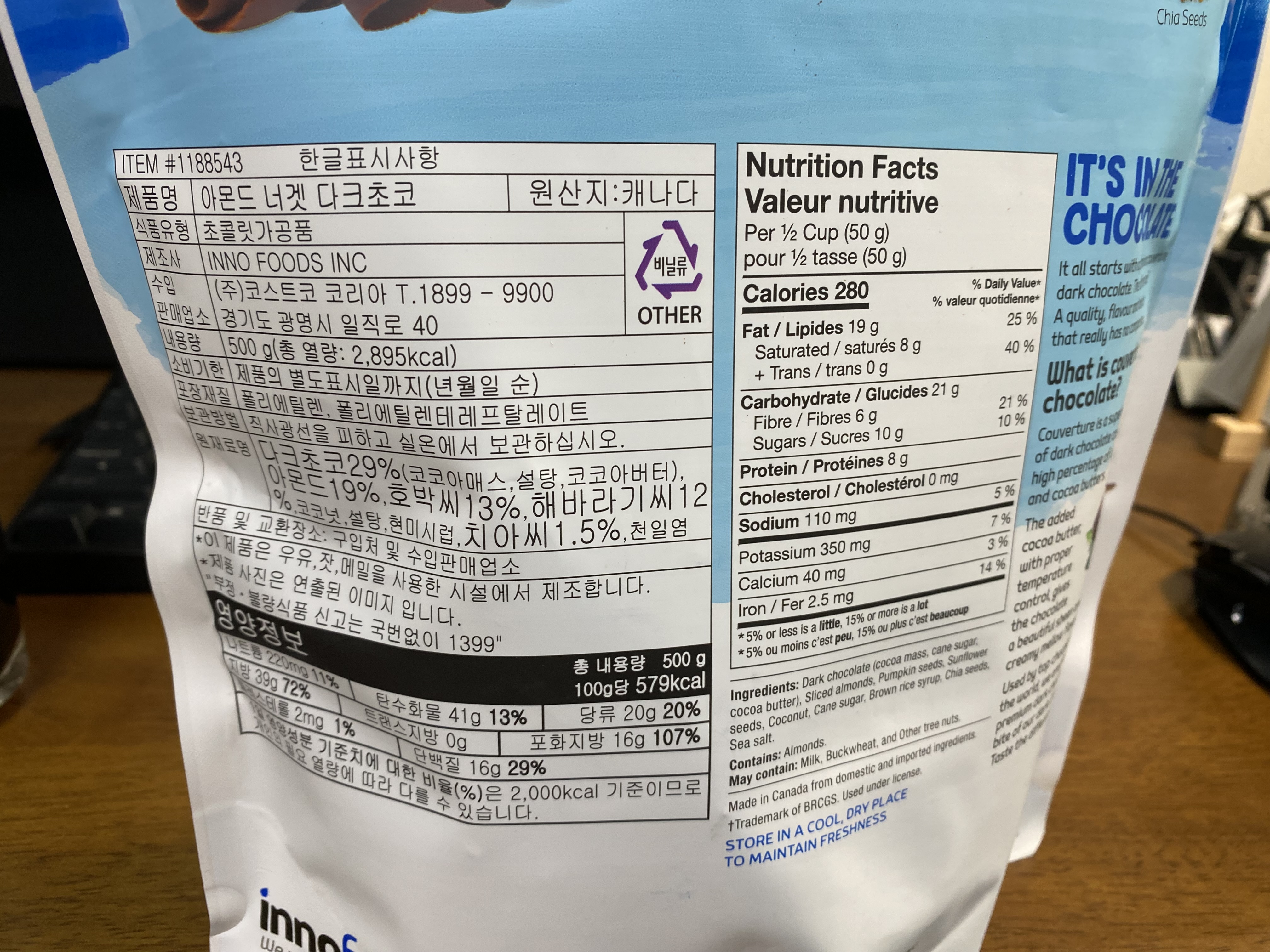 코스트코 INNO FOODS 아몬드 너겟 초콜릿. 맛은 호불호가 조금 있을 것 같지만 큰 거부감은 없는 그런 맛입니다. 아몬드, 씨앗 등이 들어있어서 식이섬유가 많이 느껴지는 식감을 가지고 있습니다. 아이들이 막 찾아먹지는 않지만 배고플 때 하나씩 꺼내 먹을 수 있는 맛입니다. 초콜릿을 좋아하는데 건강 때문에 (달달한 밀크) 초콜릿이 망설여지는 분에게 적당히 달고 이런저런 견과류도 많이 들어간 이노 푸드 아몬드 너겟 초콜릿을 추천합니다. 커피와도 잘 어울립니다.