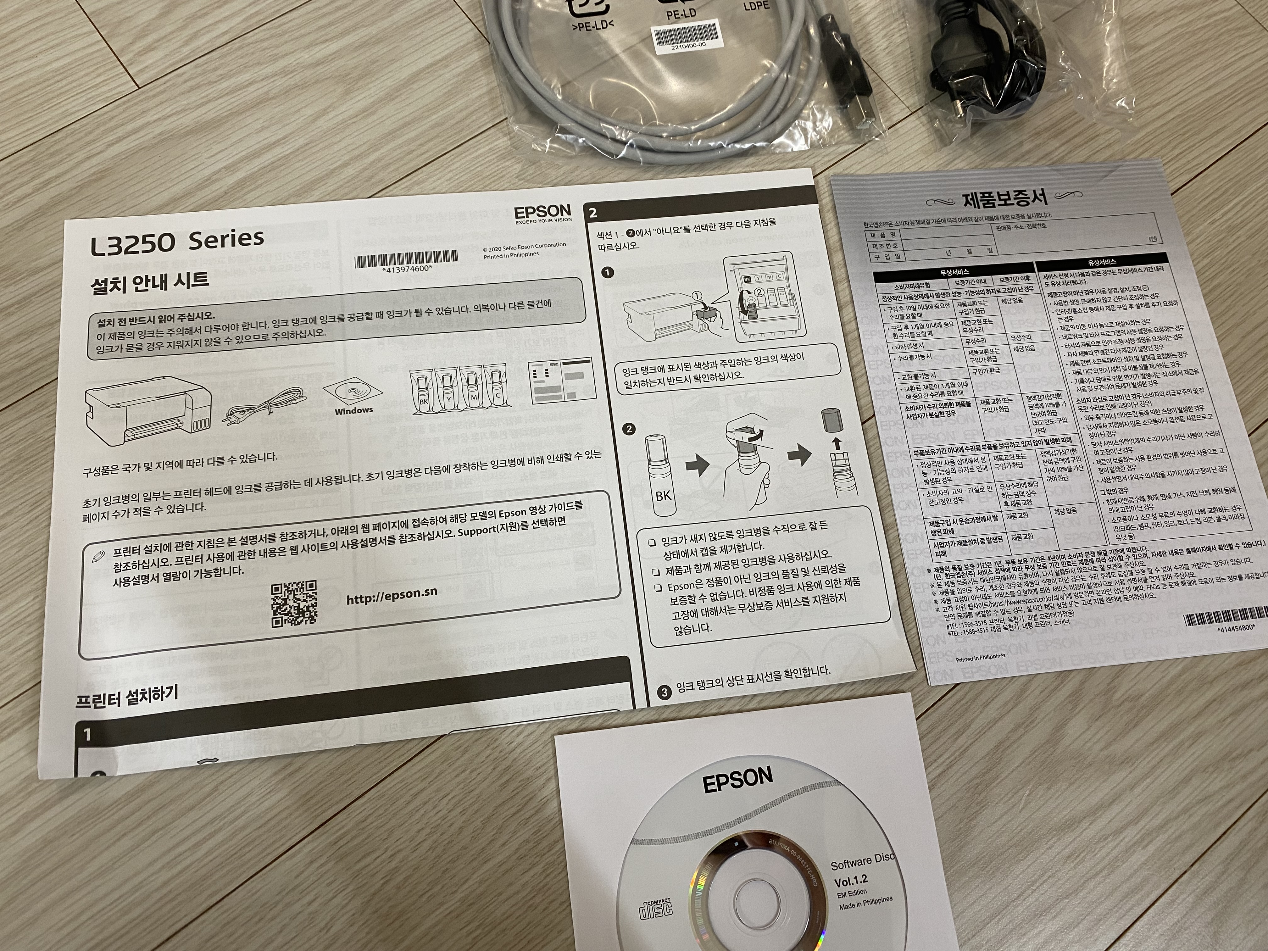 엡손 L3256 정품 무한잉크 프린터를 개봉해서 구성품을 다 꺼냈습니다. 프린터 본체, 전원 케이블, USB 케이블, 잉크 4개, 설명서가 전부입니다. 아직도 설치 CD를 주는 게 신기하네요.