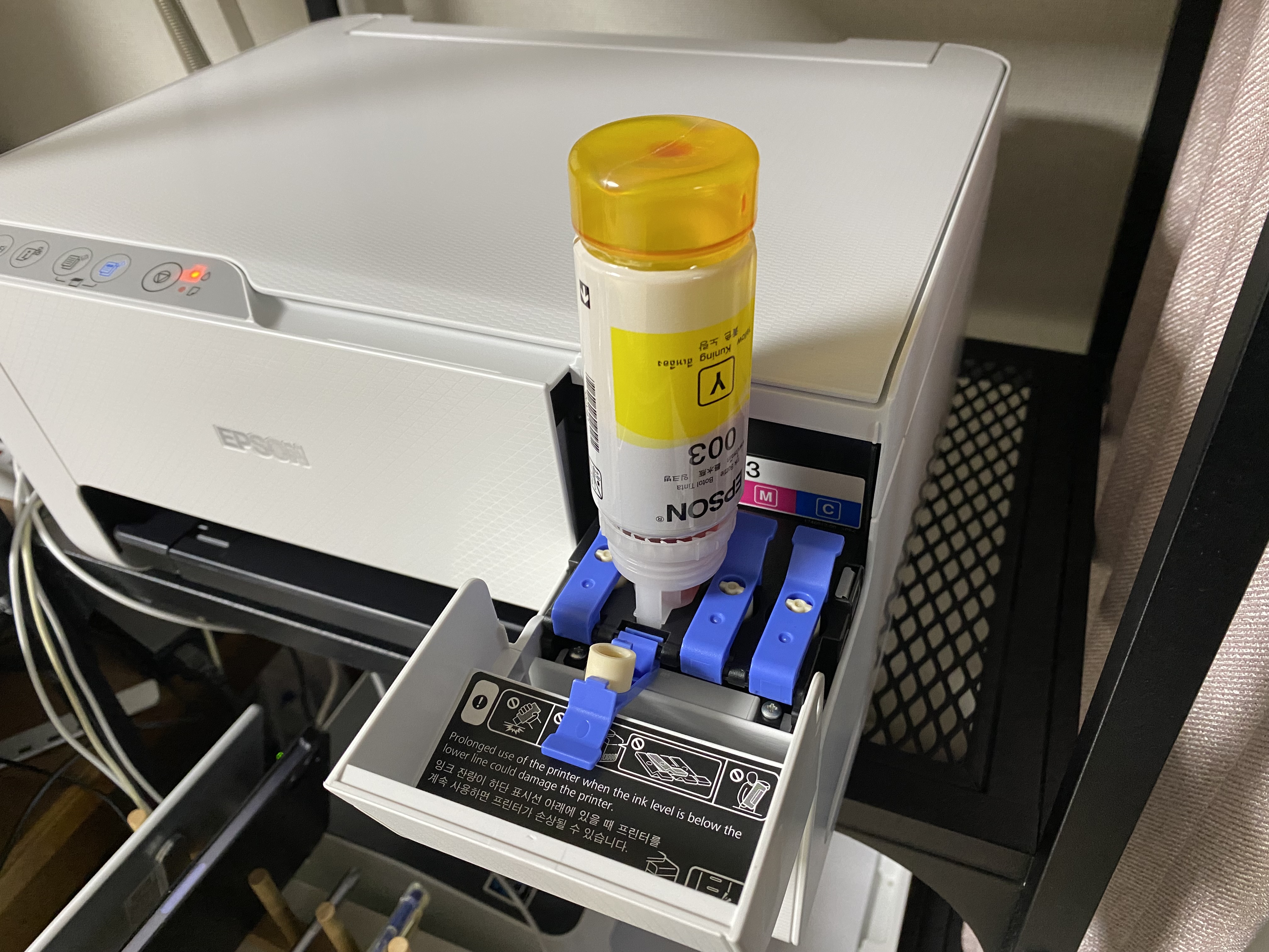 엡손 L3256 정품 무한잉크 복합기에 잉크를 주입하고 있는 모습입니다. 잉크 뚜껑을 열고 그냥 보충하는 위치에 뒤집어 올려놓으면 알아서 잉크가 채워집니다. 충분히 채워지면 알아서 잉크 보충이 멈춥니다.
