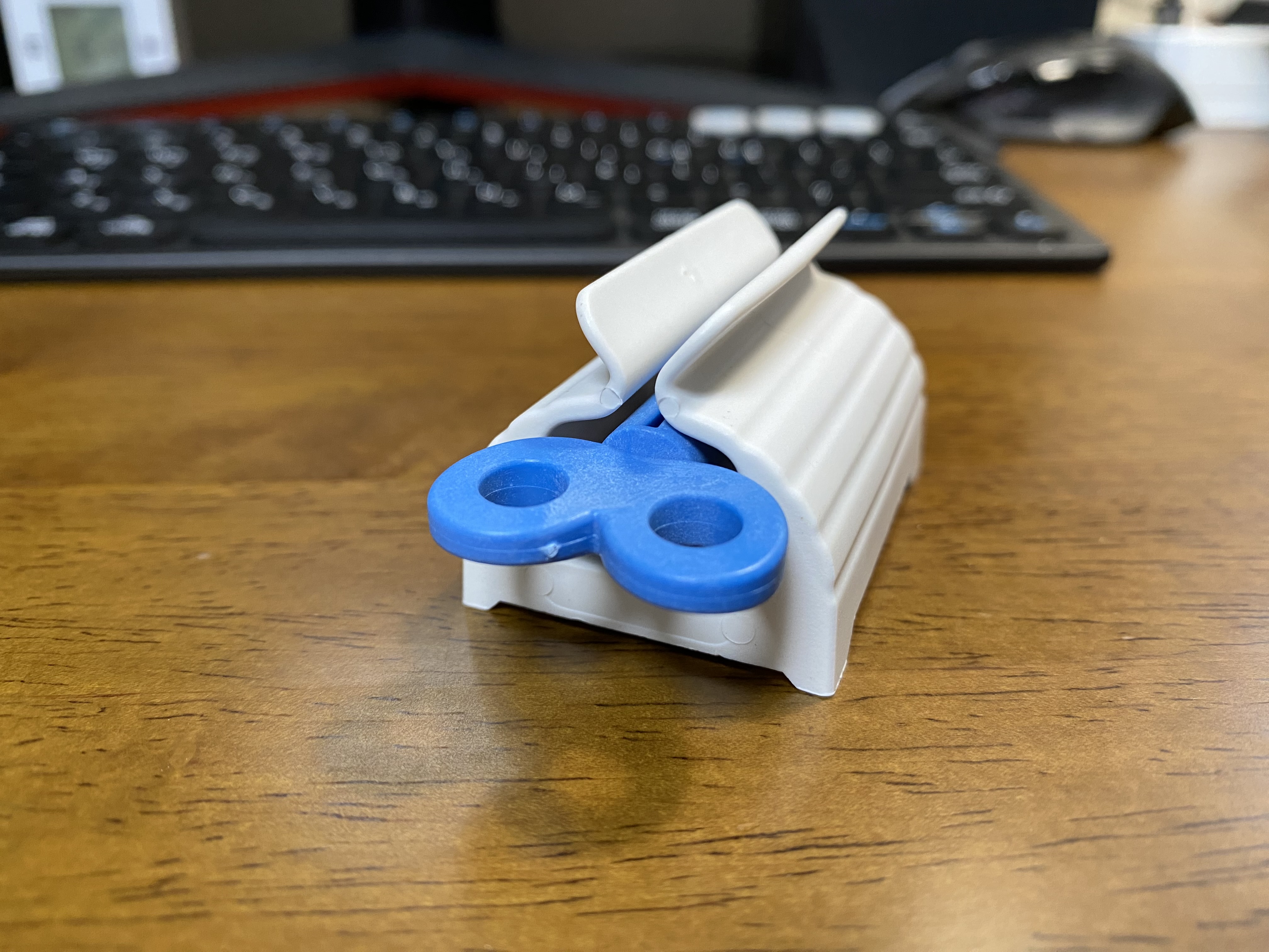 치약 디스펜서 흰색 본체에 파란색 볼트같이 생긴 부품을 끼우면 끝.