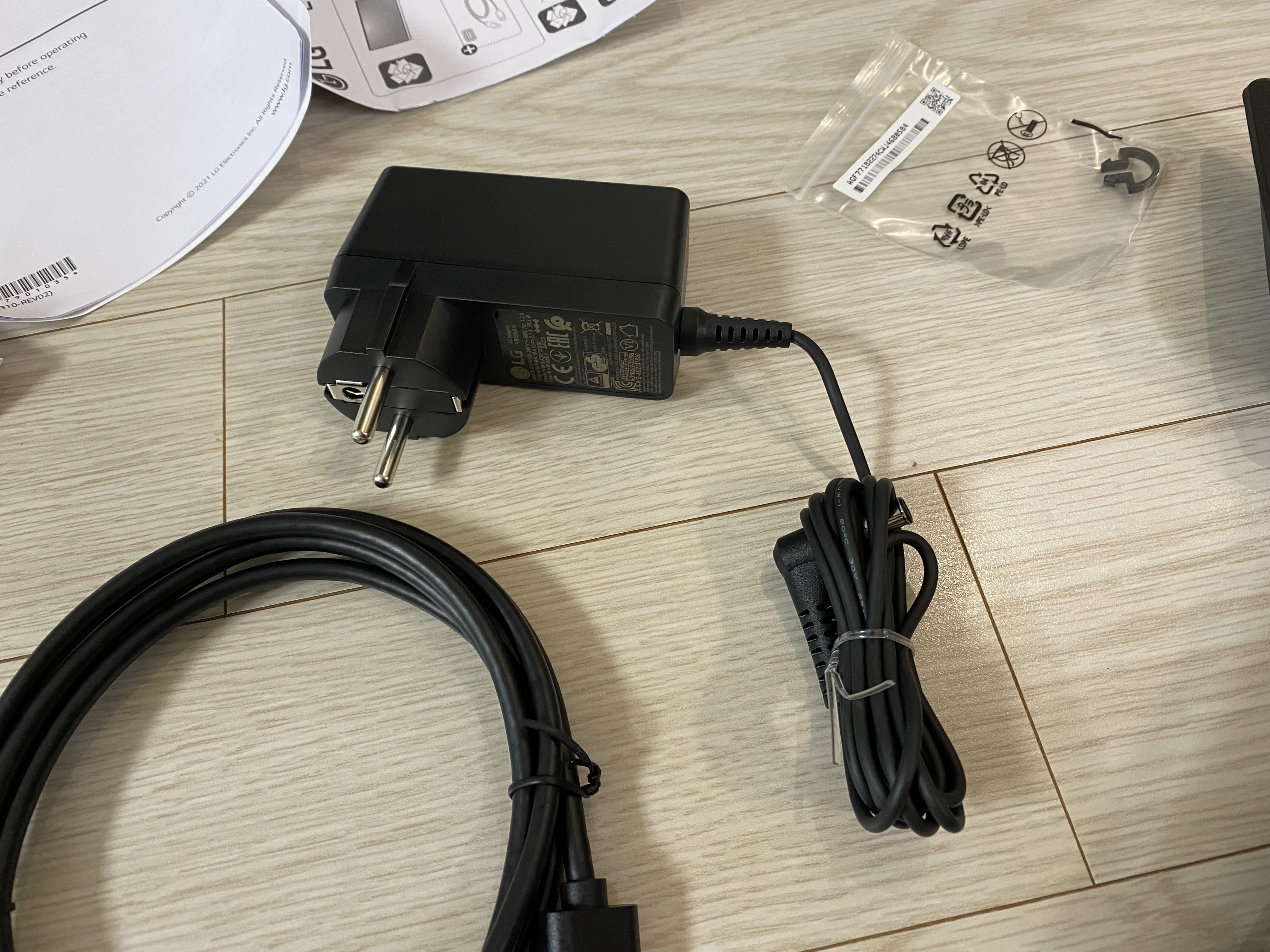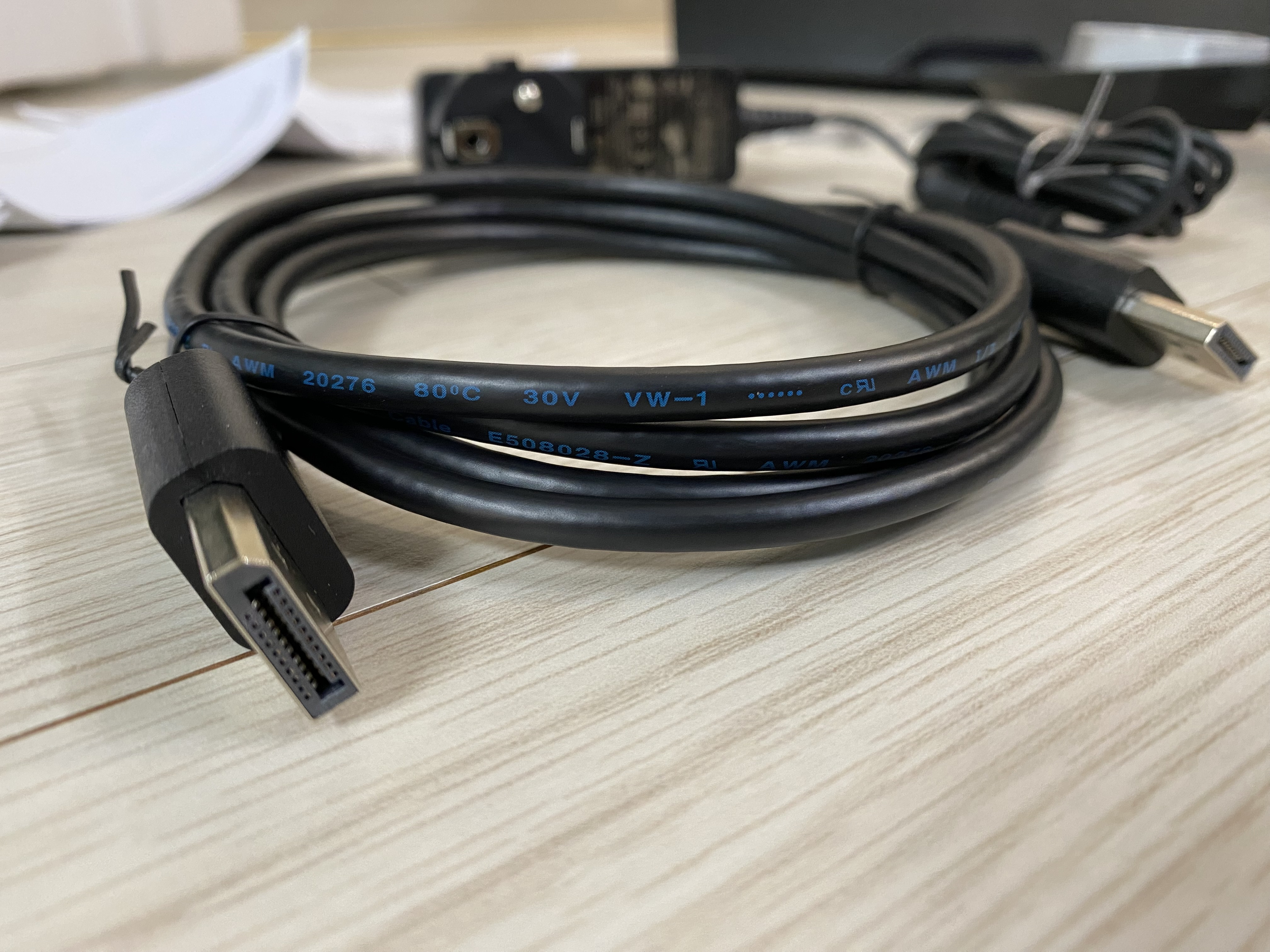 모니터 거치대와 전원 어댑터, DP 케이블