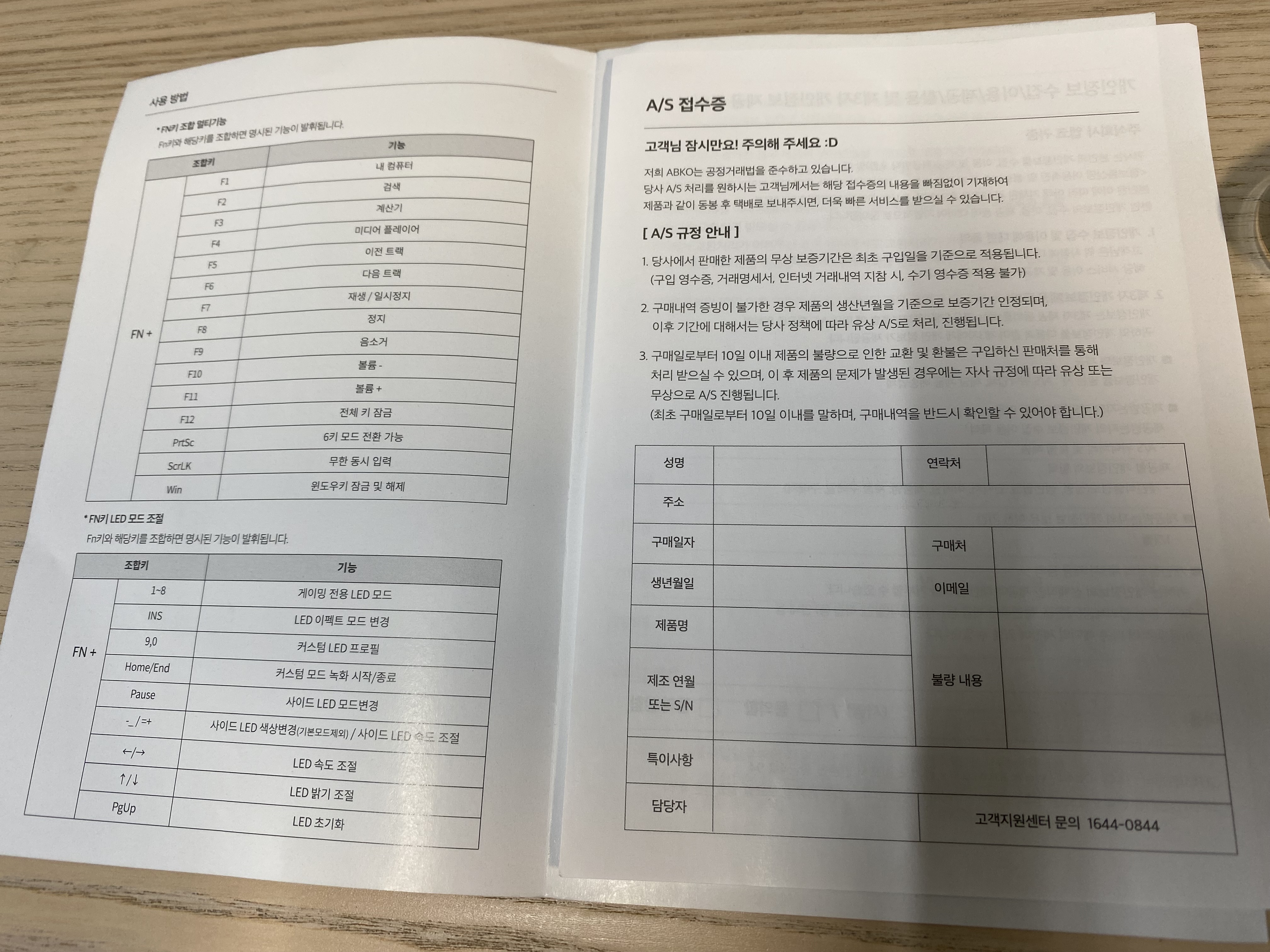 혹시나 해서 설명서를 한 컷 찍어놨습니다. 나중에 키보드 LED 라이트 제어 단축키를 까먹는 경우가 있어서 이렇게 사진으로 남겨봅니다. 참고하세요. 불륨 조절 같은 건 편리하기 때문에 알아두면 좋습니다. 혹시나 해서 하는 말인데 FN + F12는 전체 키 잠금입니다. 이 조합을 모르고 누르고 키보드 고장 났다고 할 수 있으니 조심하세요.