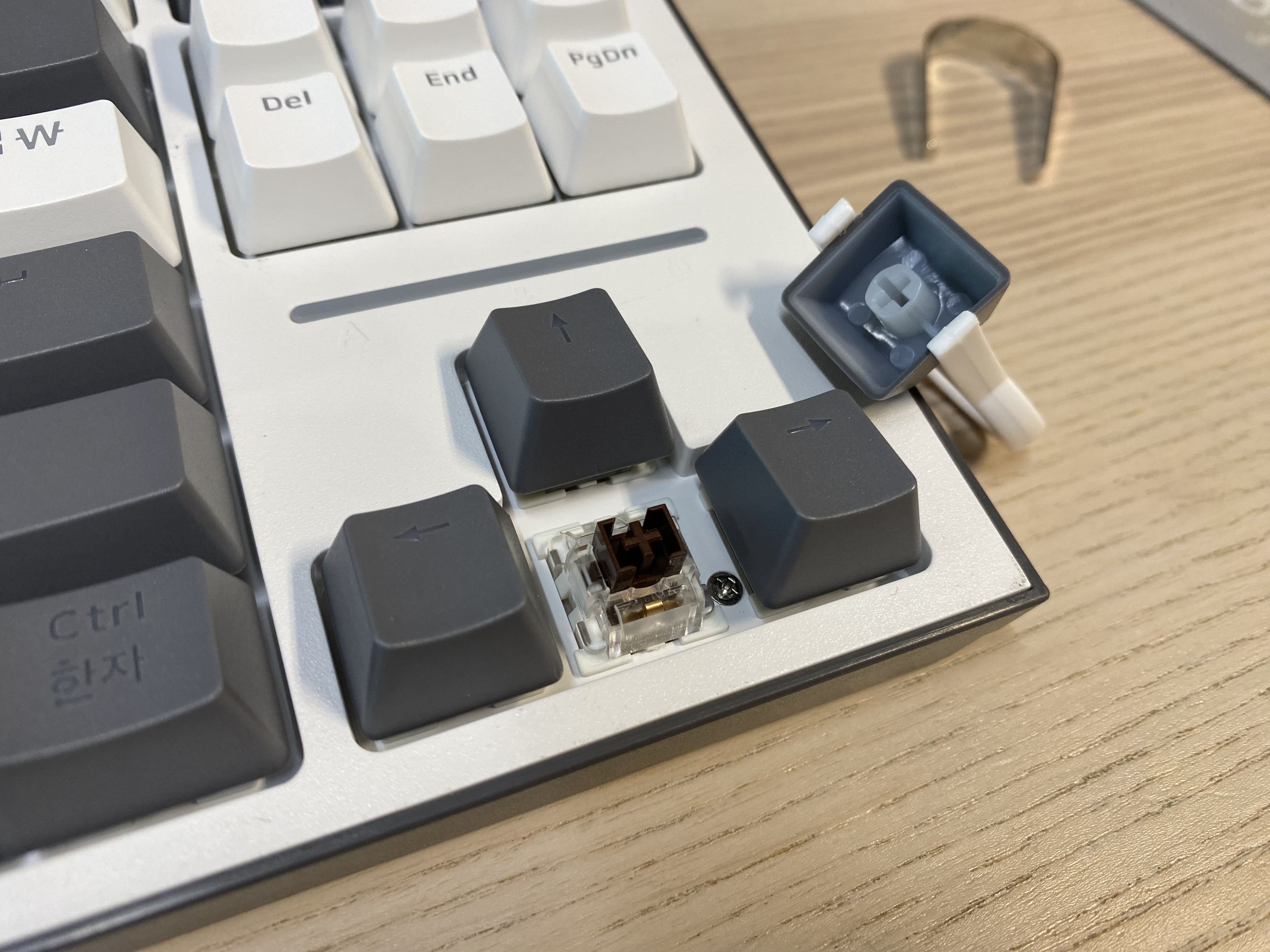 제품 박스에 포함된 키캡 리무버로 키캡 제거. 갈축 확인. 집에 있는 다른 기계식 키보드들은 축이 그냥 쏵 빠지는데 이 CK01 TKL 제품은 생각보다 축이 잘 빠지지 않습니다. 너무 안 빠져서 과연 이게 빠지는지 의심이 되는 수준입니다. 결국에는 키보드 고장 날까 봐 그냥 포기. 축교환이 쉽지는 않겠습니다.