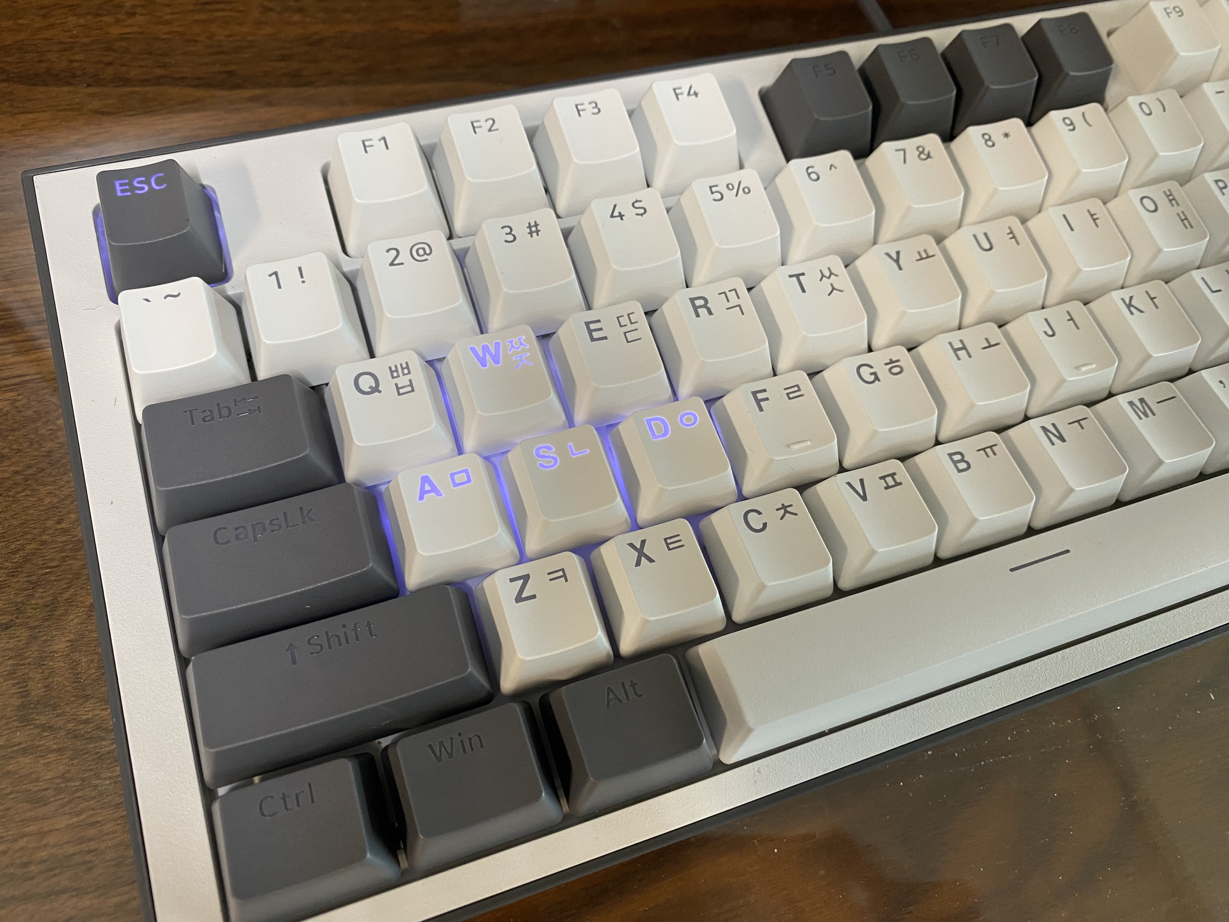 콕스 COX CK01 TKL 기계식 텐키리스 게이밍 키보드를 컴퓨터에 연결한 모습입니다. 이 키보드는 위쪽 키보드에 표시되는 LED 불빛은 화이트로 고정되어 있습니다. 무지갯빛 알록달록 색상을 기대하는 분이라면 다른 키보드를 사세요. 요즘 저렴한 키보드들 거의 다 RGB 색상을 지원하는데 이 제품은 아니네요. 신기합니다.