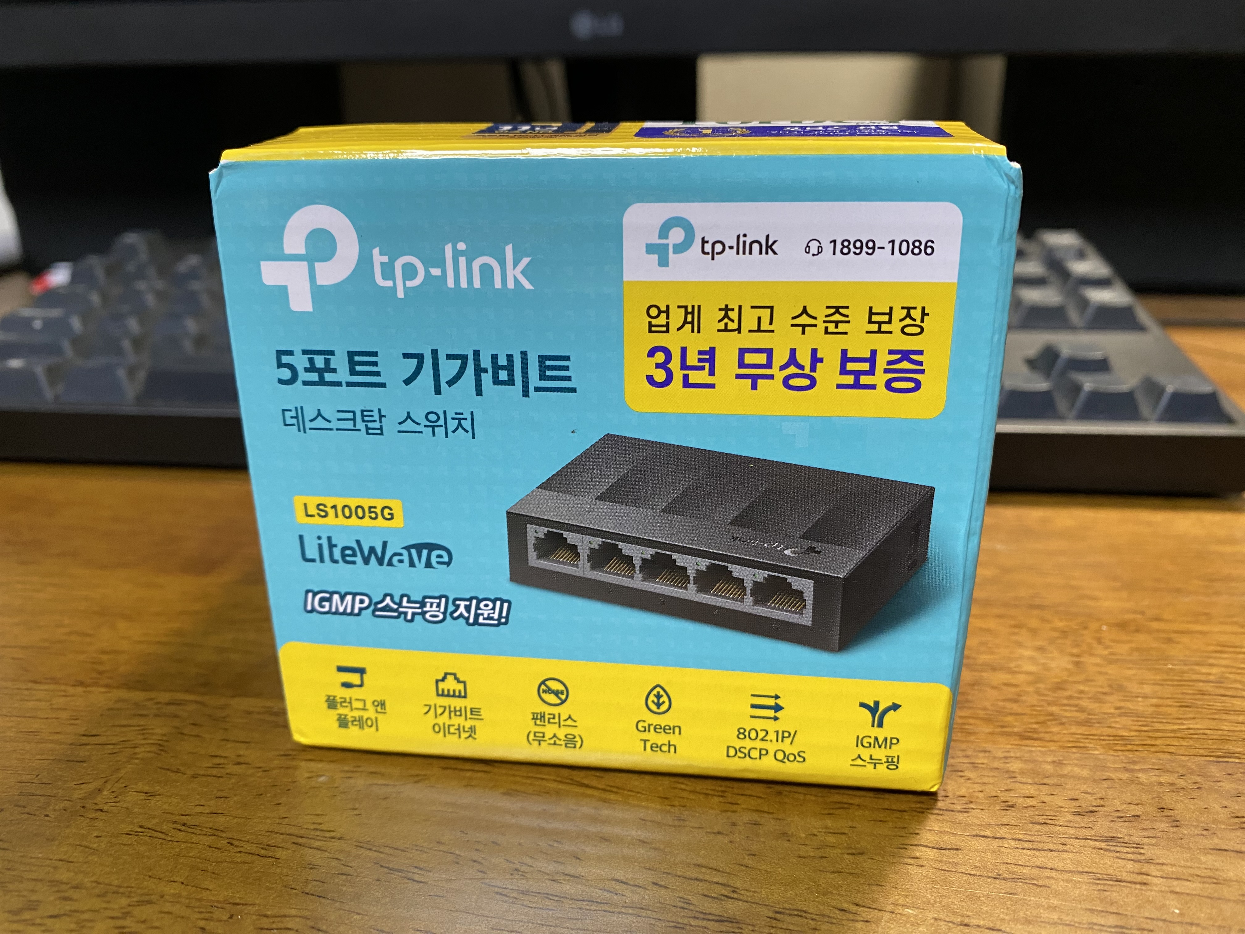 집에서 무선공유기도 사용하고 있지만 이런저런 기기를 물려서 사용하다 보니 랜선을 연결할 포트가 부족하네요. 그래서 스위칭허브를 하나 샀습니다. 'tp-link 티피링크 5포트 기가비트 데스크탑 스위치 LS1005G'라는 제품인데 쿠팡에서 사람들이 많이 구매할 제품이길래 그냥 이걸로 샀습니다. 가격은 1만 원이 조금 넘습니다. 사실 스위칭허브는 크게 기술력이 들어가는 제품이 아니라서 적당하게 가성비 좋은 제품으로 구매하면 될 것 같습니다.