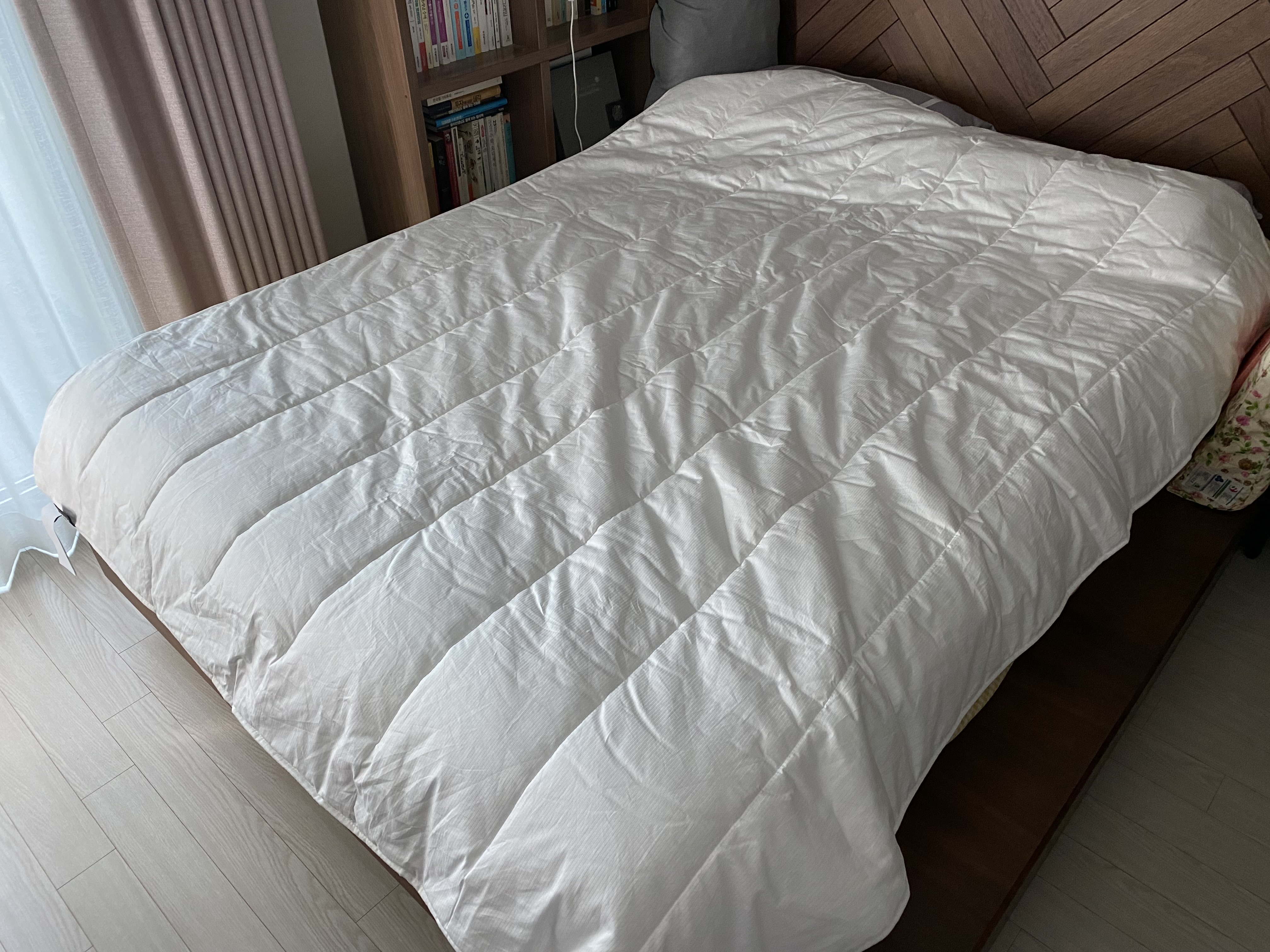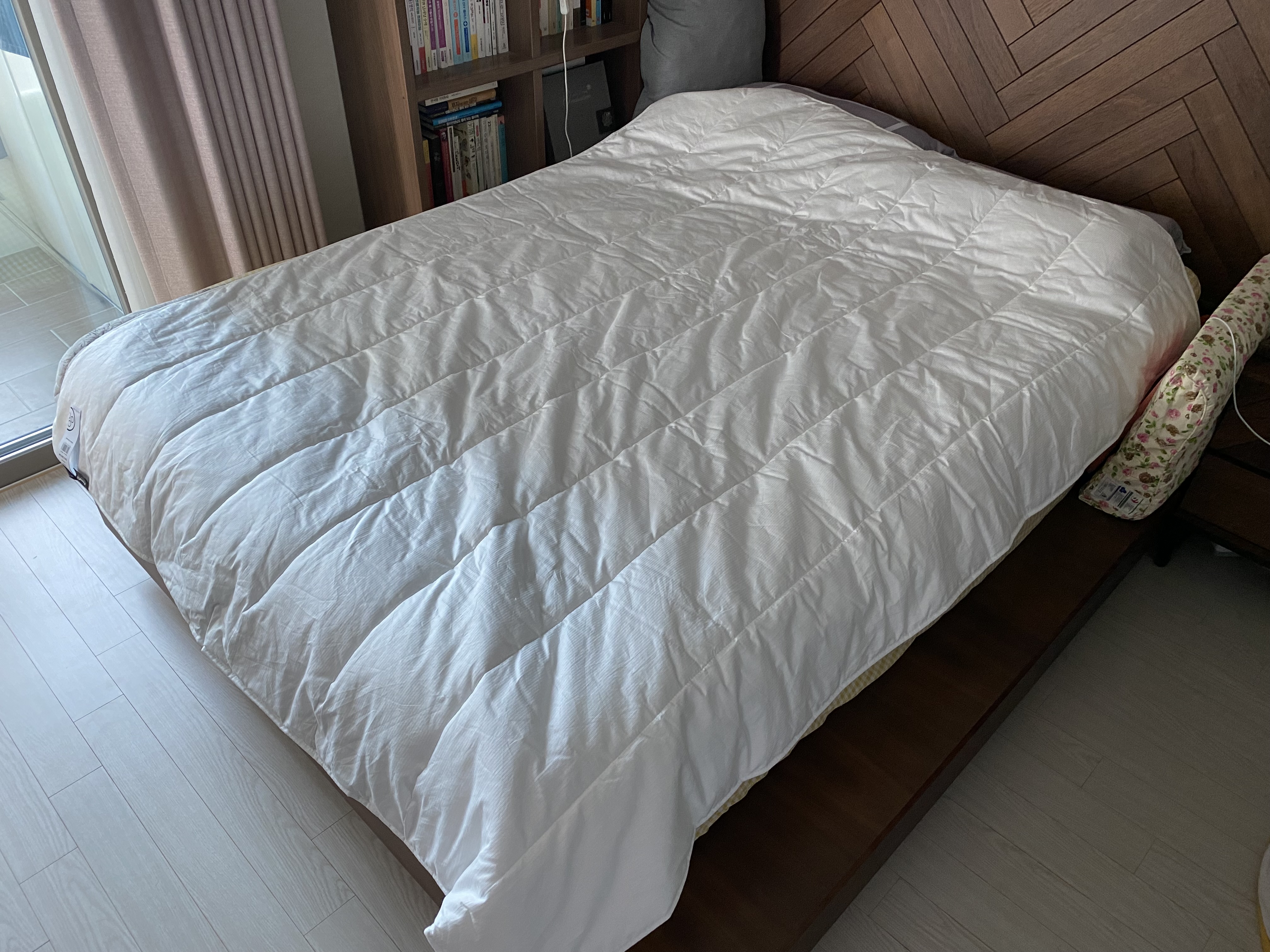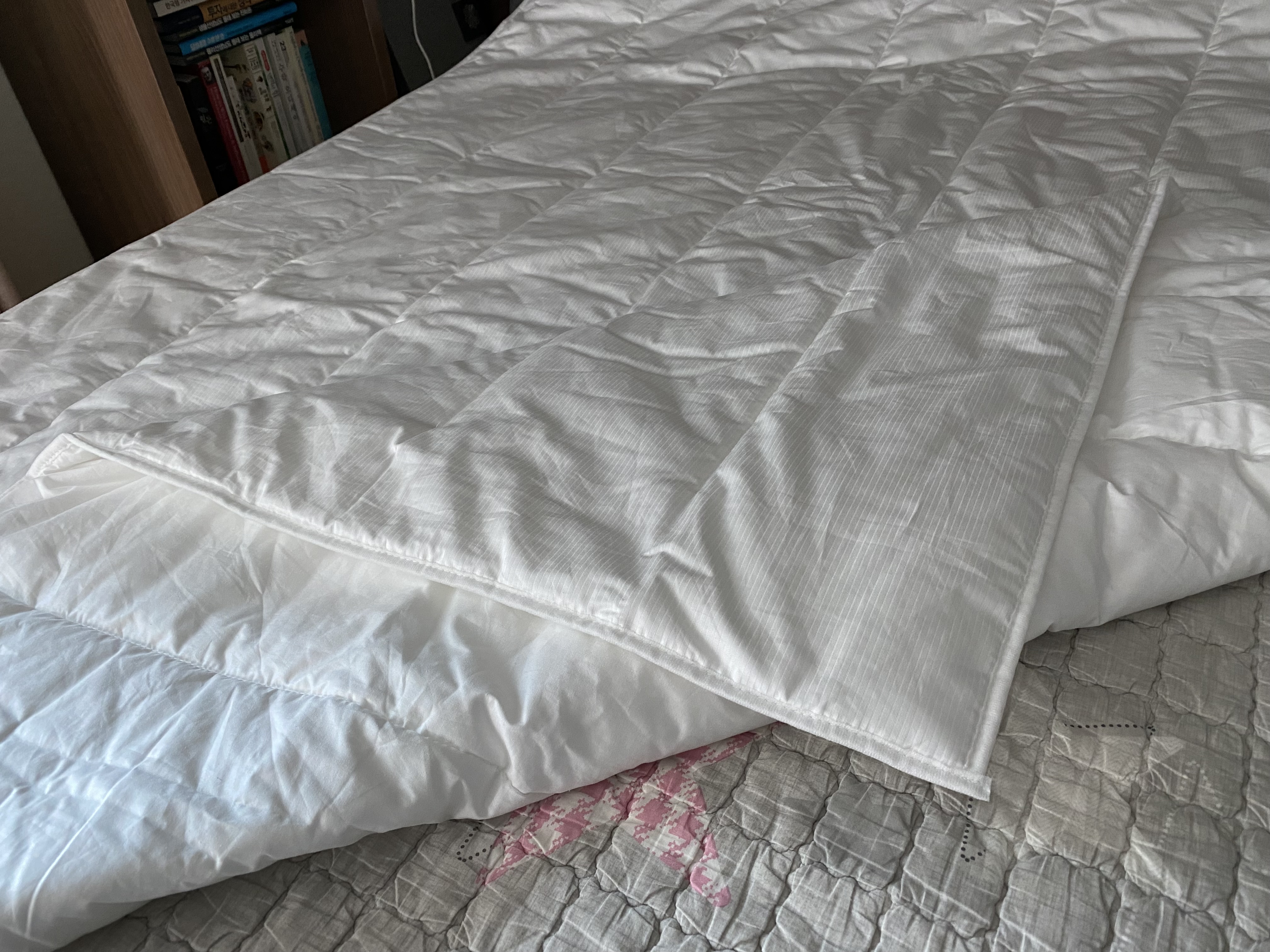 아마도 눈으로 보는 것보다 직접 만져보면 더 좋아할 것 같습니다. 이 무난하고 좋은 감촉을 표현할 방법이 없네요. 알레르망 같이 비닐느낌의 맨들맨들한 것도 아니고 여름 이불 같이 바스락 거리는 것도 아닌 부드러운 면 느낌으로 몸에 착 감기는 그런 이불입니다.