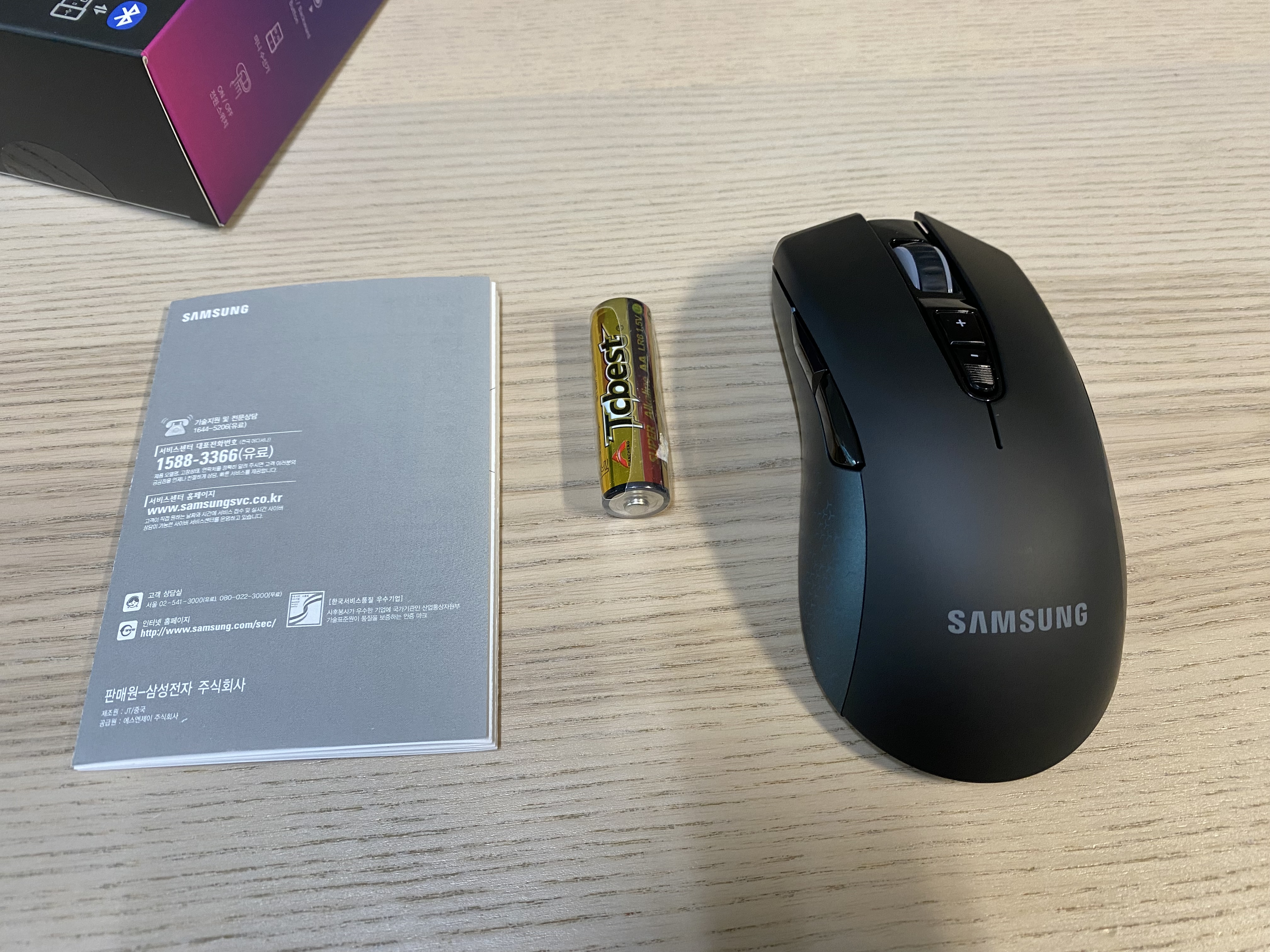 삼성 무선 마우스 제품 구성은 이렇습니다. 마우스, 배터리, 설명서 끝.