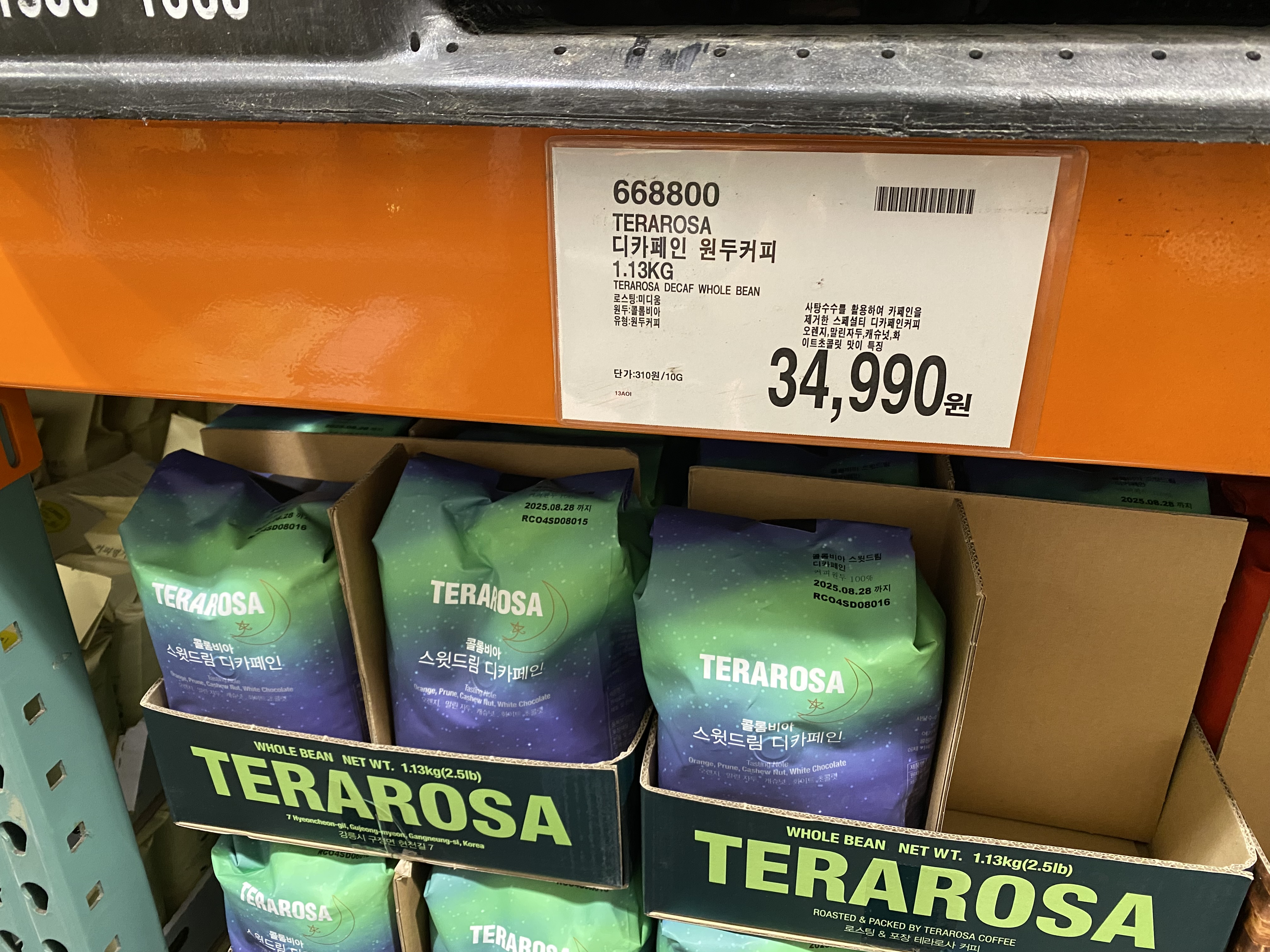 코스트코를 오래 이용하다 보니 거기에 있는 커피 원두를 거의 다 먹어본 것 같습니다. 이번에는 코스트코에 있는 유일한 디카페인 원두를 사봤습니다. TERAROSA 테라로사 콜롬비아 스윗드림 디카페인 원두 커피인데 가격은 34,990원입니다. 매장 가격표를 보면 이렇게 적혀있습니다. 사탕수수를 활용하여 카페인을 제거한 스페셜티 디카페인커피. 오렌지, 말린 자두, 캐슈넛, 화이트 초콜릿 맛이 특징.