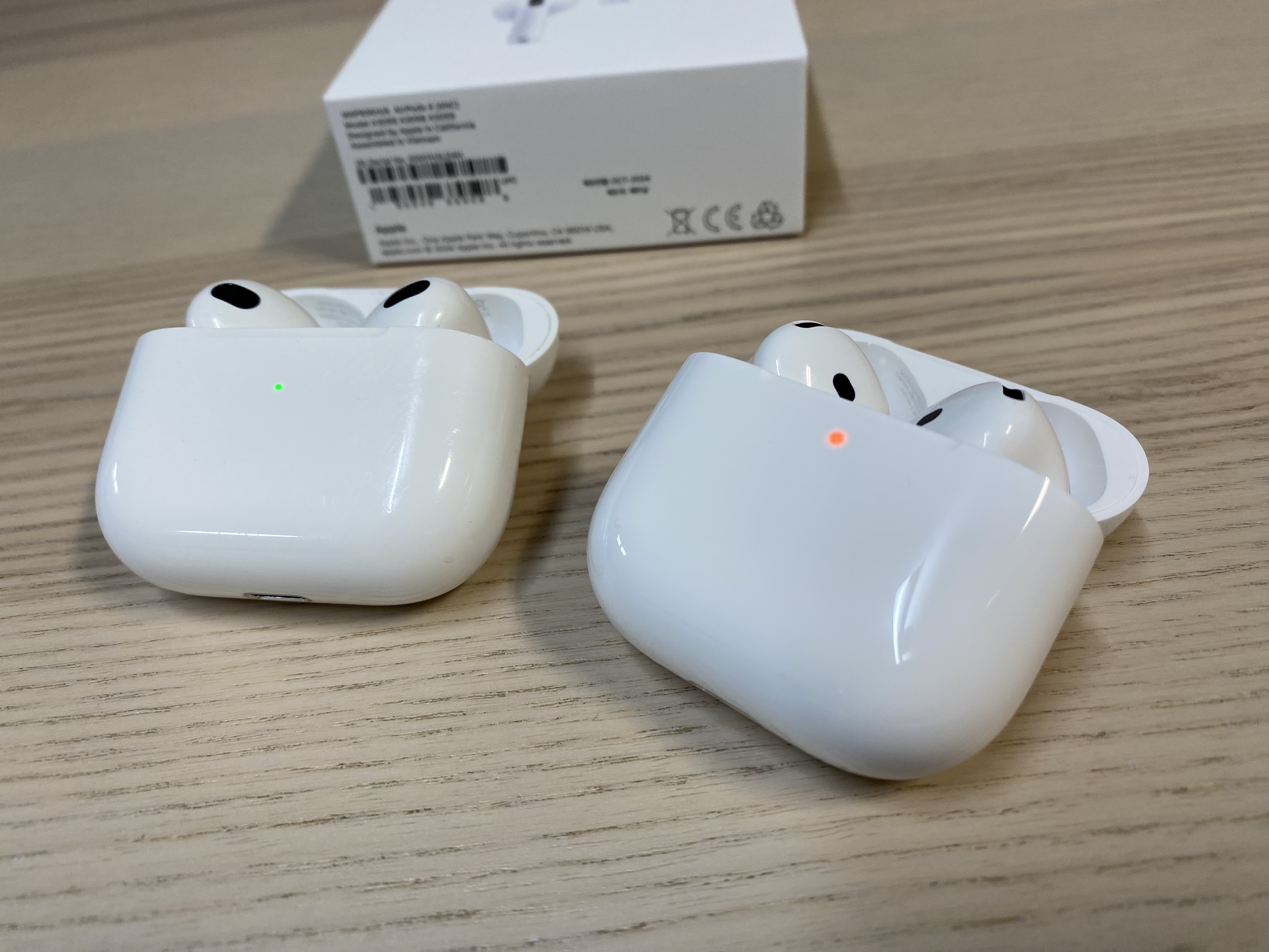 에어팟 3세대와 에어팟 4세대의 비교 컷입니다. 왼쪽이 에어팟 4세대입니다. 확실히 케이스가 작아진 것을 볼 수 있습니다. LED 점도 사라졌는데 내부에 LED가 있어서 불빛은 나옵니다.