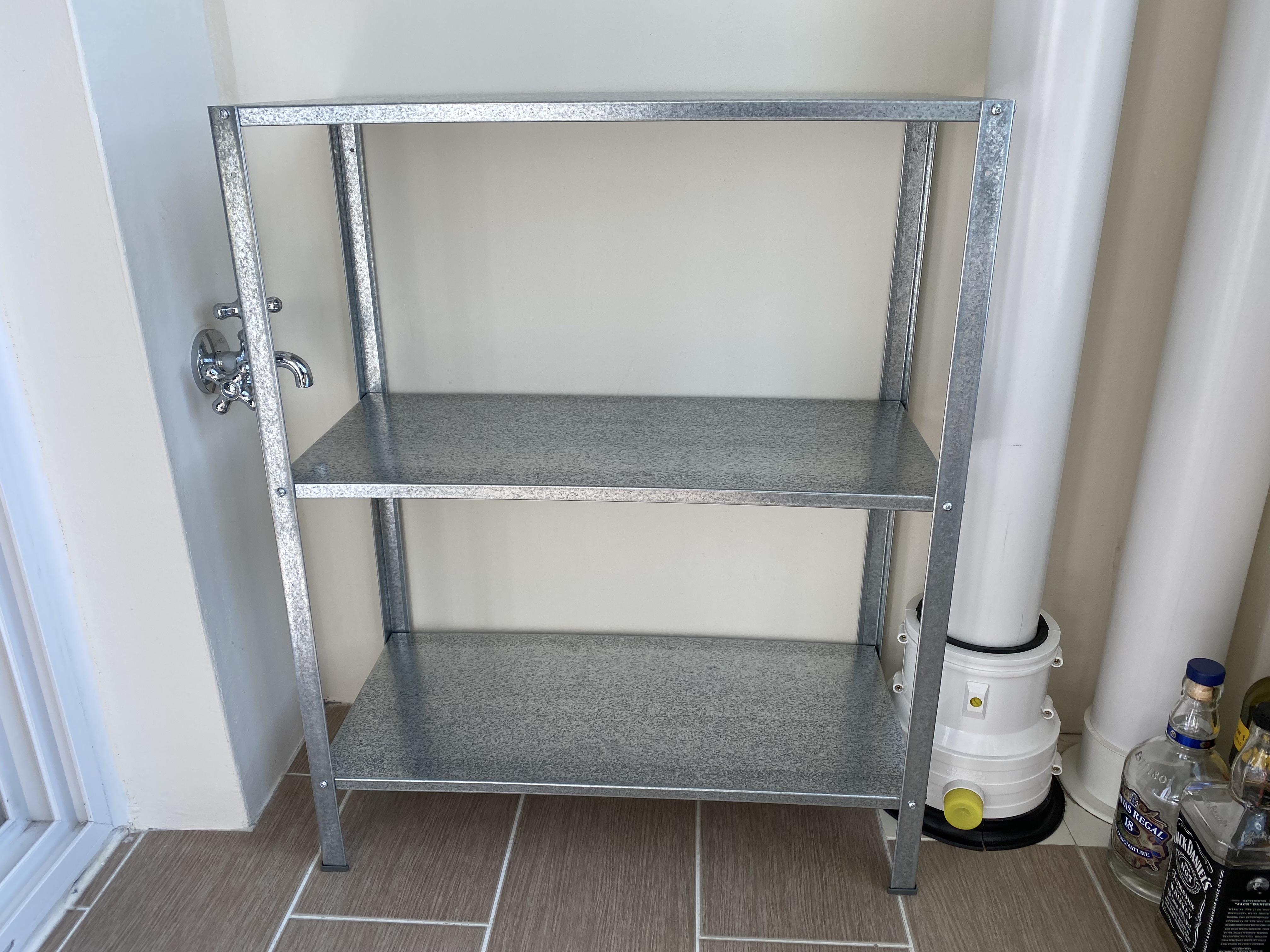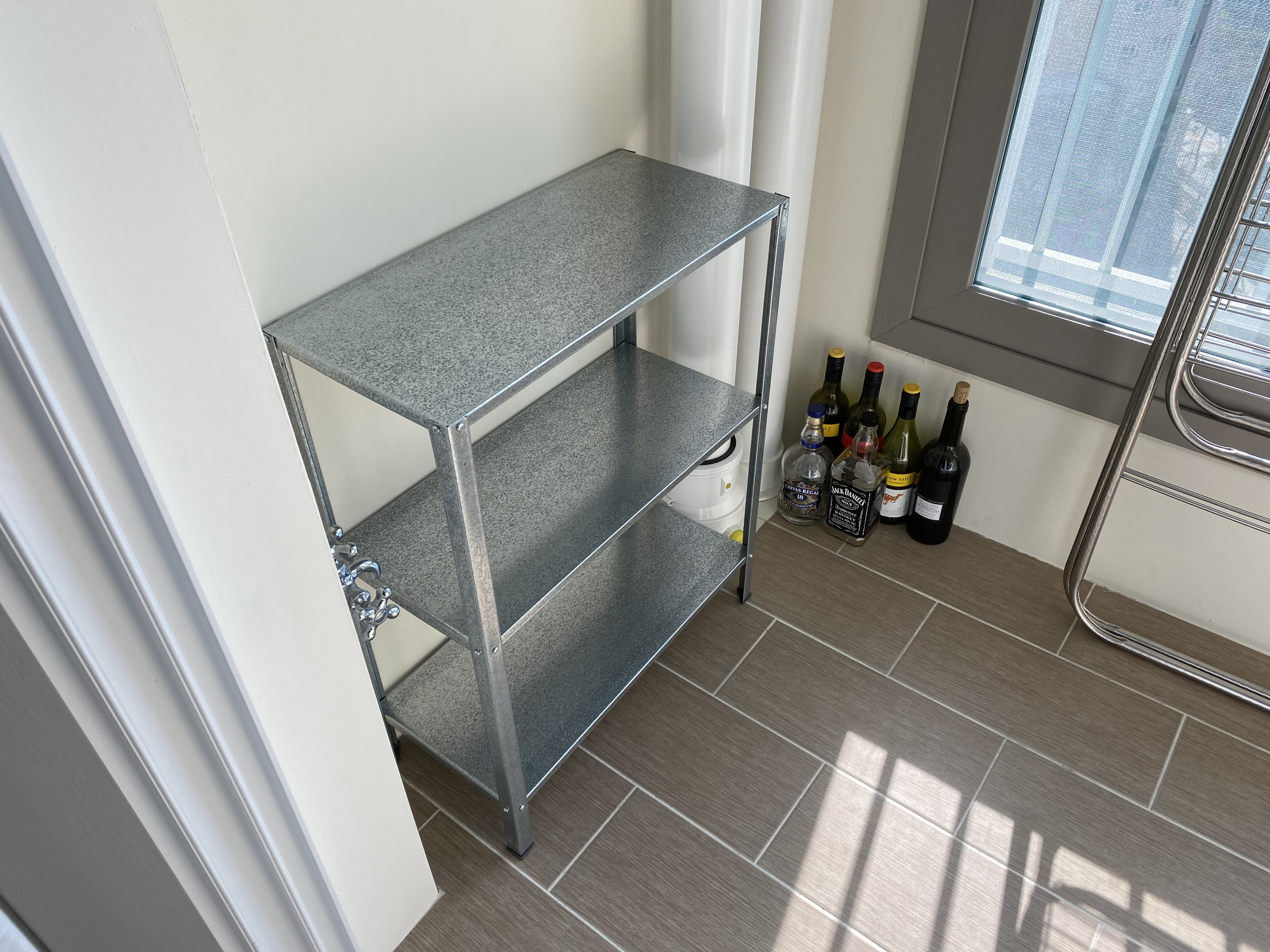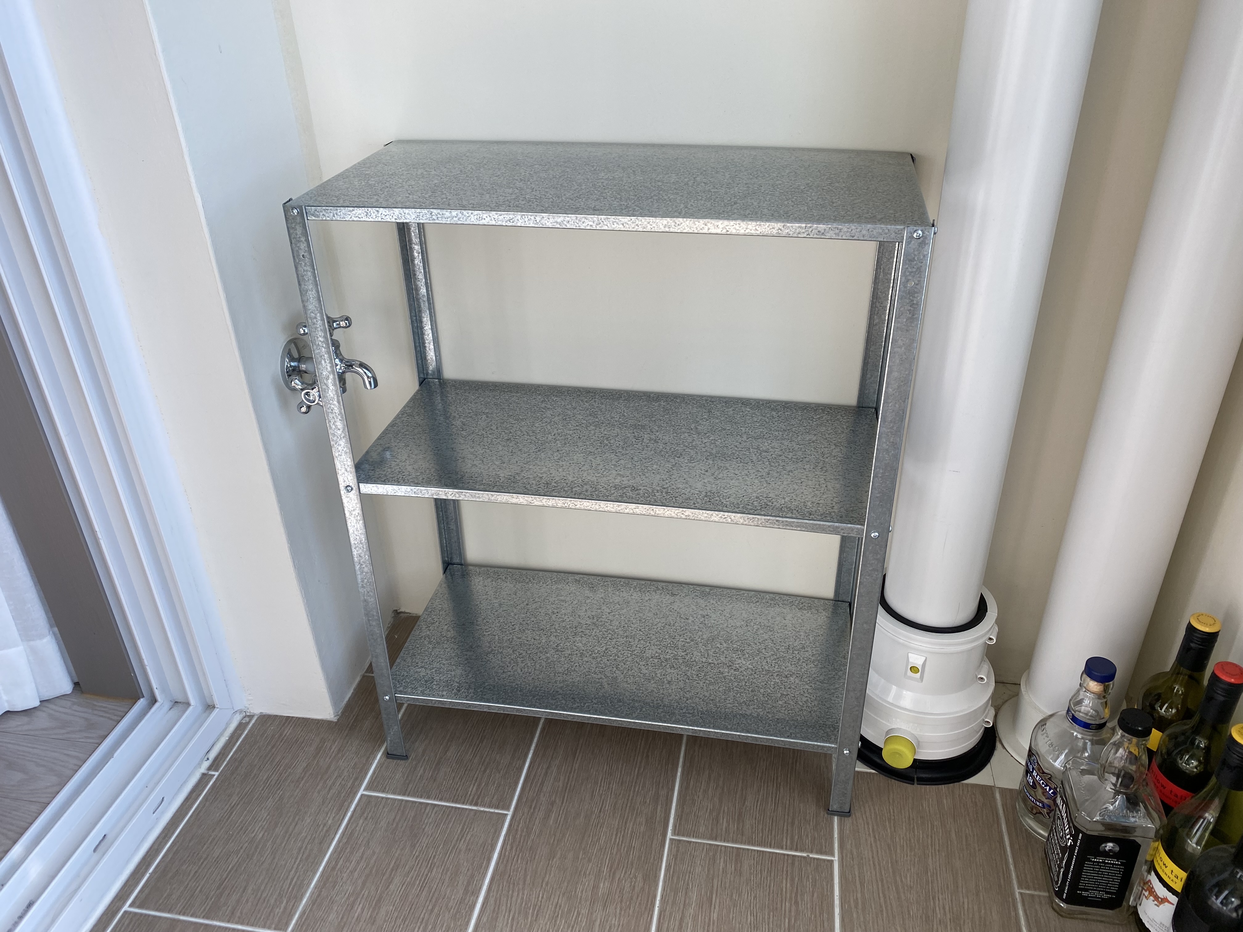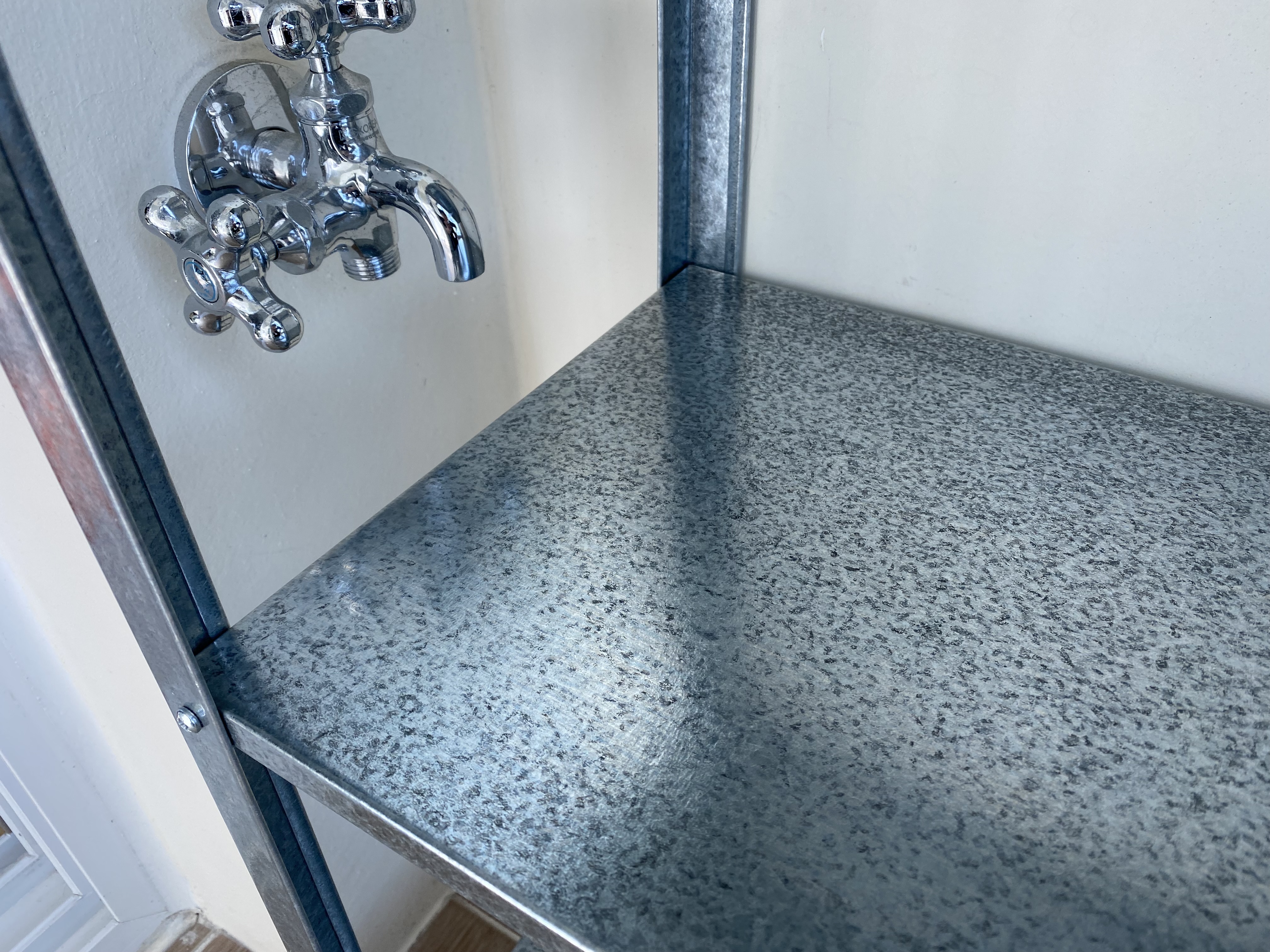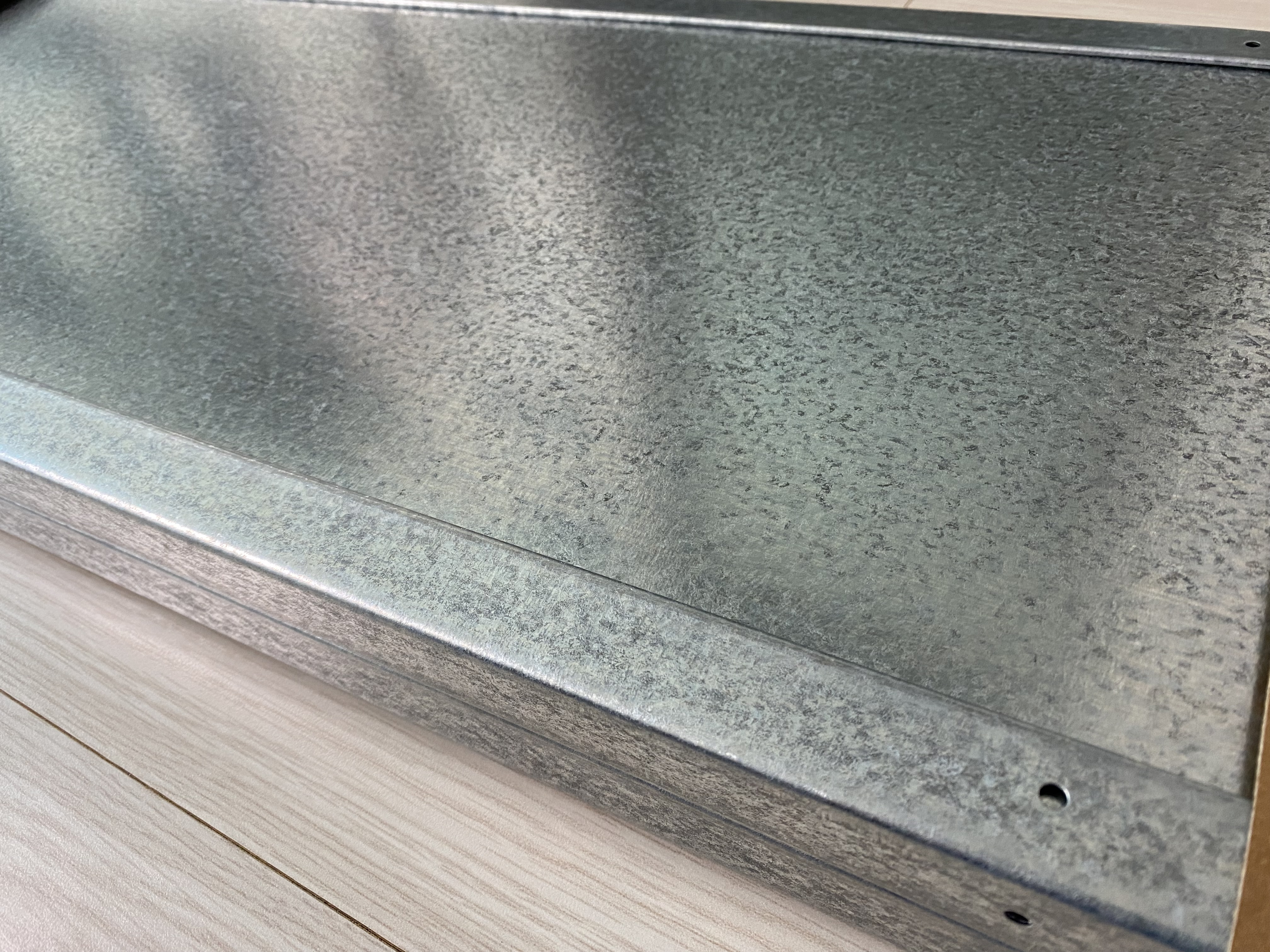 휠리스 선반 표면은 우리가 주로 환기시설 덕트 공사를 할 때 사용하는 함석 같은 느낌인데 역시나 아연도금스틸이라고 하네요. 실내보다는 실외(현관, 베란다)에 어울리는 제품이라 생각합니다.
