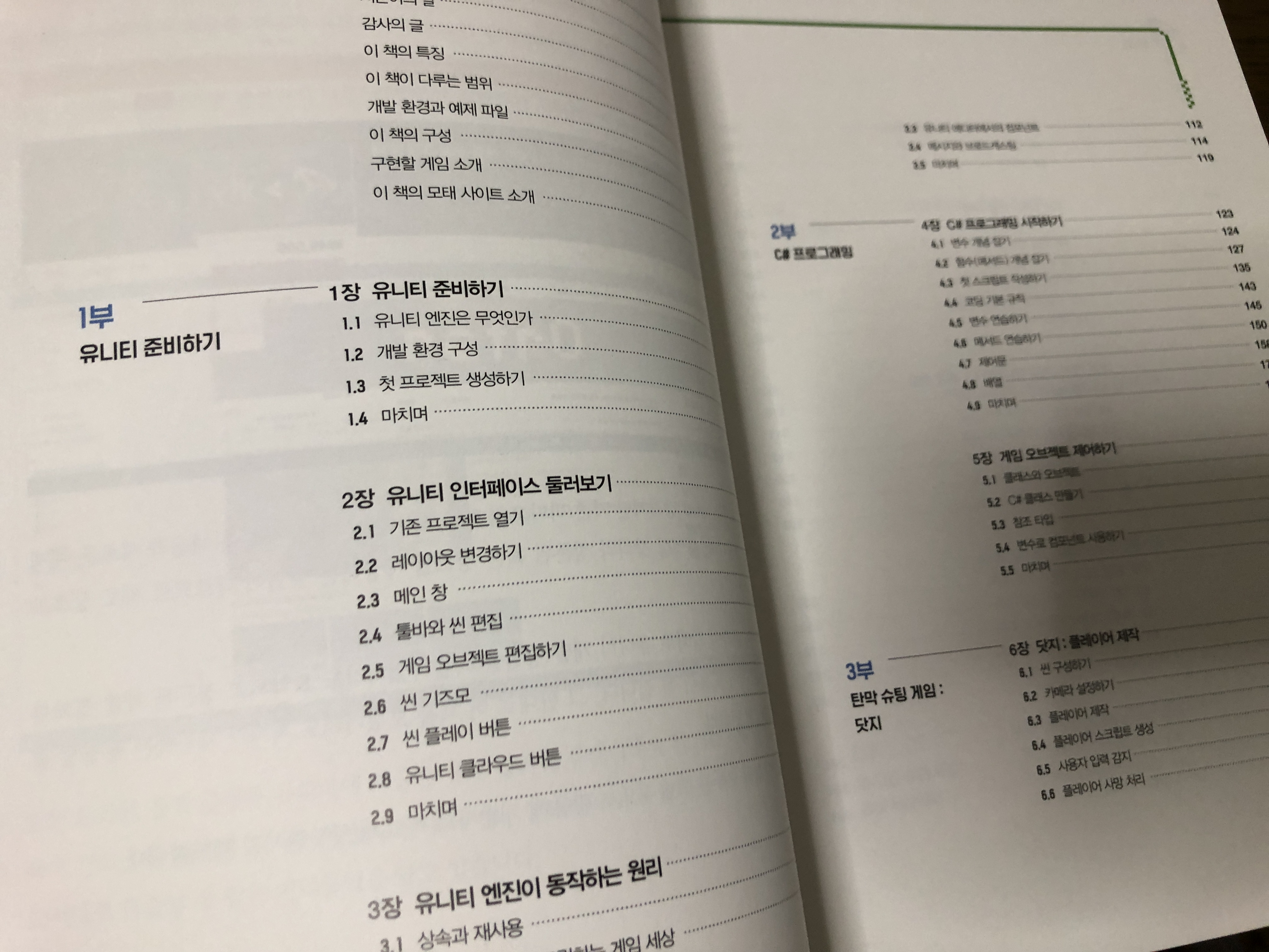 1장부터 5장까지는 유니티의 기초 중 기초다. 유니티가 뭔지, 유니티 설치하는 방법, 에디터 유니티로 어떻게 개발하는지, C# 프로그래밍 언어로 어떻게 코딩을 하는지 배운다. 개발 경험이 없다면 이 부분도 조금 어렵겠지만 유니터 개발화면을 모두 캡쳐해서 보여주고 있어서 따라하기에 큰 문제가 없을 것이다. 이 책의 거의 모든 내용을 따라 해봤는데 버그나 오류는 없었다.