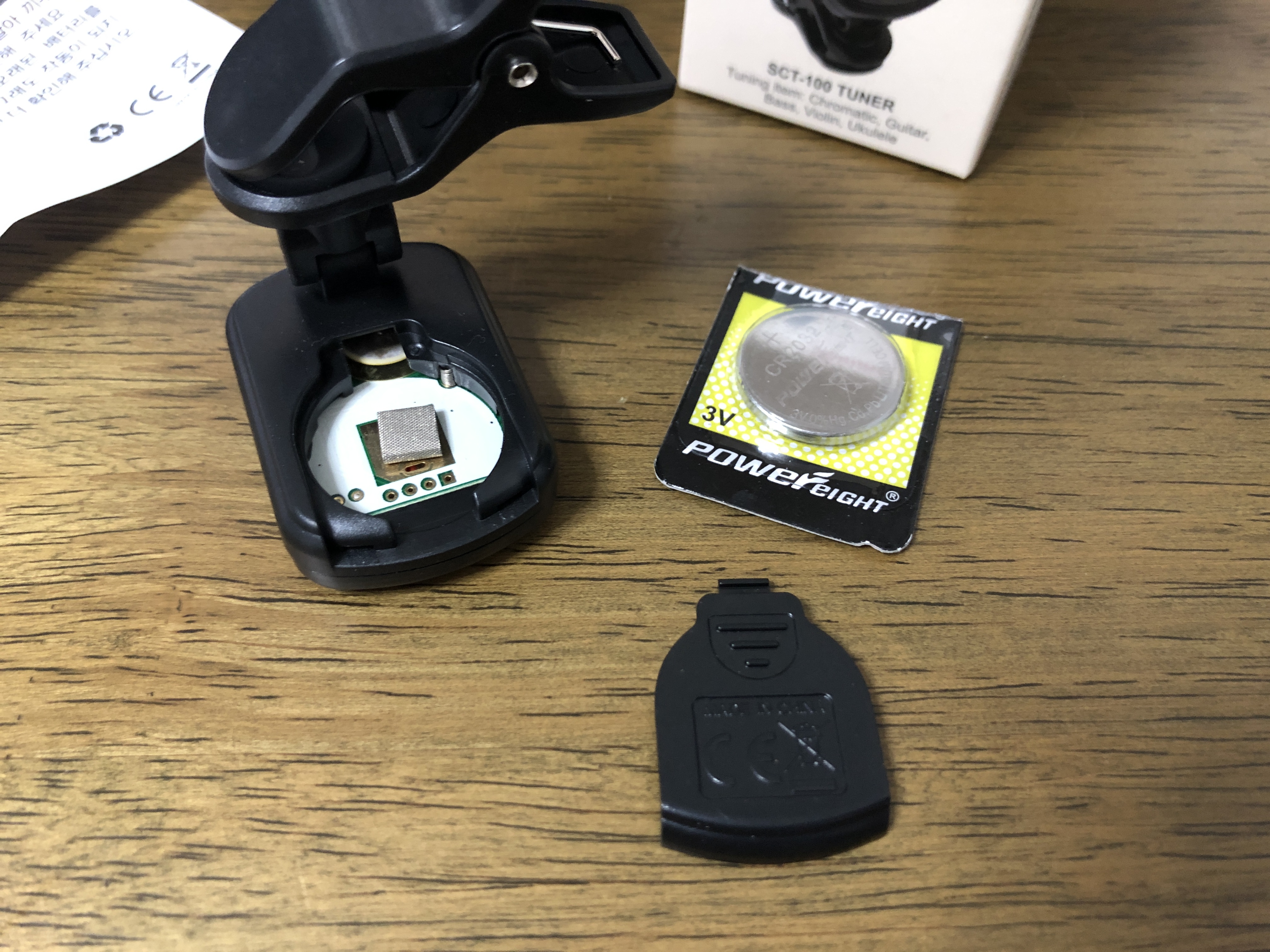 튜너에 건전기를 넣은 모습입니다. CR2032 배터리 1개가 들어갑니다.