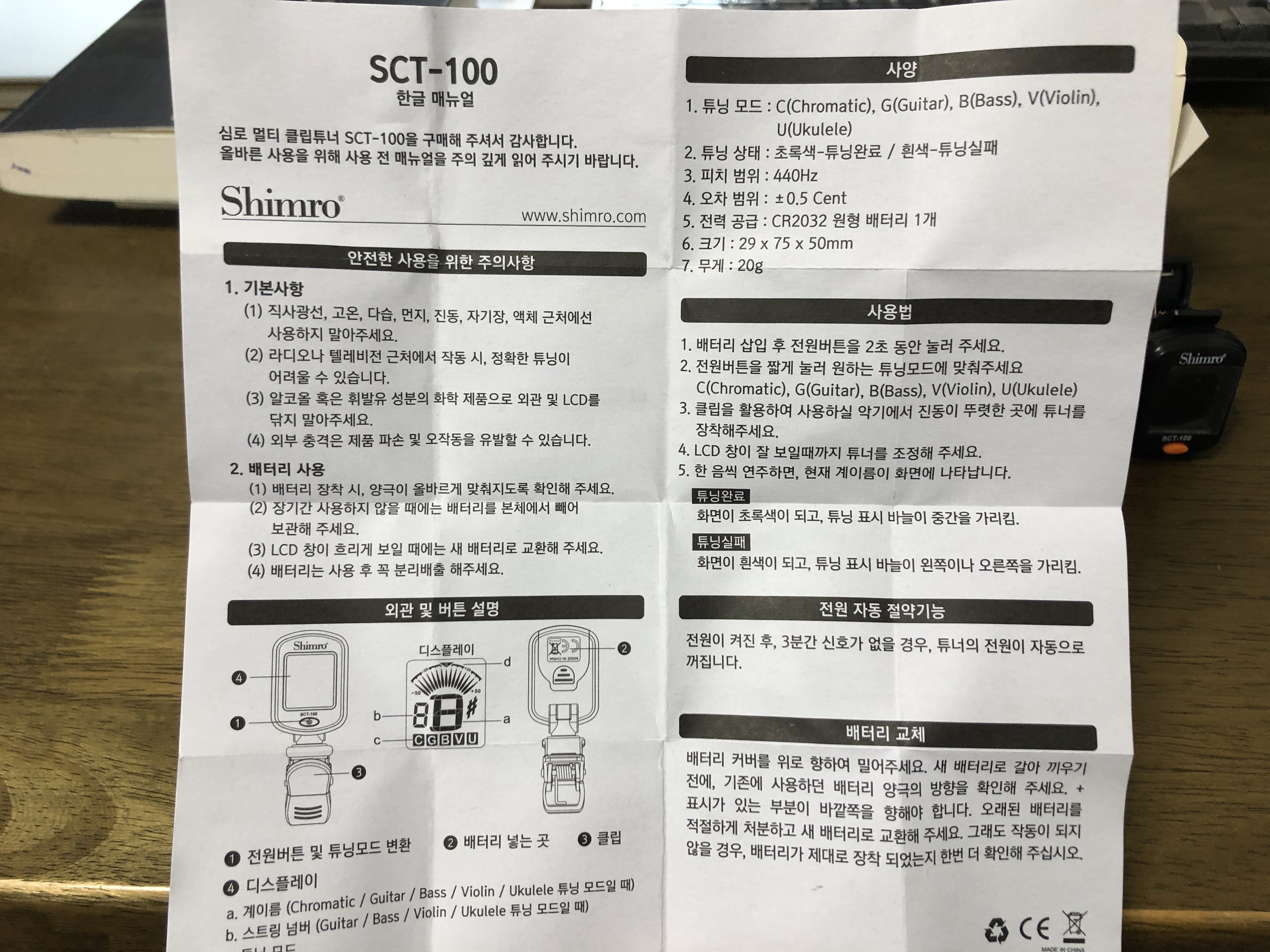 Shimro 심로 튜너 SCT-100을 개봉한 모습입니다. 클립형 튜너 하나와 설명서 그리고 건전지가 들어있습니다.