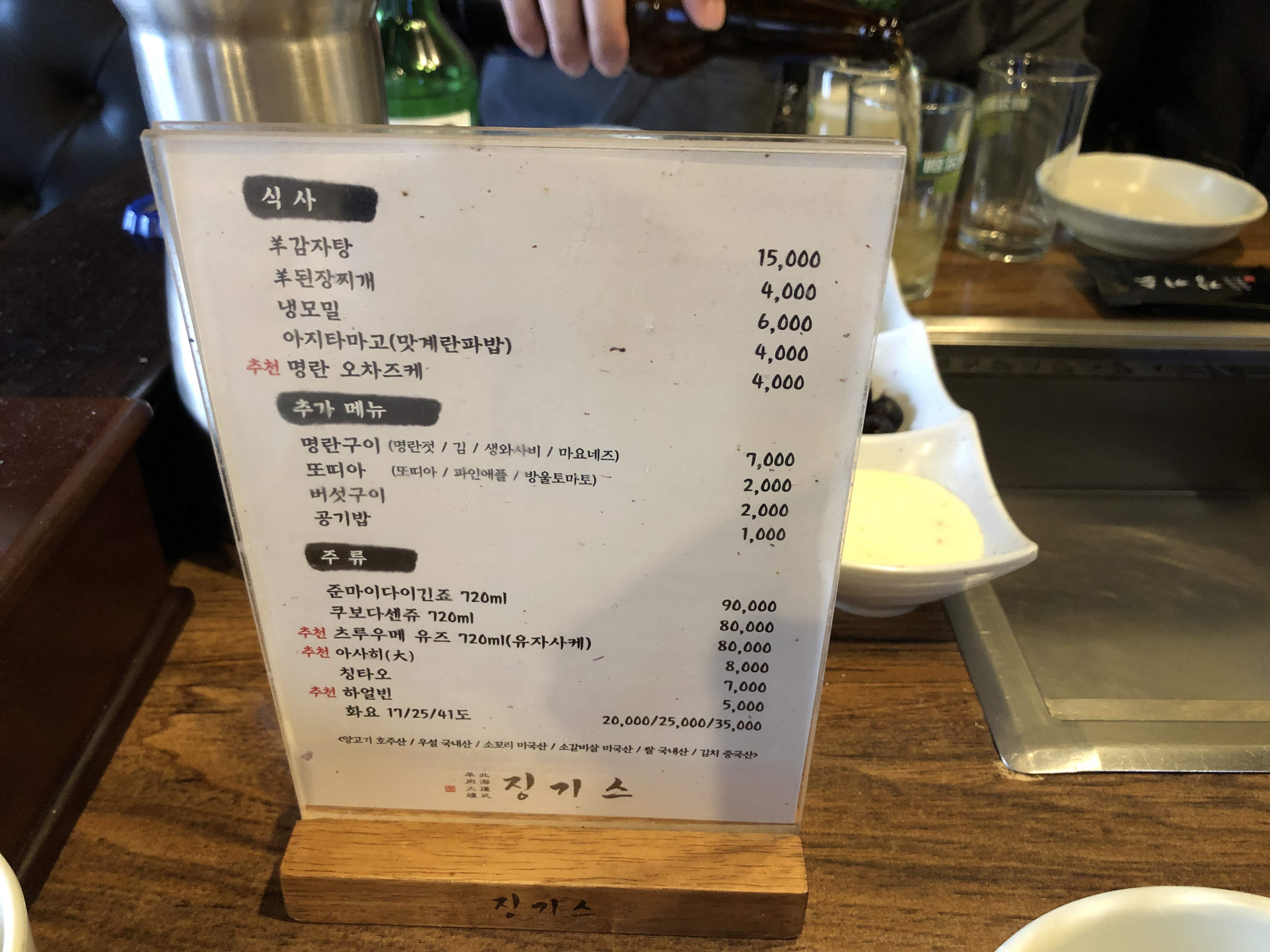 벽에 있던 징기스 메뉴판입니다.