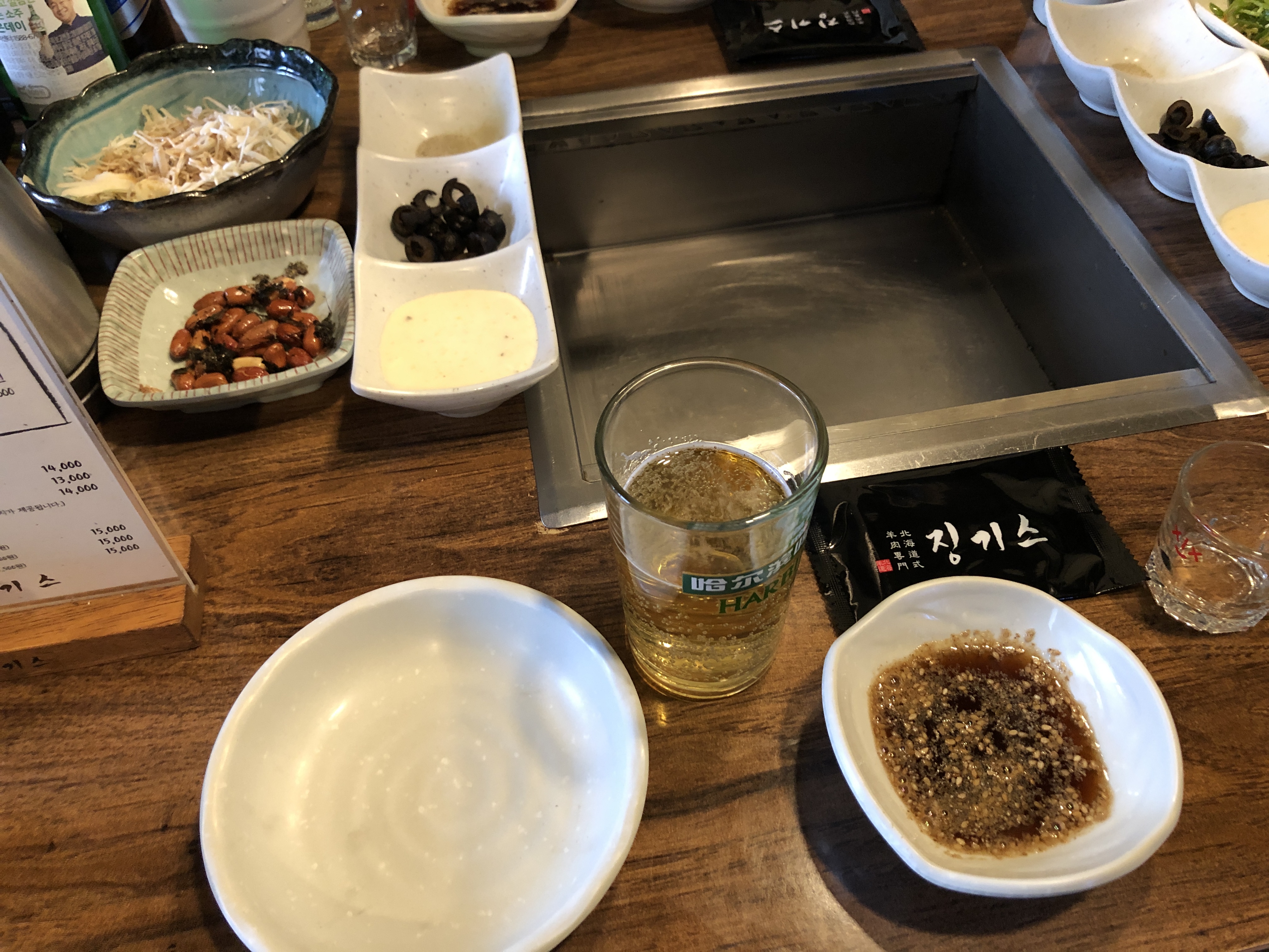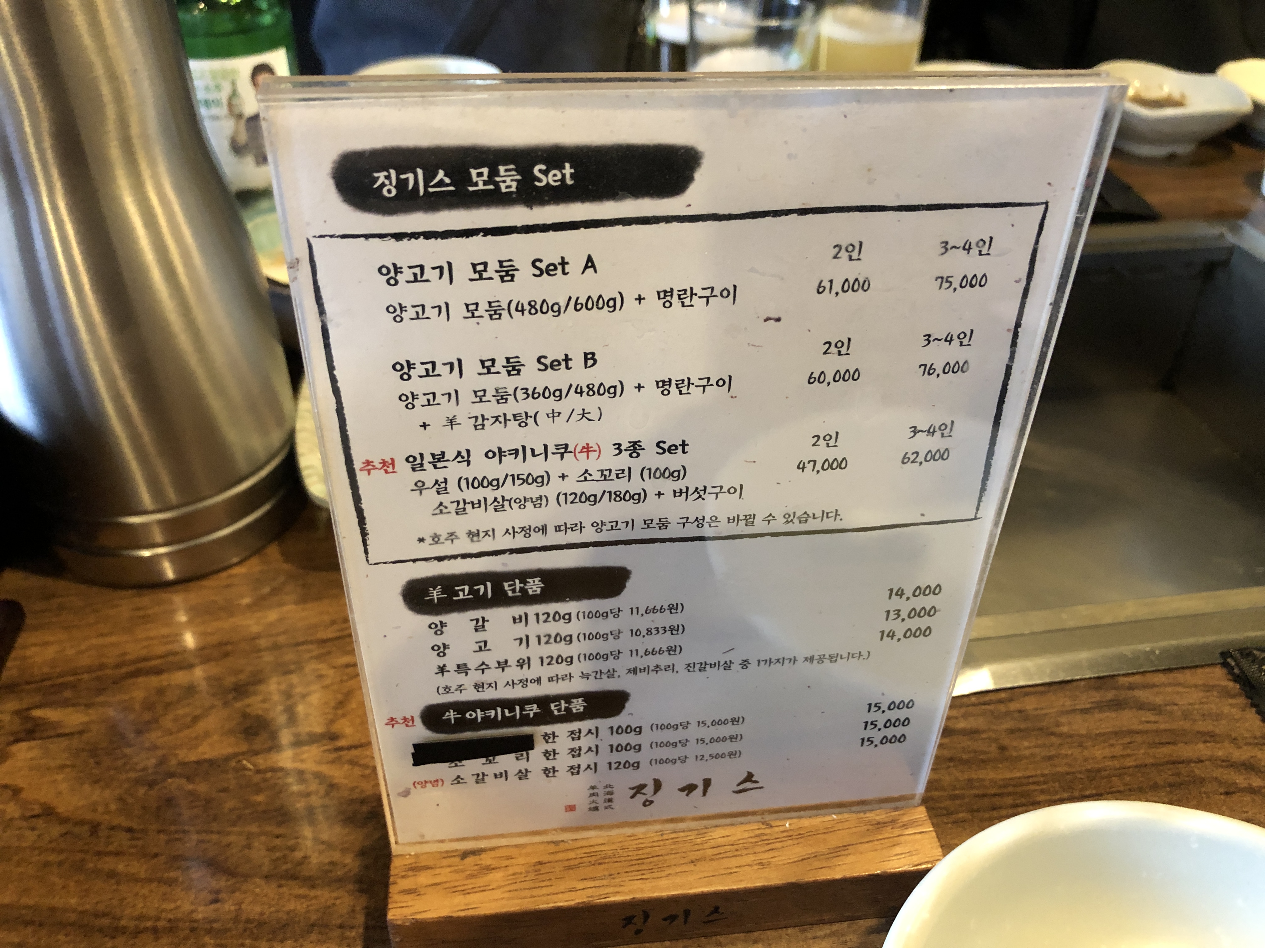 이건 테이블에 있던 메뉴판. 매장 분위기에서도 느꼈지만 아주 저렴한 고기집은 아닙니다. 3명이서 가서 메뉴판 가격을 보고 소심하게 61,000원하는 2인 양고기 모둠 Set A를 주문했습니다. 근데 비싼데는 다 이유가 있었습니다. 일단 고기맛이 좋았습니다. 그리고 직원이 직접 고기를 다 구워주고 어떻게 먹는지 설명까지 해주고 한가한 시간대에 가서 그런지 아무튼 서비스가 좋았습니다. 다음에는 돈 생각안하고 3~4인으로 주문을 할 생각입니다. 근데 2인분도 양이 그렇게 적지는 않았습니다.