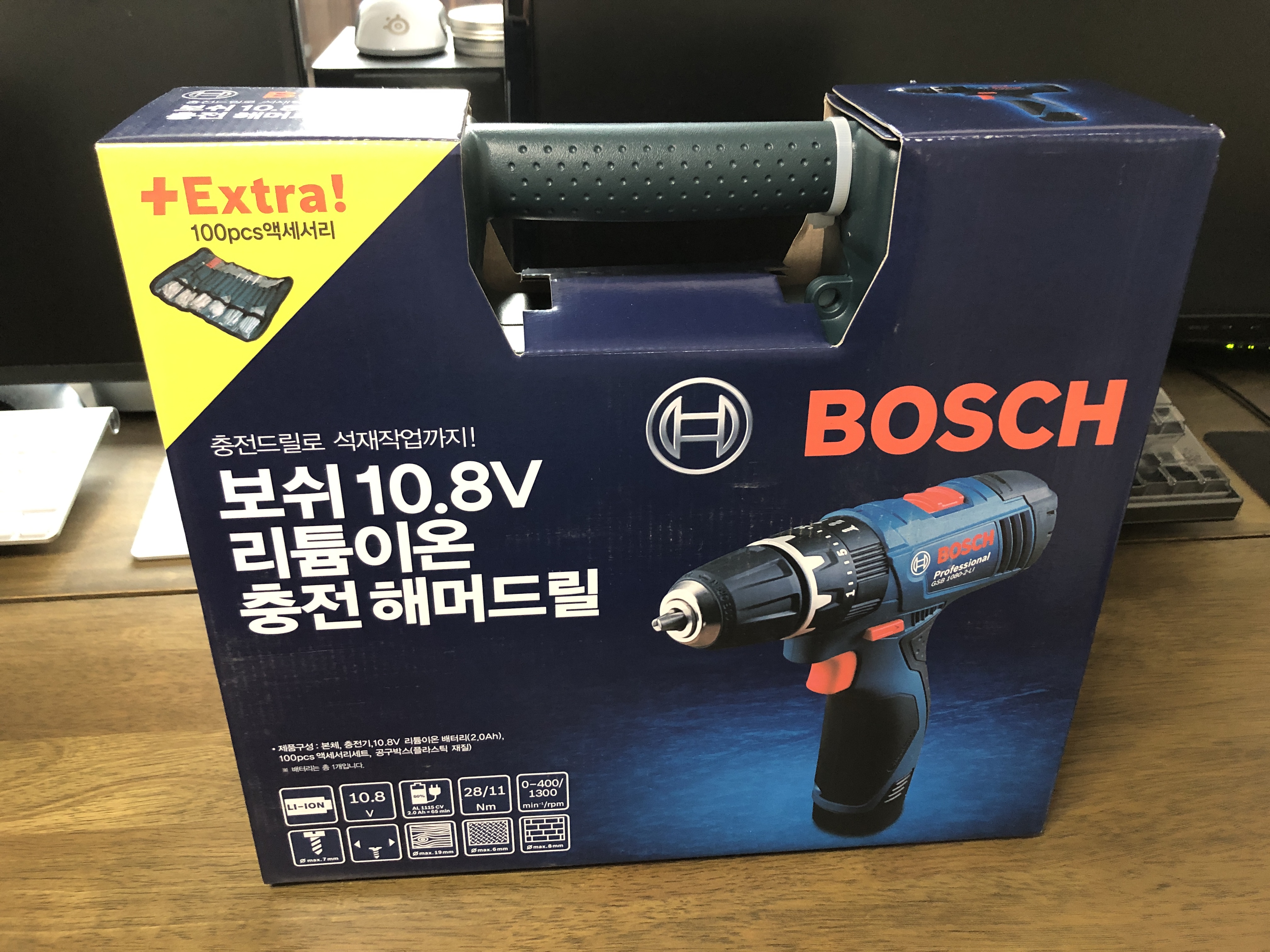 이것이 바로 BOSCH 보쉬 10.8V 리튬이온 충전 해머드릴입니다. 100pcs 액세서리까지 포함.