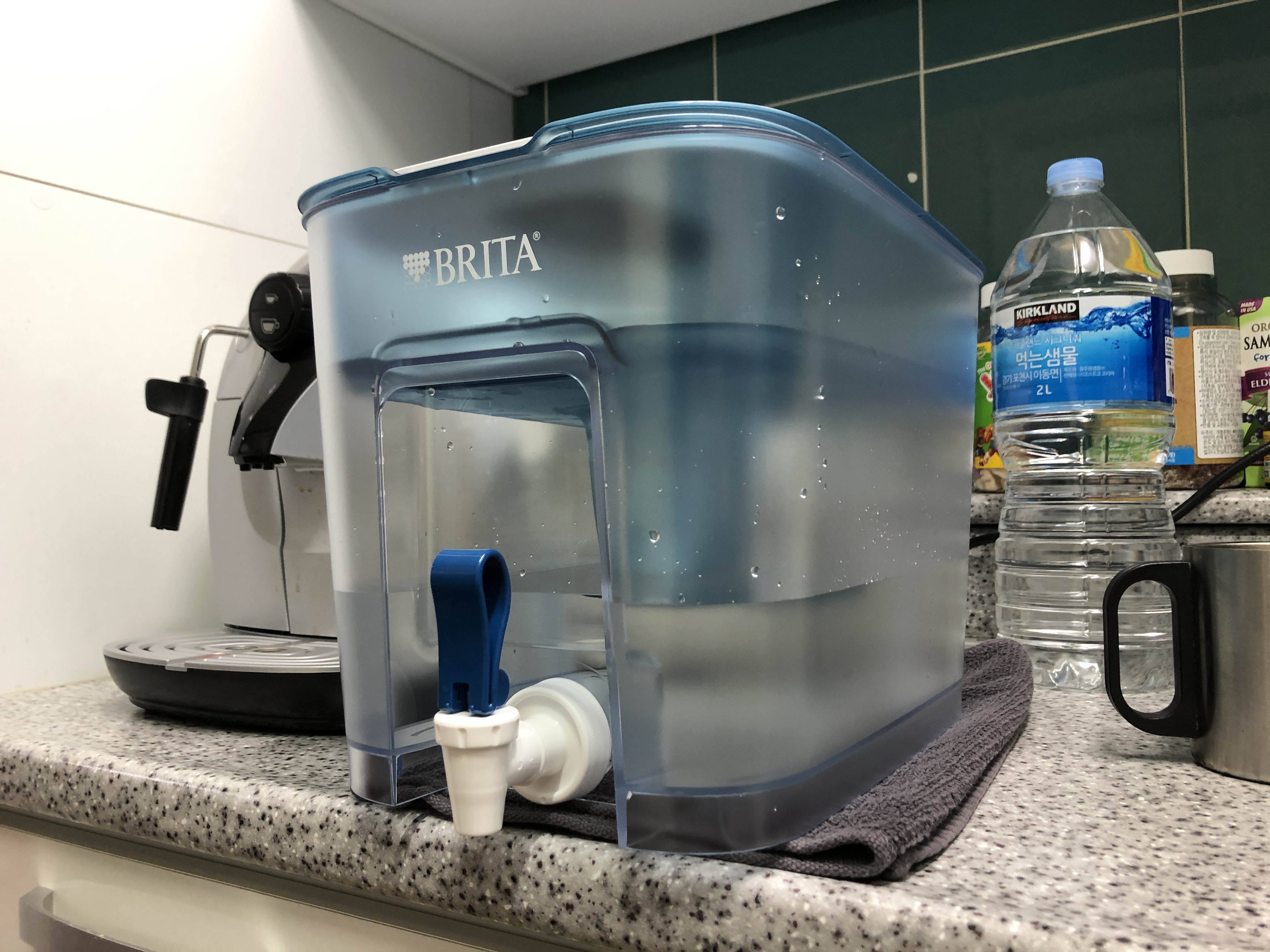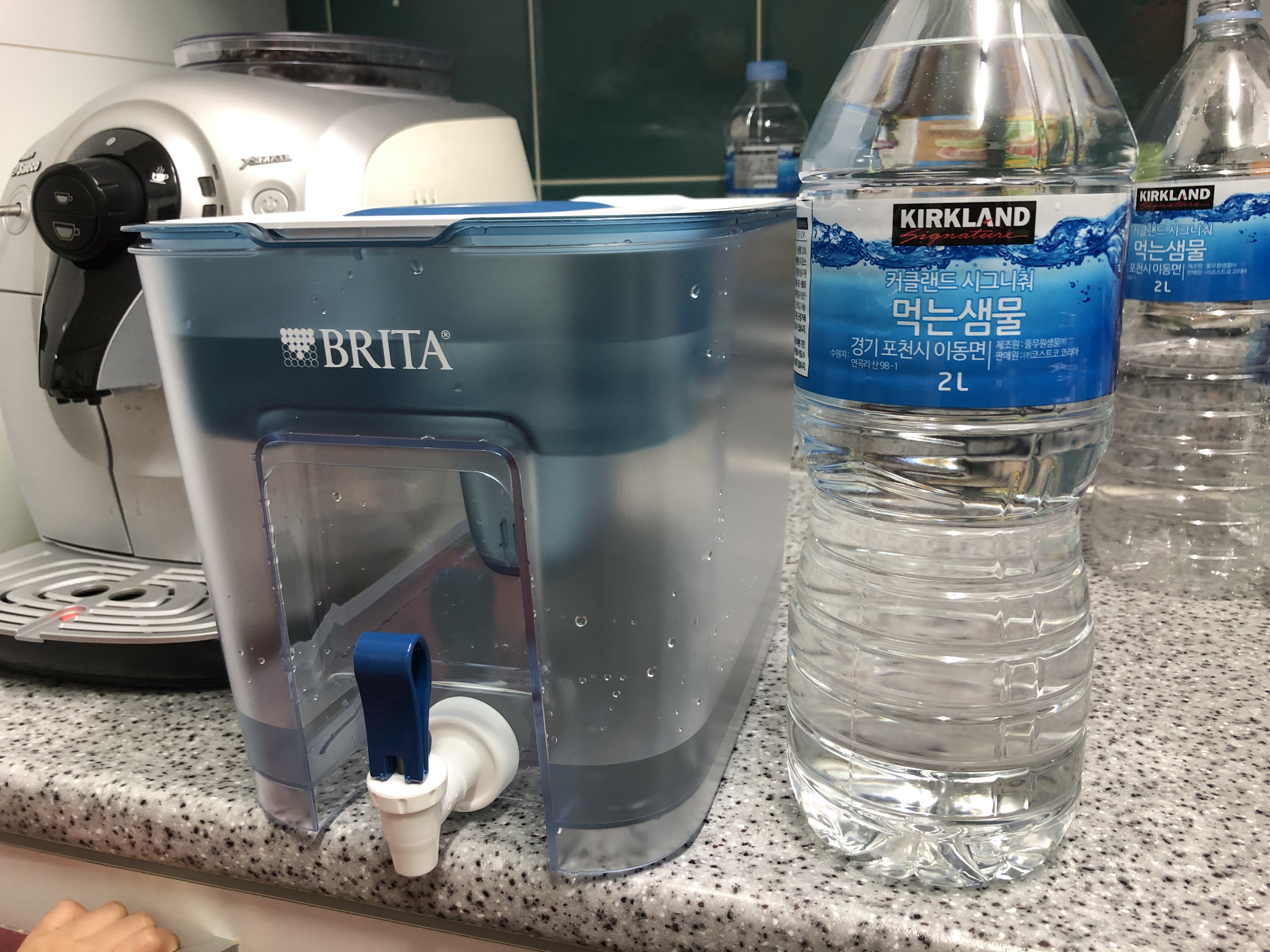 렌탈 정수기의 비위생적인 모습을 확인한 후 코스트코에서 생수를 사서 마셨습니다. 2리터 커클랜드 생수 6통이 1990원으로 착한 가격이죠. 근데 일주일에 한번정도 생수를 사다 나르는 것이 여간 번거로운 일이 아니네요. 엎친데 덮친격으로 아파트 엘리베이터 공사가 있다고 합니다. 그래서 정수기 구매를 고민하고 있는데 코스트코에서 놀라운(?!) 제품을 발견했네요. BRITA 브리타 플로우 정수용기 8.2L라는 제품입니다. 주전자처럼 손으로 잡아 바로 따를 수 있는 브리타 정수기는 예전에도 봤는데, 이렇게 크고 수도꼭지로 물을 따라 마실 수 있는 제품은 처음입니다. 주전자 방식이 관리하기가 좀 더 쉽겠지만, 아직 아이들이 어려서 수도꼭지(급수 탭)가 있는 이 제품이 더 마음에 들었습니다. BRITA 브리타 플로우 정수용기 8.2L 가격은 59,900원.