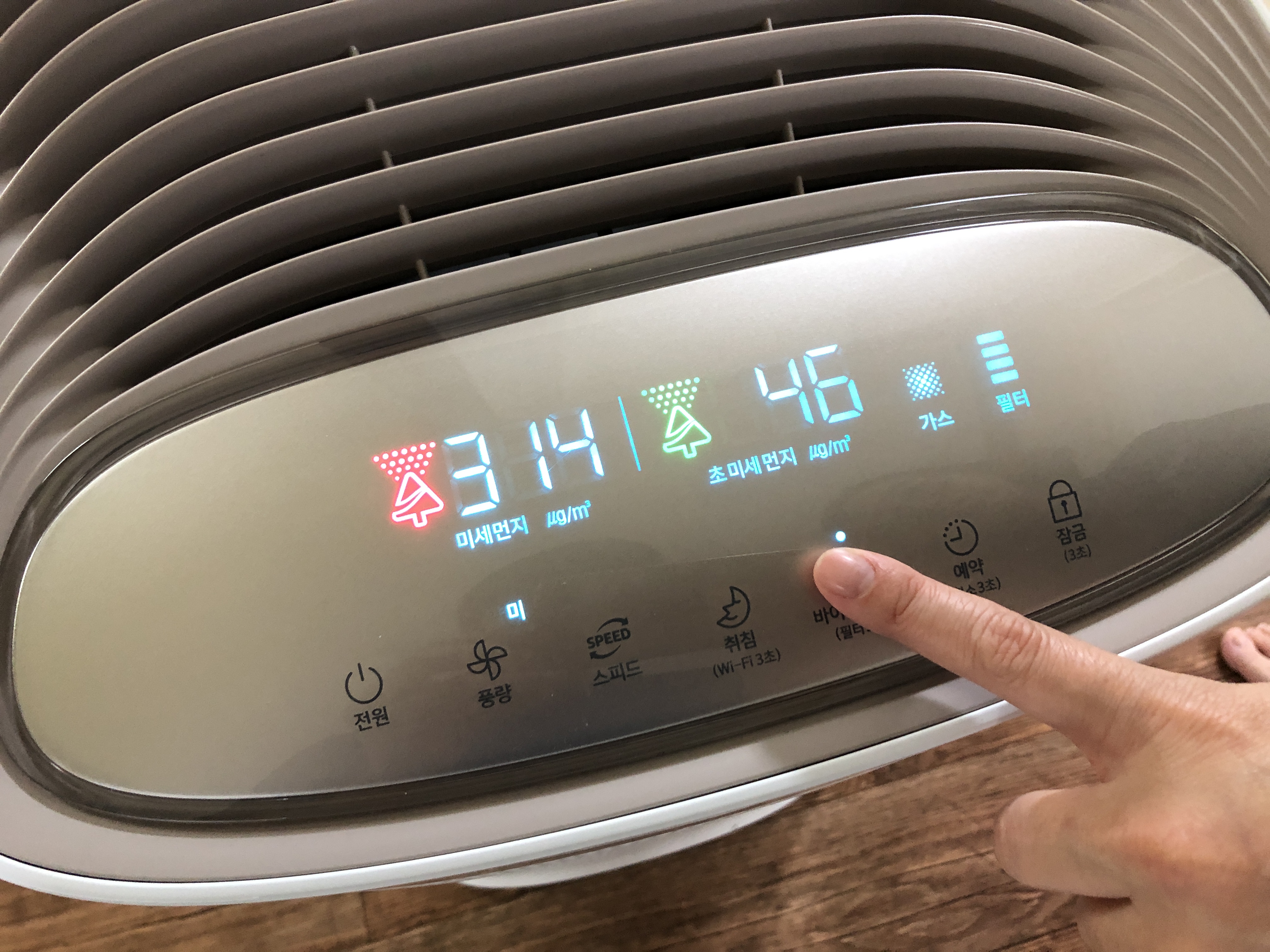 공기청정기 전원을 켜고 필터교체 버튼을 3초간 눌러줍니다.