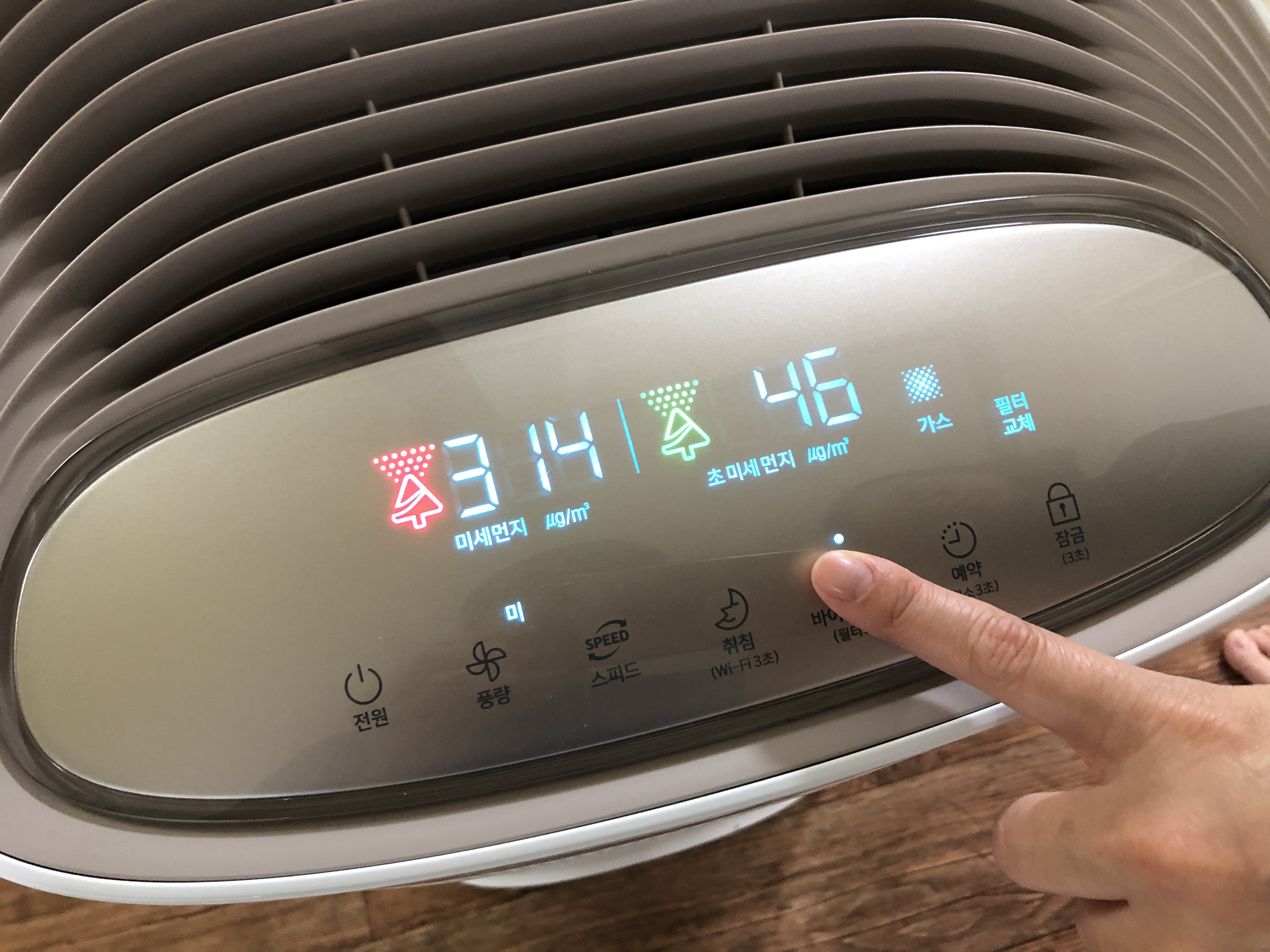 공기청정기 전원을 켜고 필터교체 버튼을 3초간 눌러줍니다.