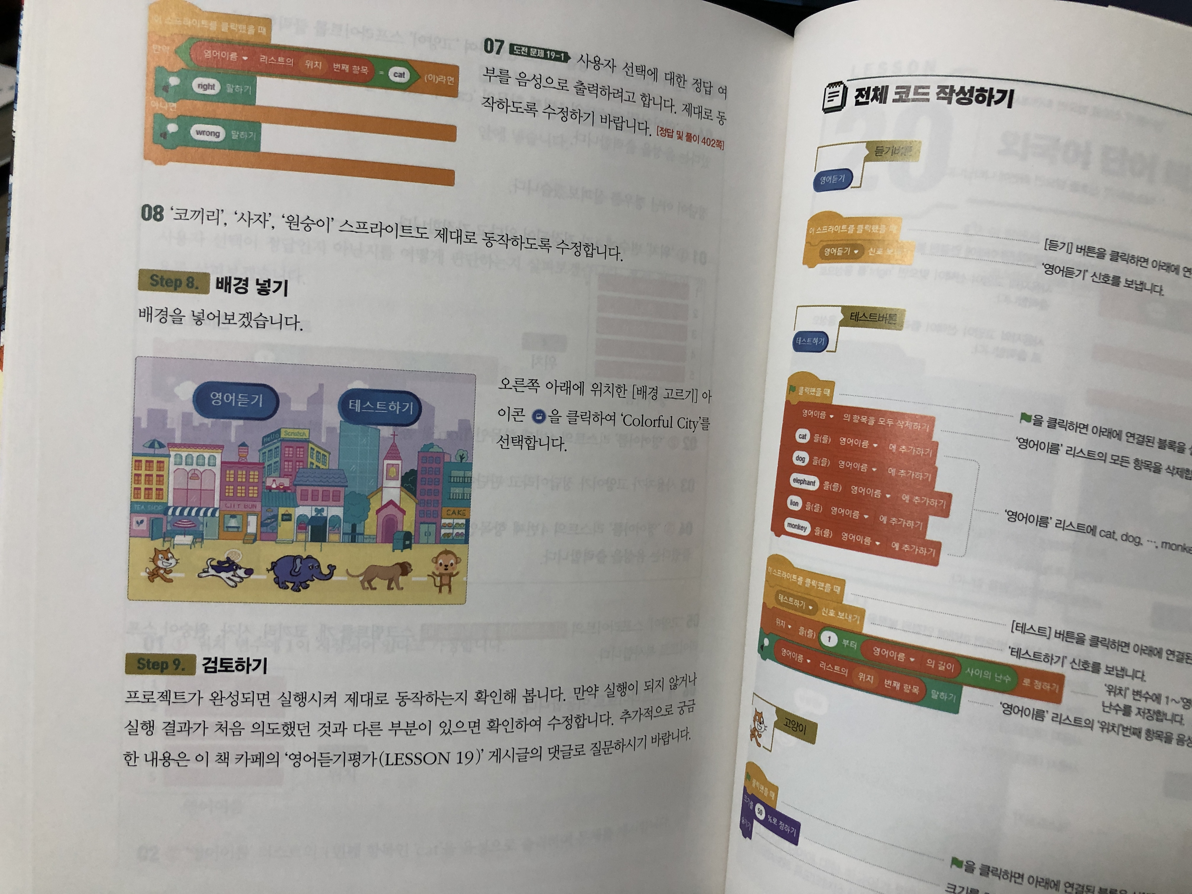 ‘1등 코딩, 스크래치 3.0’는 모든 내용을 하나하나 따라할 수 있게 그림(사진)으로 모든 과정을 보여줍니다. 따라하면서 조건문, 반복문, 변수와 같은 프로그래밍 기초 지식을 자연스럽게 습득할 수 있습니다. 책을 보다보면 도전문제, 응용문제가 나오는데 아이들이 시간을 들여 직접 풀어본다면 코딩 능력 향상에 큰 도움이 되지 않을까 싶네요. 수학이든 코딩이든 장시간 고민하는 것 자체가 실력향상(사고능력향상)이라 생각합니다.