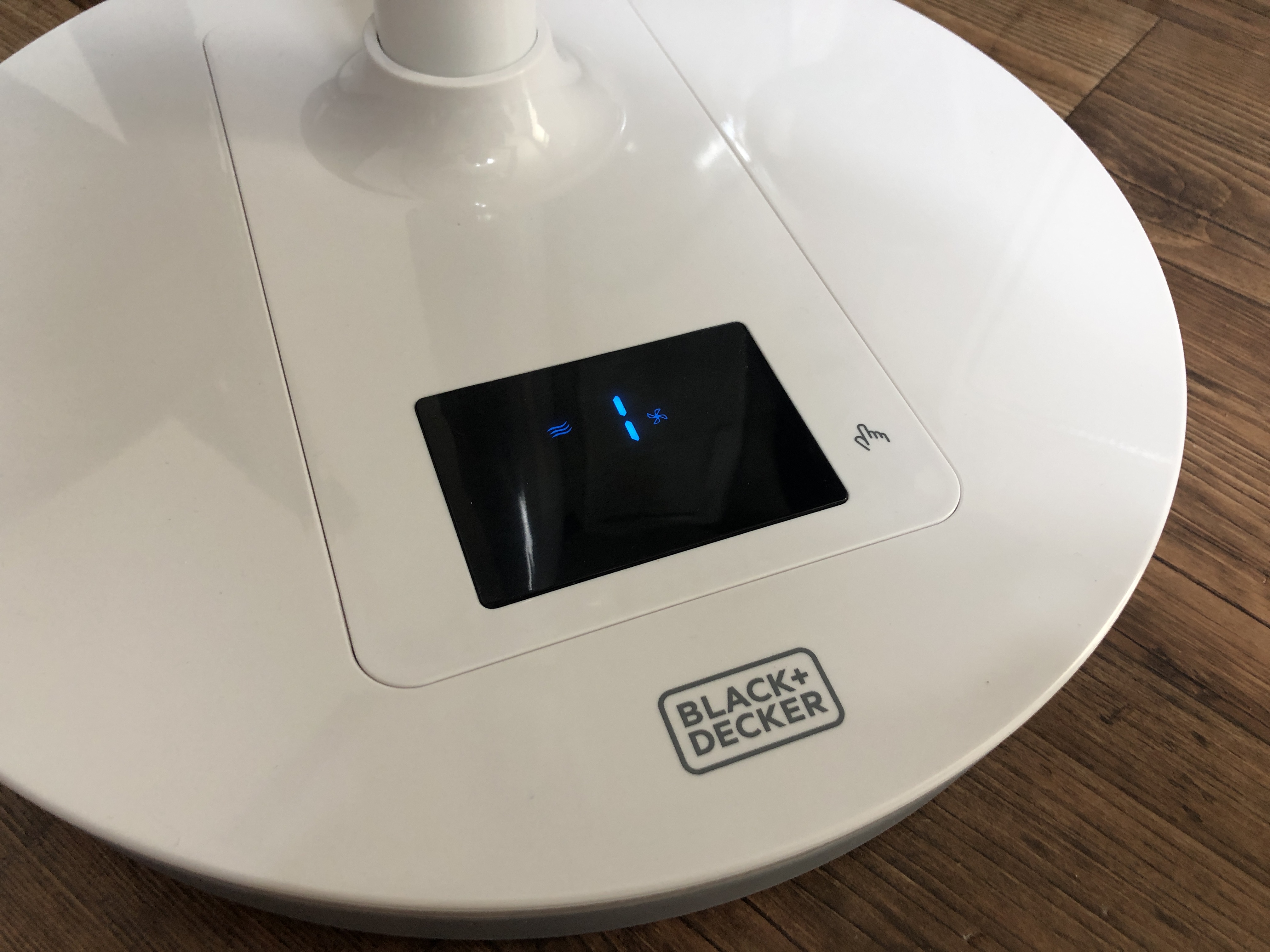 손가락 모양을 터치하면 본체에 있는 LED가 꺼집니다. 가끔 선풍기를 약하게 틀고 있으면 소음이 거의 없어서 멀리서 이게 켜진 건지 꺼진 건지 알 수가 없네요. 이것도 단점이라면 단점. 터치 LED로 선풍기를 끄기 위해서는 우선 손가락 모양을 터치해 LED를 켠 후 마이너스(-) 버튼을 계속 눌러 바람세기를 0으로 해야 합니다. 그냥 리모컨 쓰는 게 좋겠네요.