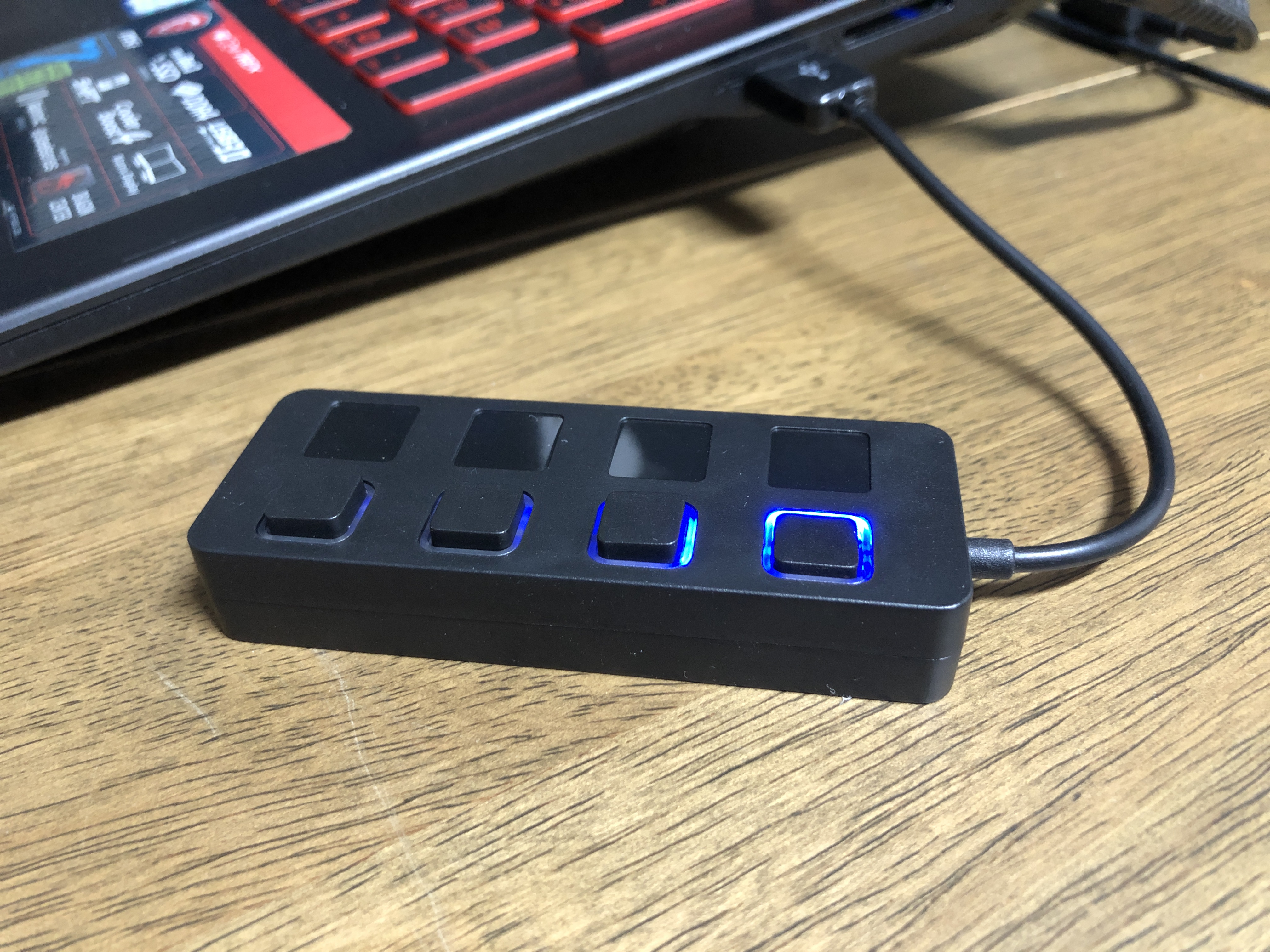 USB 허브를 노트북 컴퓨터에 연결한 모습. 켜진 부분에 LED가 들어오는 것을 볼 수 있습니다.